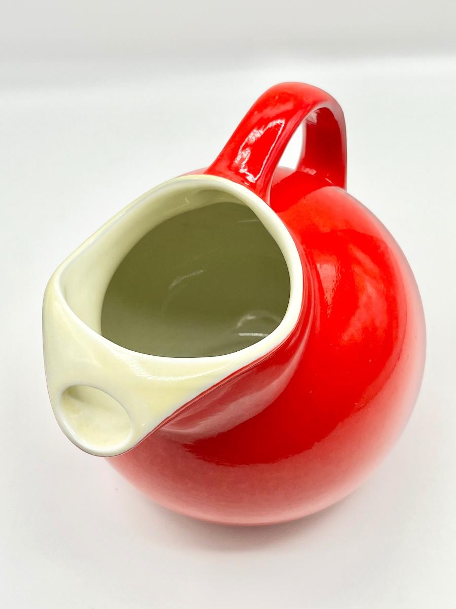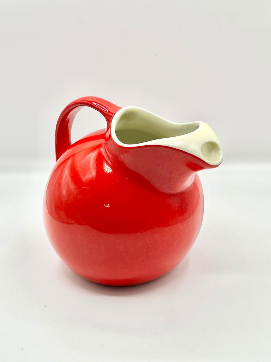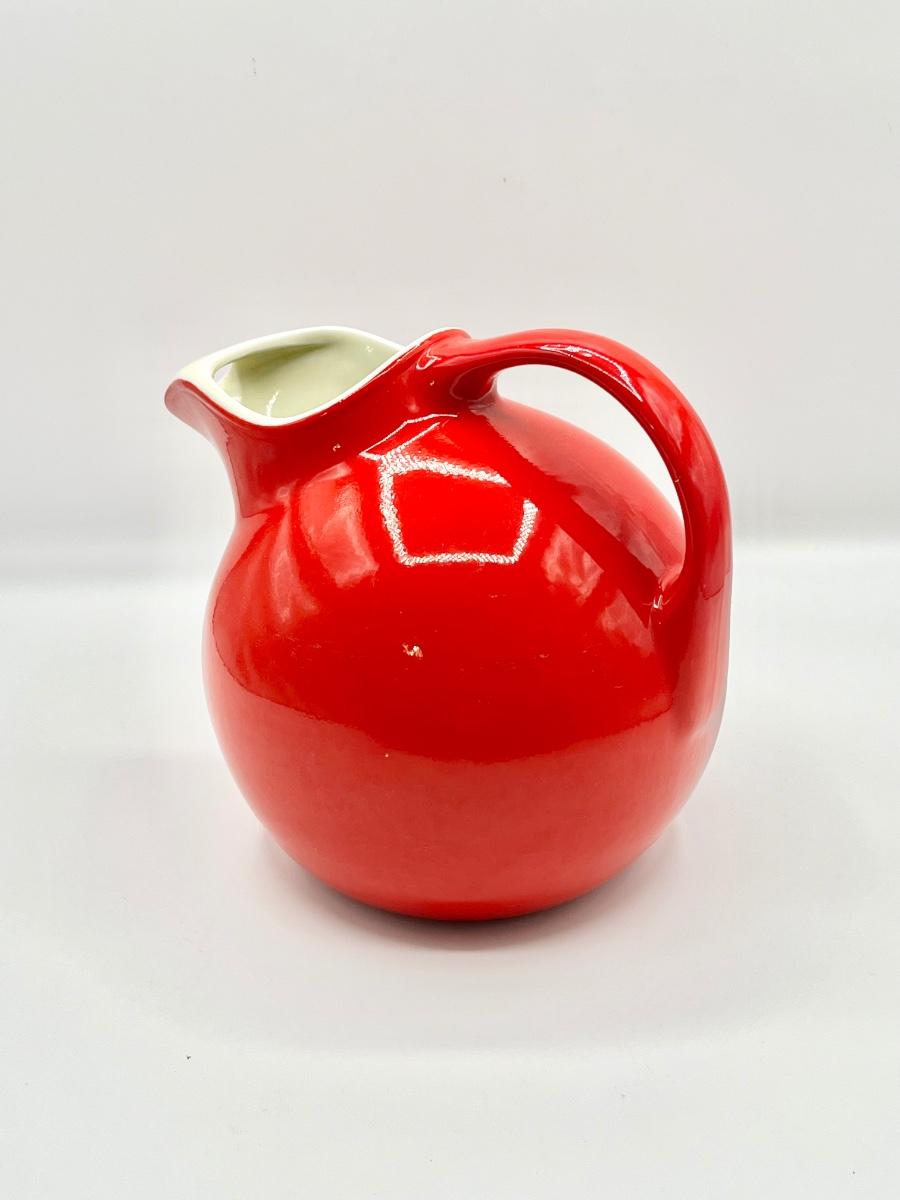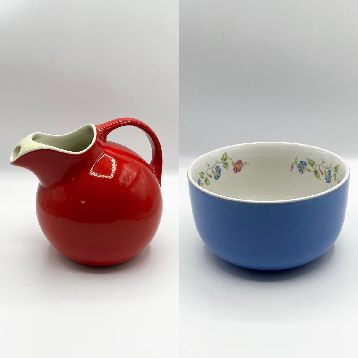 Blue bowl 4” H x 7.5” round ~ red pitcher 7” H x 8.5” round ~ no cracks, no chips