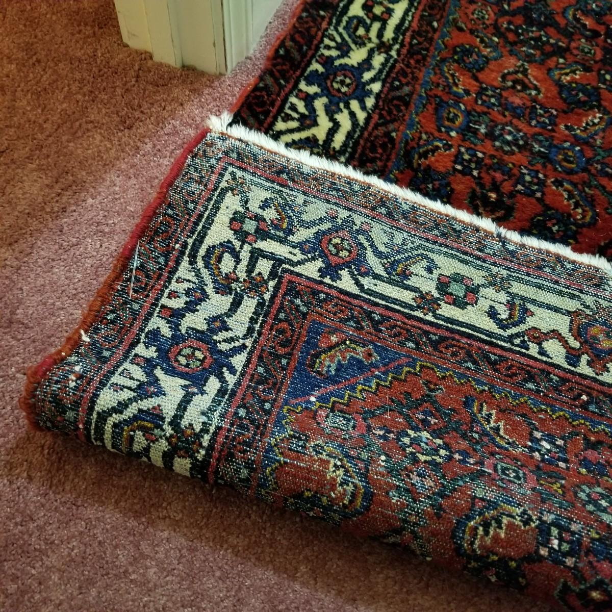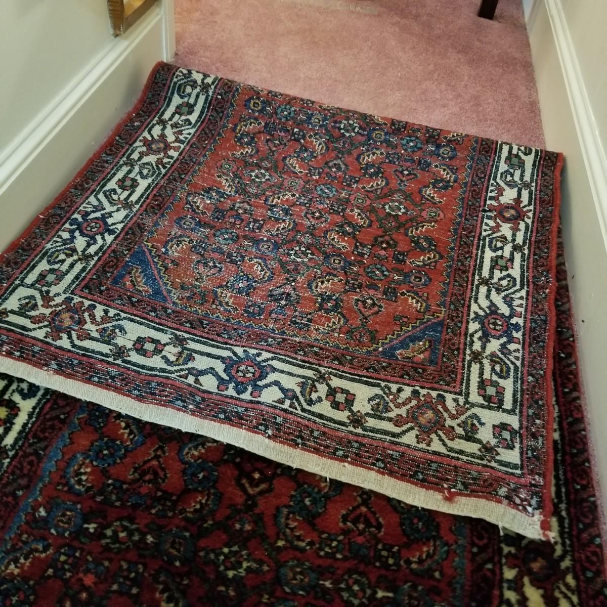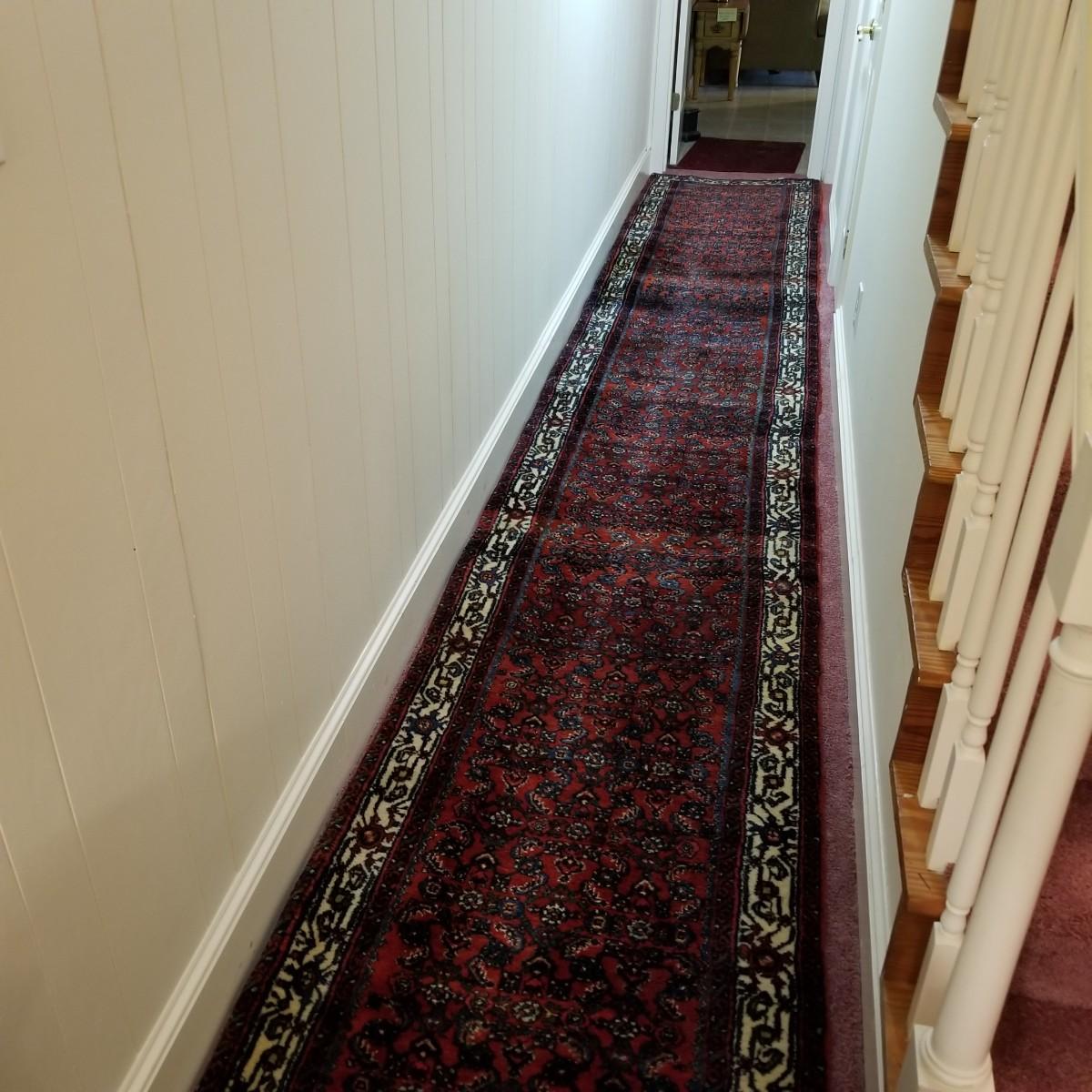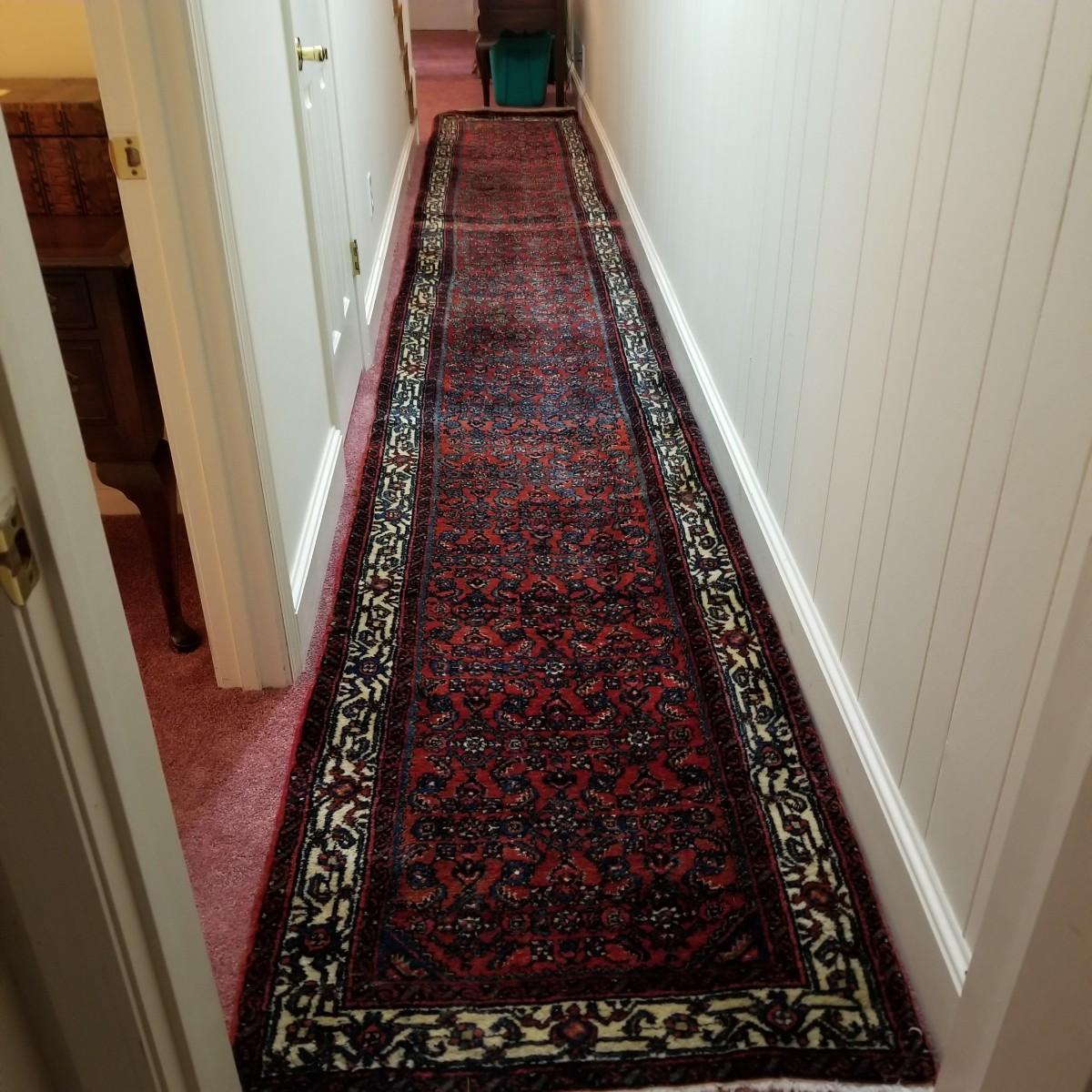 A long runner for a hall or entryway. Deep reds and darker blues with a lighter border pattern. This piece measures 240" x 33" (20' x 2.75'). Bound edges. Item shows normal wear and is in good condition. Short fringe on ends. Runner may be wool but no markings. See photos for details. Local pickup only.