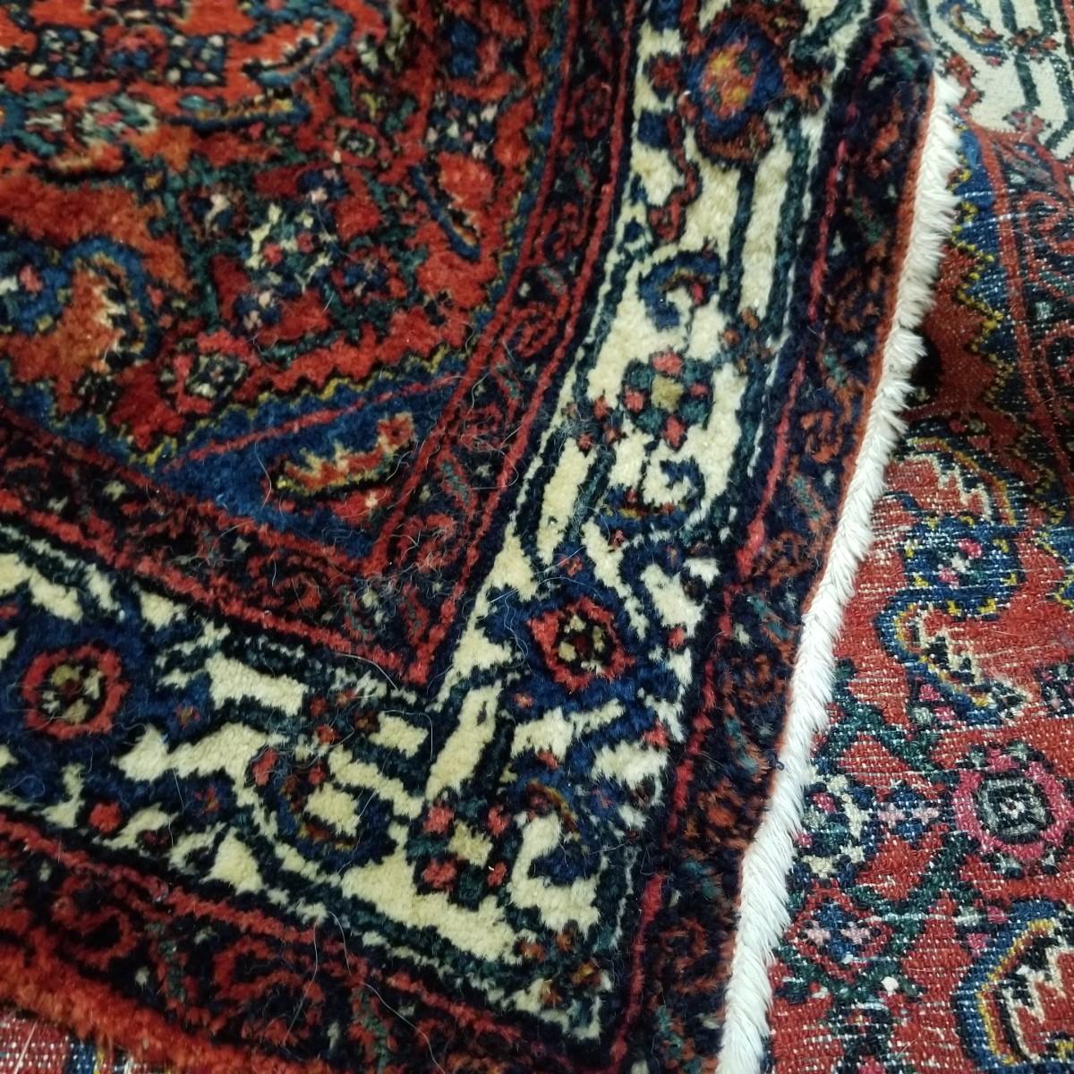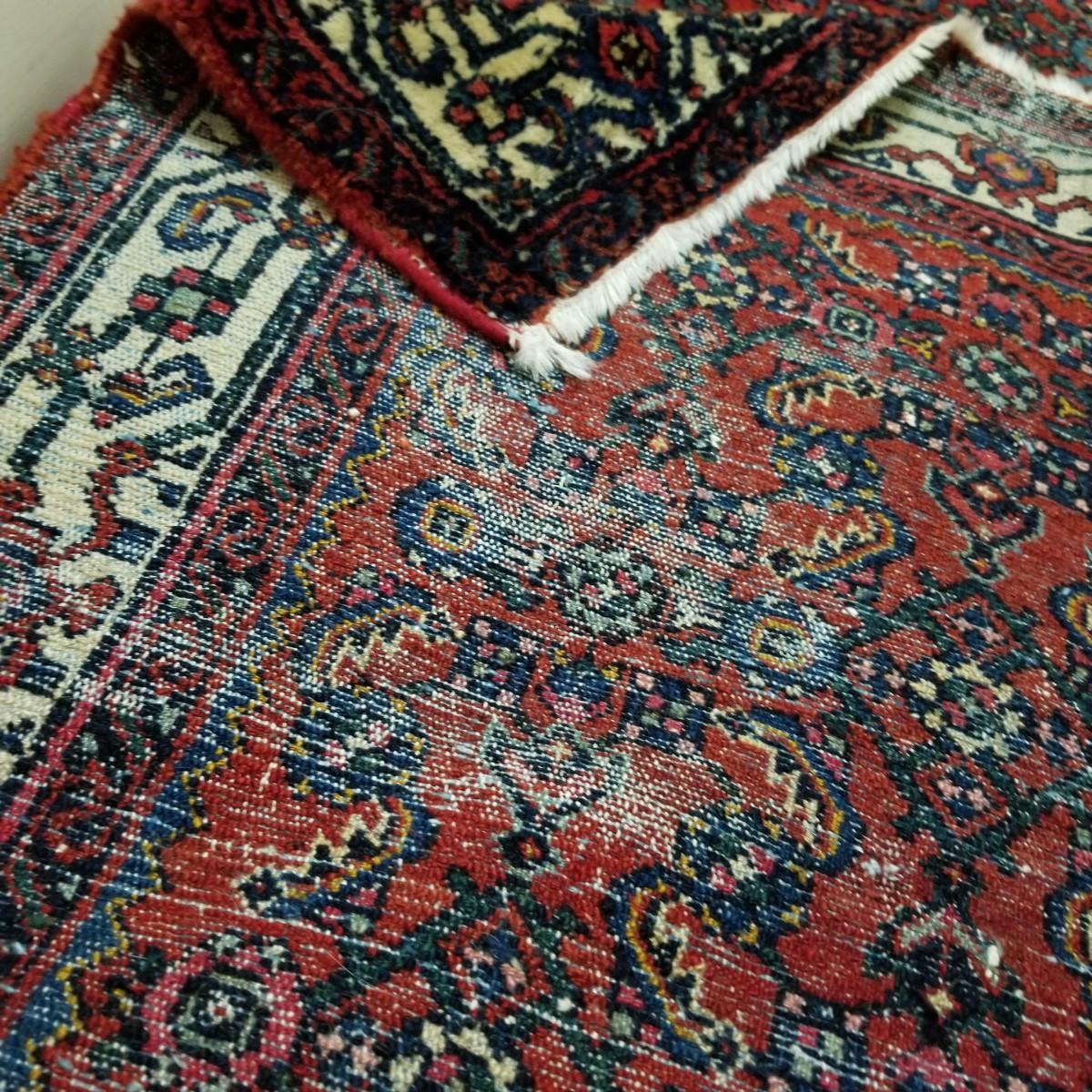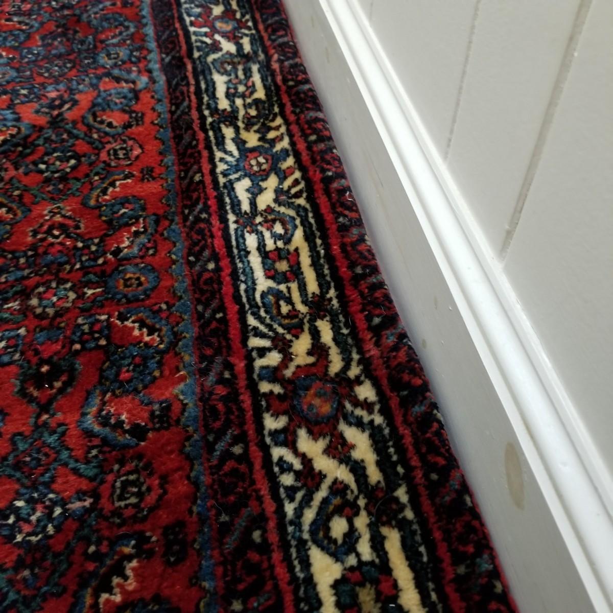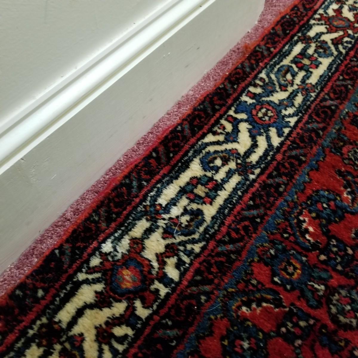 A long runner for a hall or entryway. Deep reds and darker blues with a lighter border pattern. This piece measures 240" x 33" (20' x 2.75'). Bound edges. Item shows normal wear and is in good condition. Short fringe on ends. Runner may be wool but no markings. See photos for details. Local pickup only.