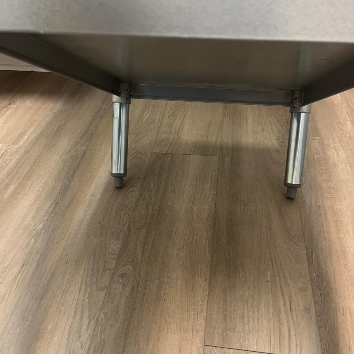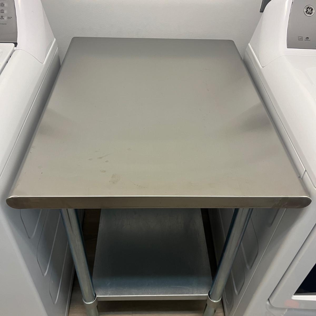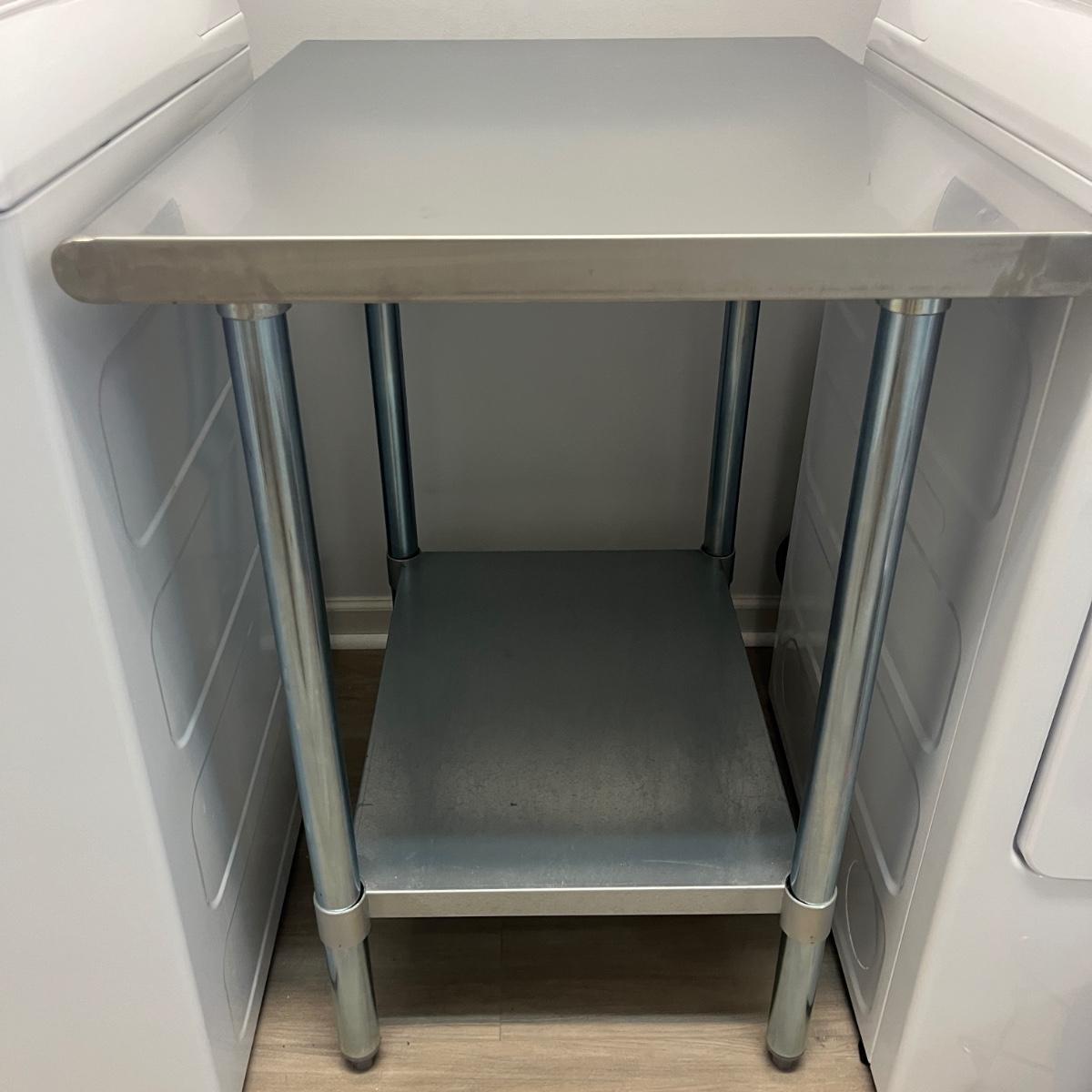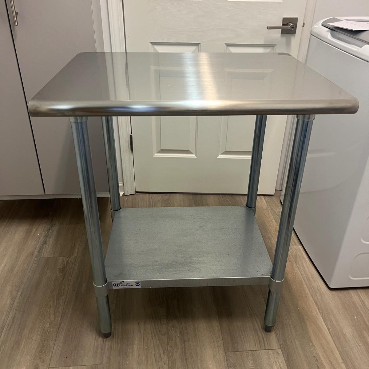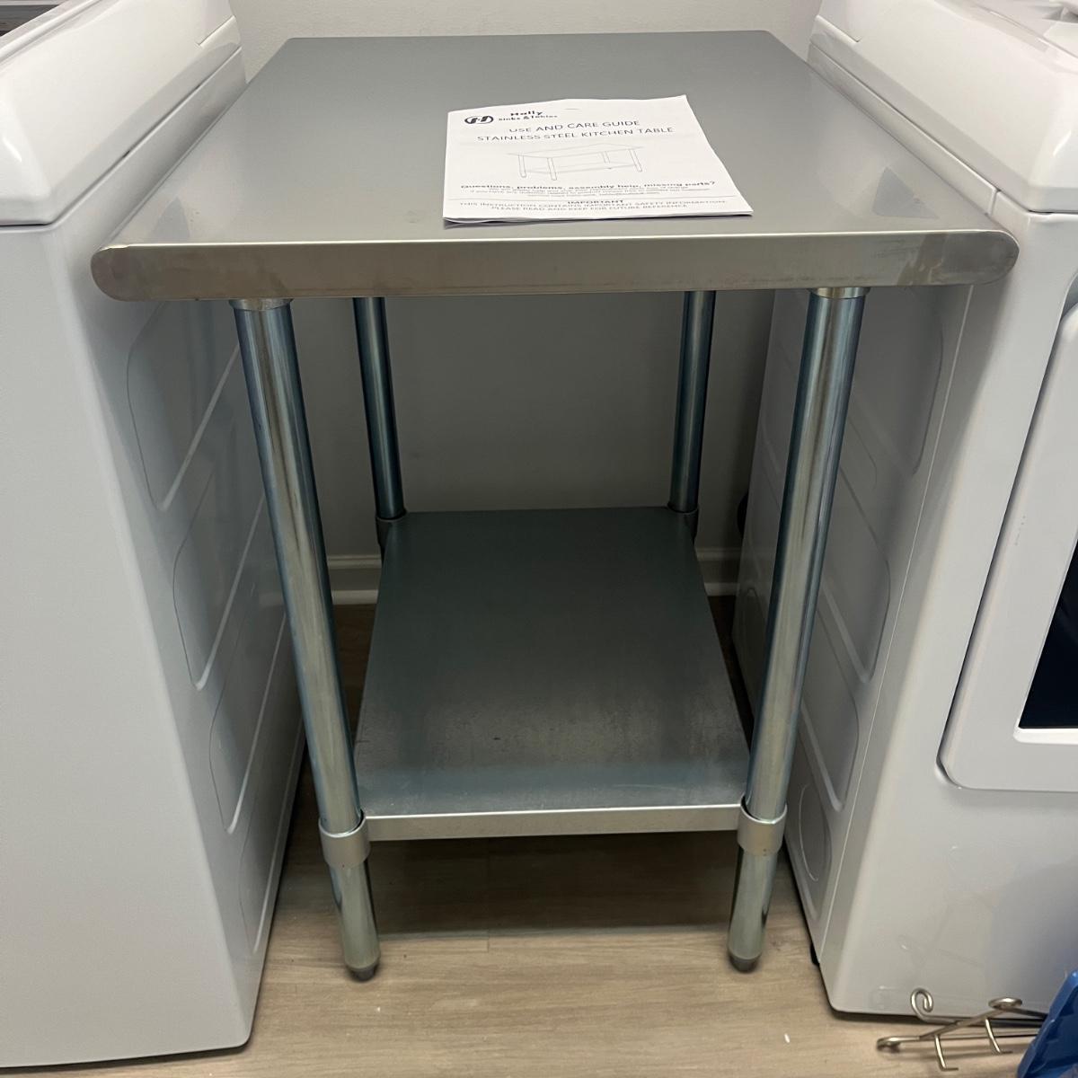 Lot includes a Hally stainless steel kitchen table with one shelf underneath. Table measures 30” x 24” x 35”H.