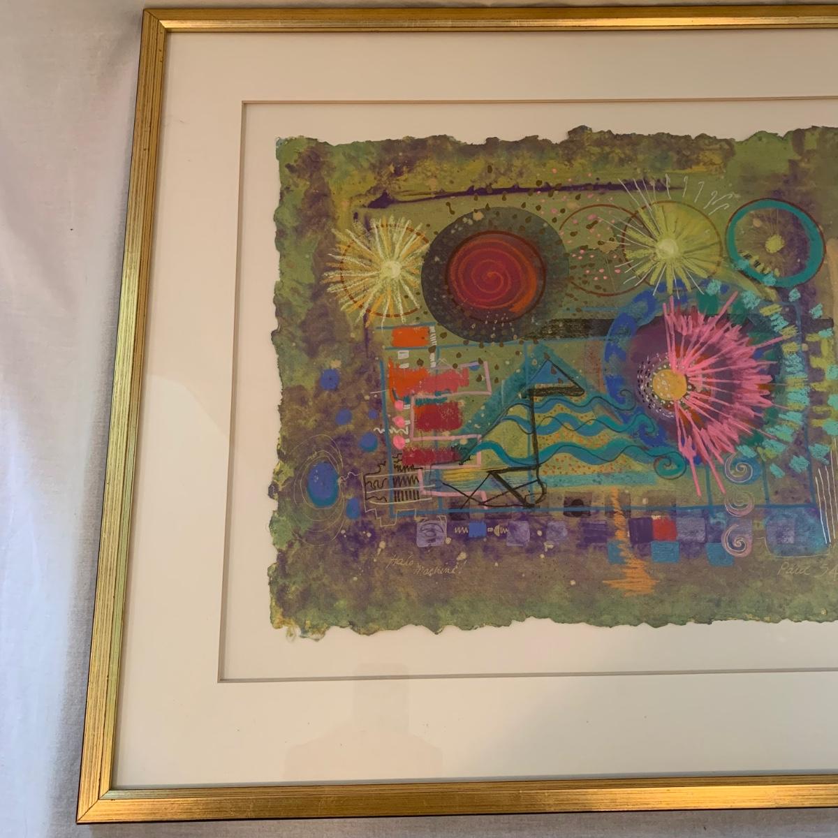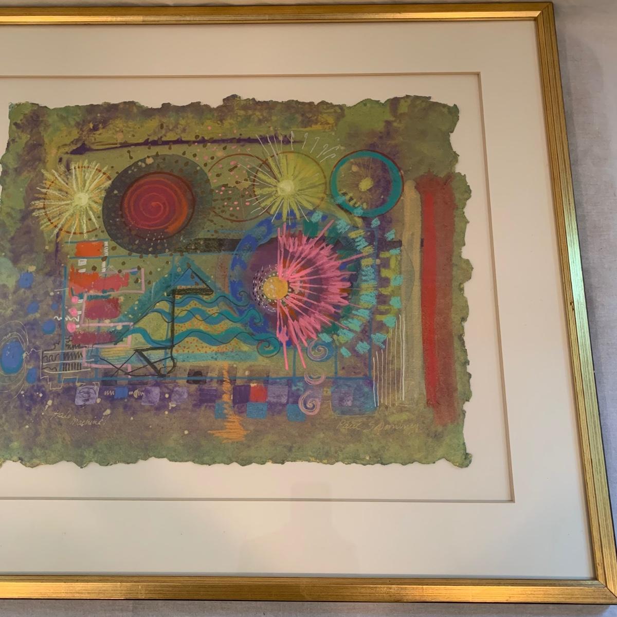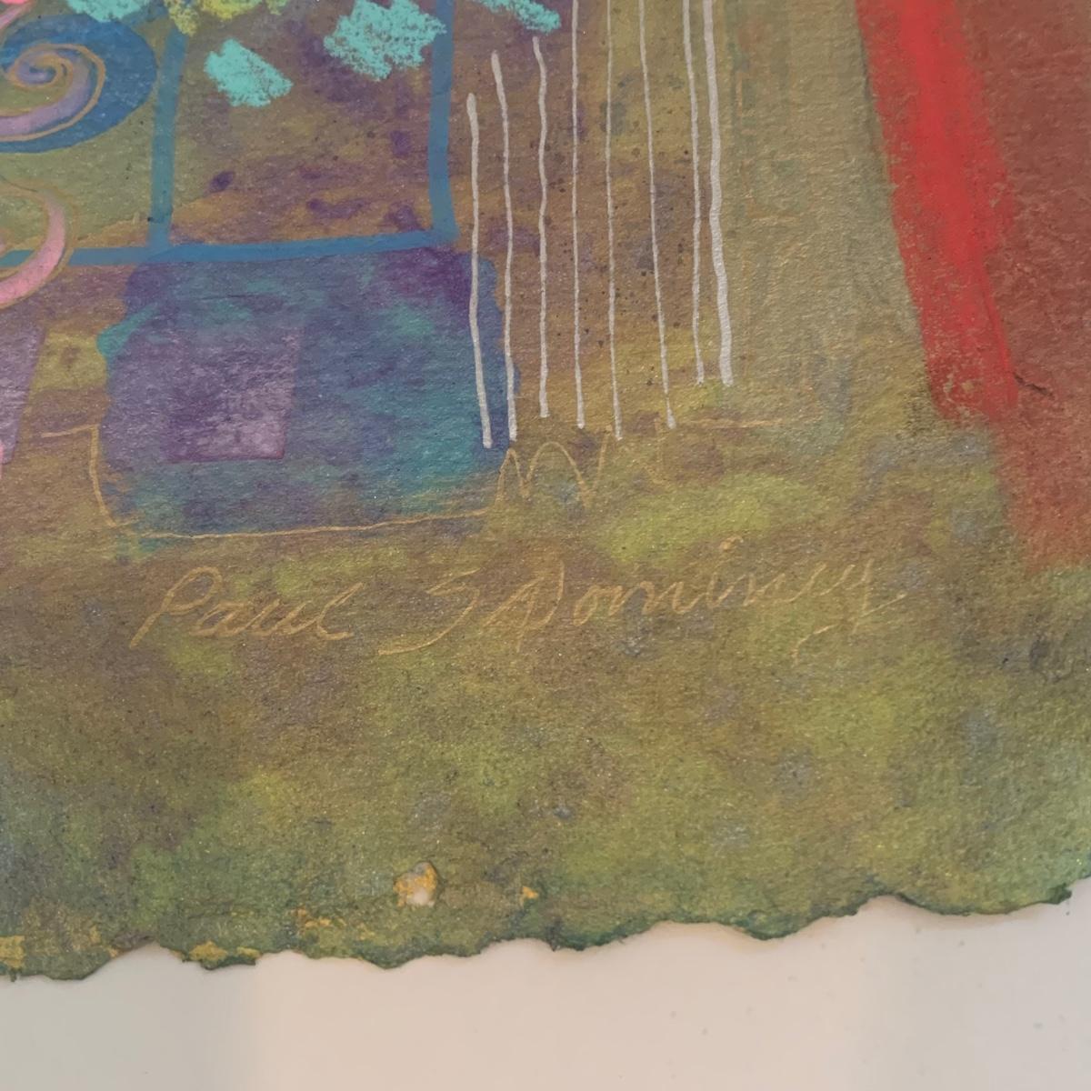 “Halo Machine” by Paul Dominey framed and behind glass. Piece is signed by artist and features mixed media on paper. Frame appears to be both wood and plastic. Please see photos for more details. This piece measures approximately 30" x 26".