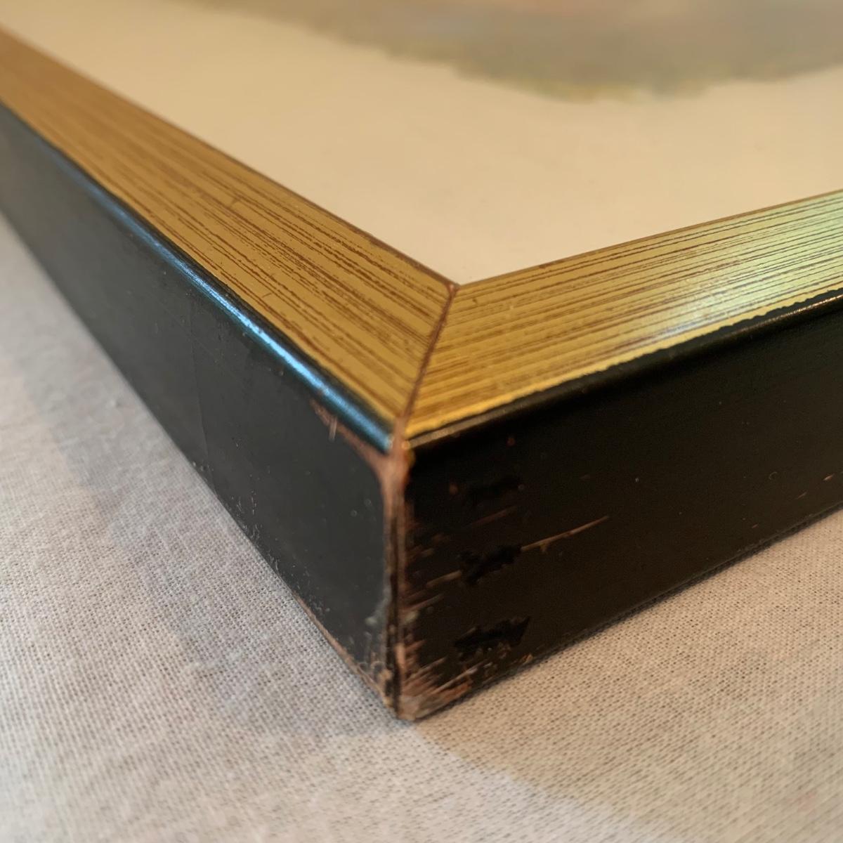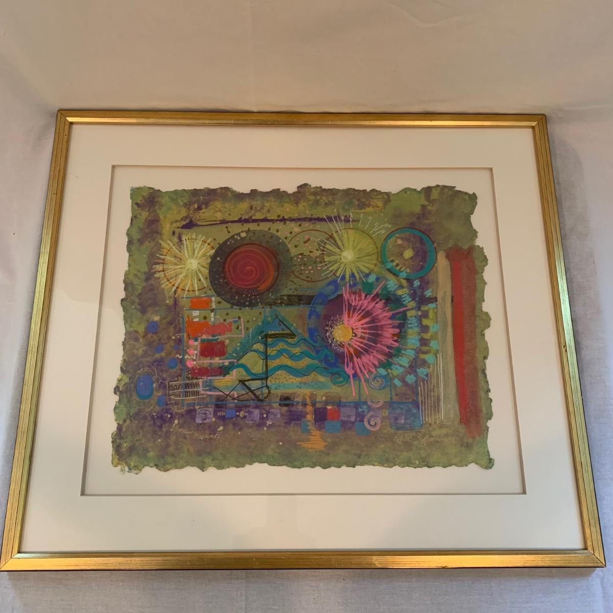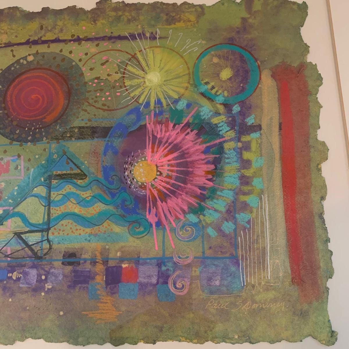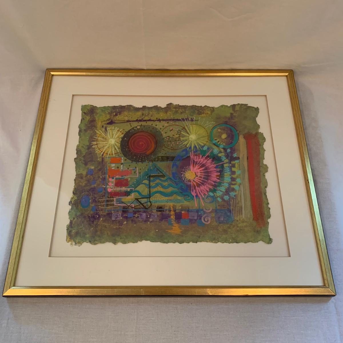 “Halo Machine” by Paul Dominey framed and behind glass. Piece is signed by artist and features mixed media on paper. Frame appears to be both wood and plastic. Please see photos for more details. This piece measures approximately 30" x 26".