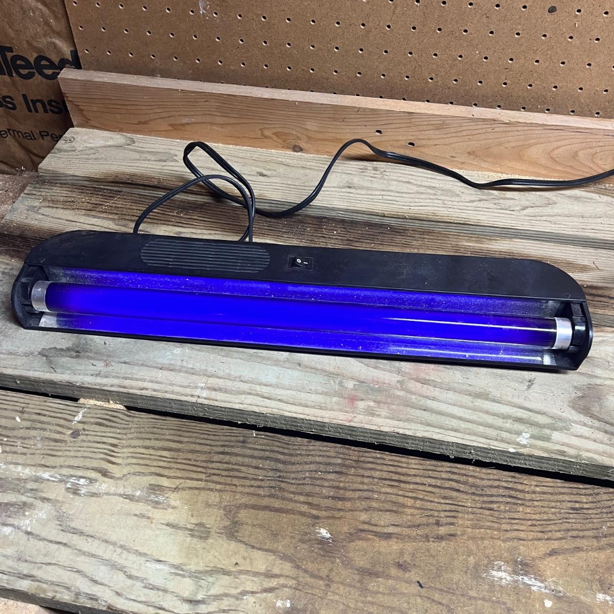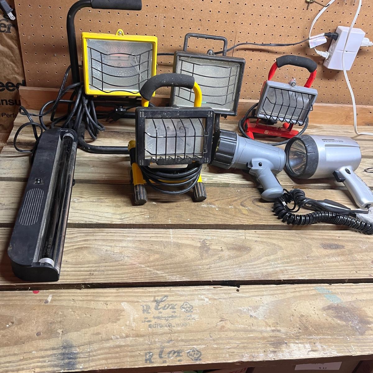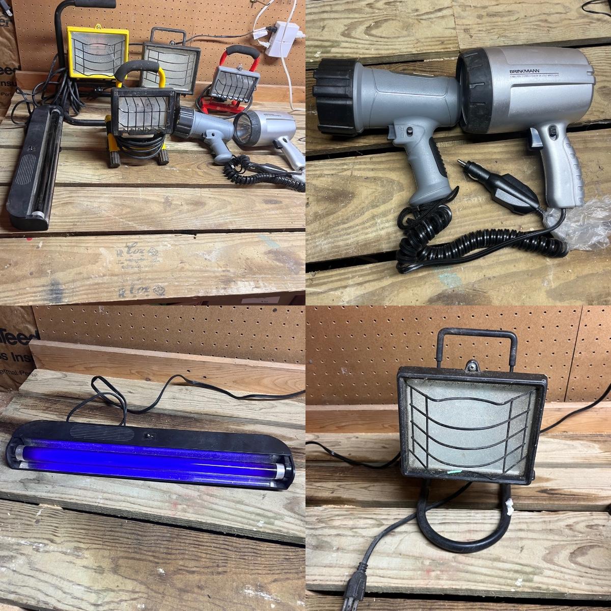 Lot includes four halogen work lights, two spotlights and a Fluorescent black light that measures 18” x 3” x 1.75”H. All lights powered except one halogen and one spotlight is 12v and was not tested.