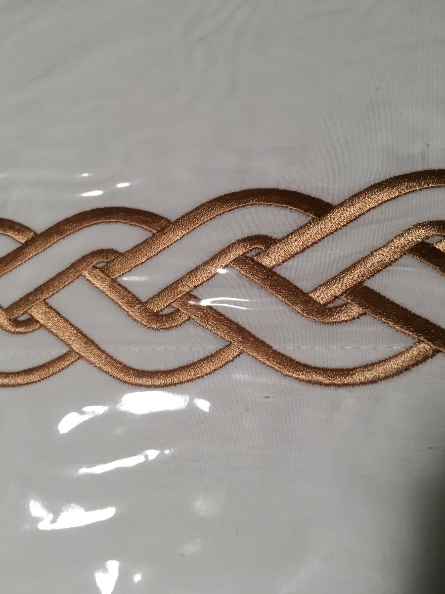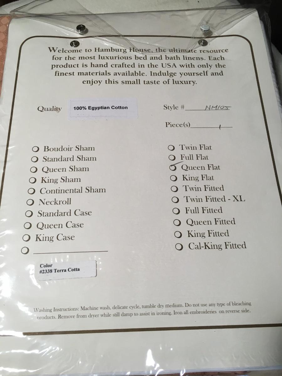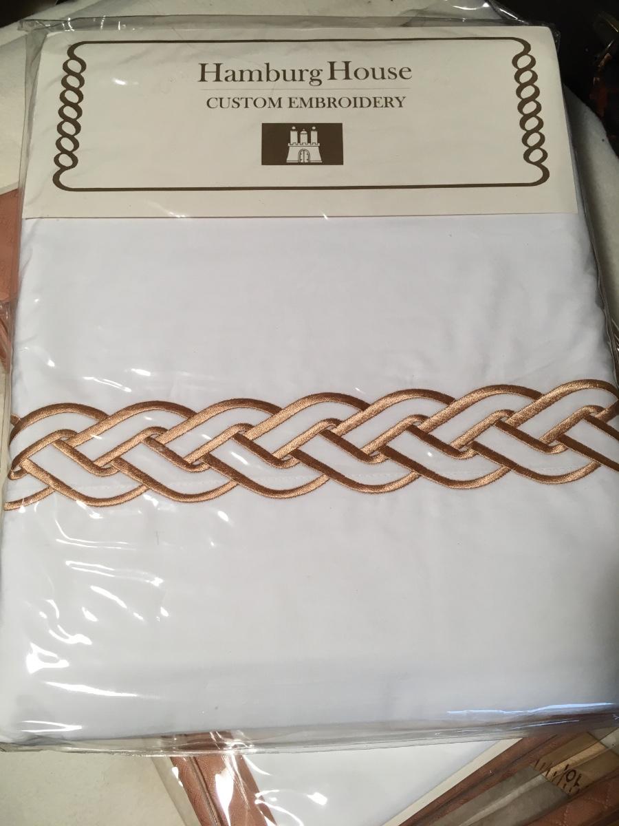 100% Egyptian cottton queen flat sheet with embroidered border. Handcrafted in the USA. New.