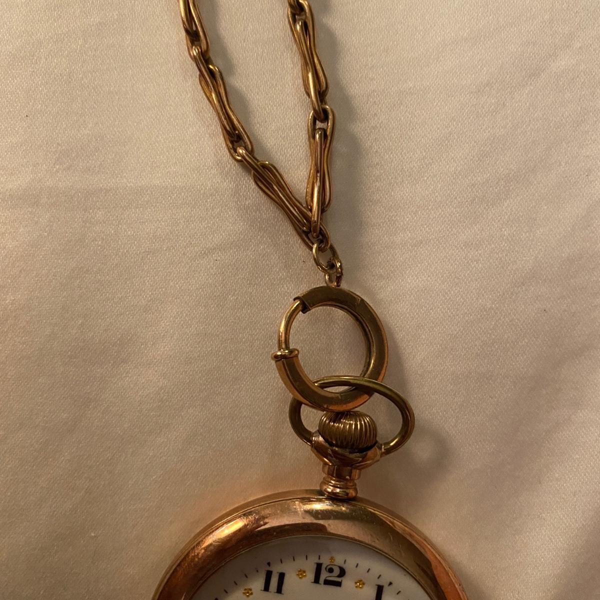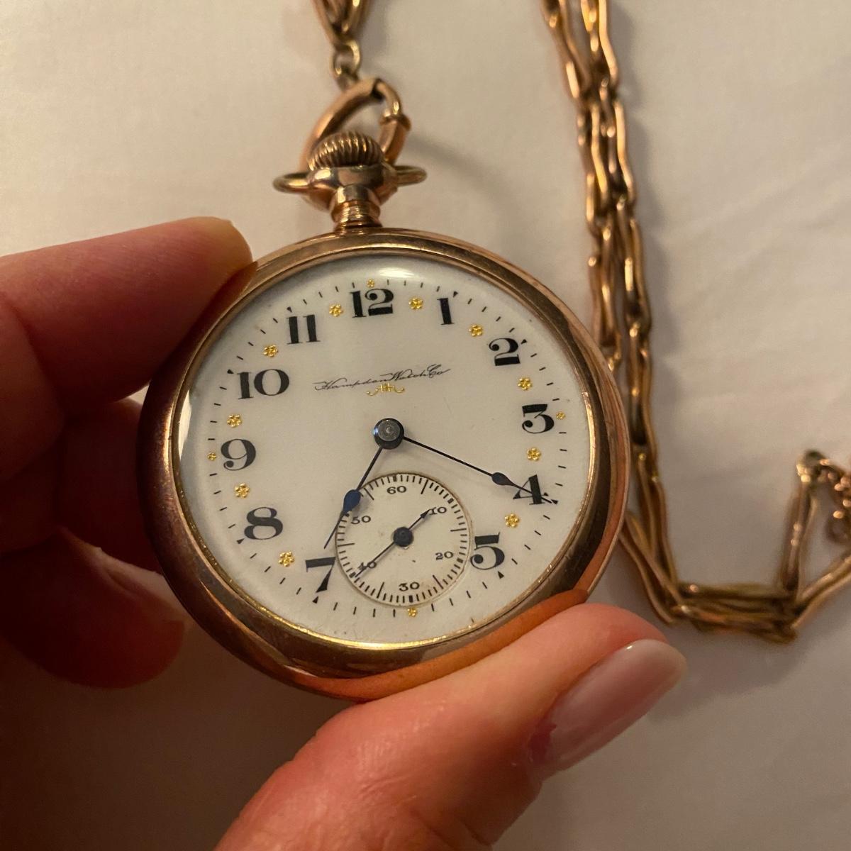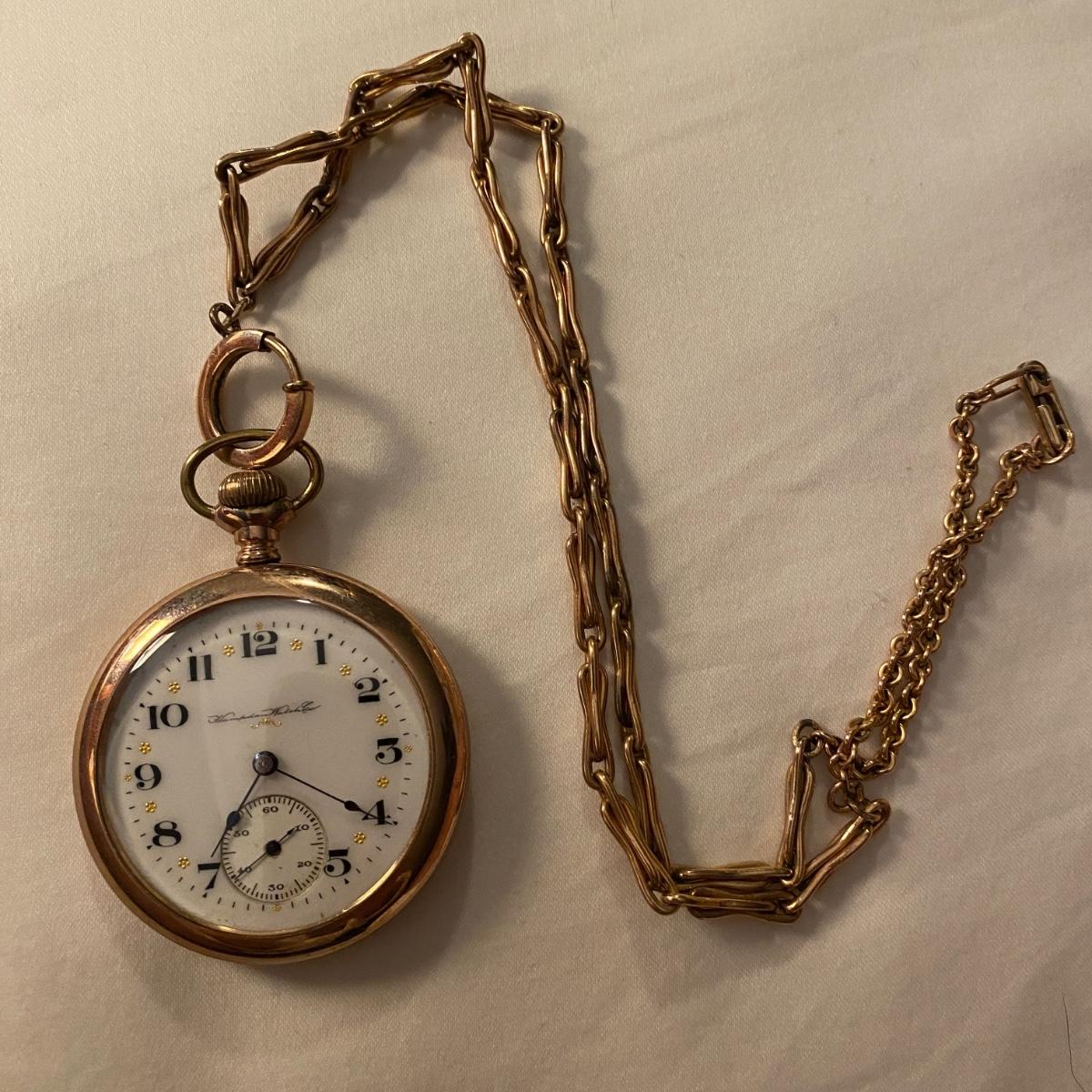 Gold pocket watch by Hampden Watch Co. Linked gold chain. See photos for marks and serial number. Appears to be gold colored. Shipping available.