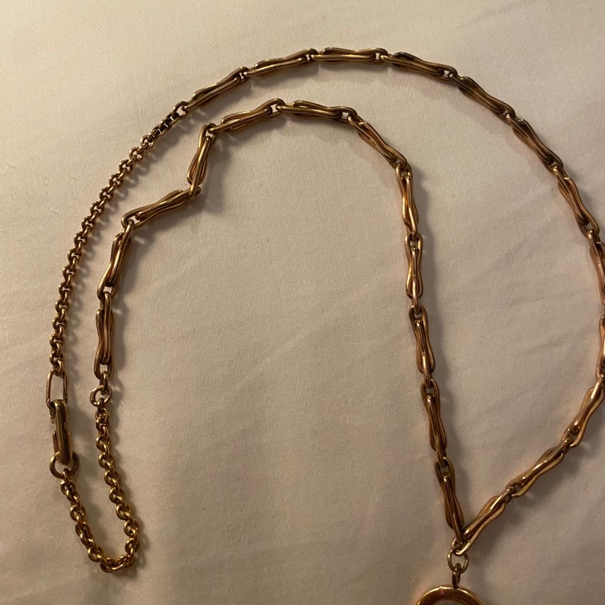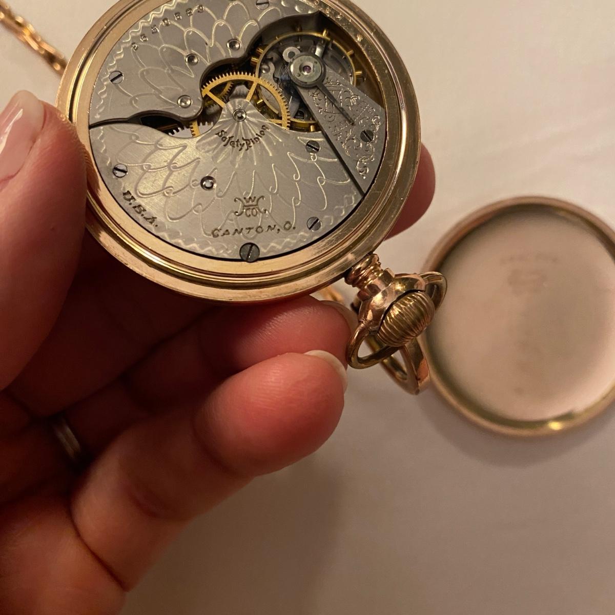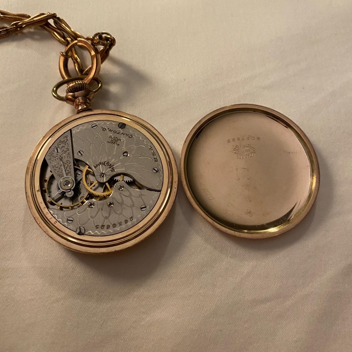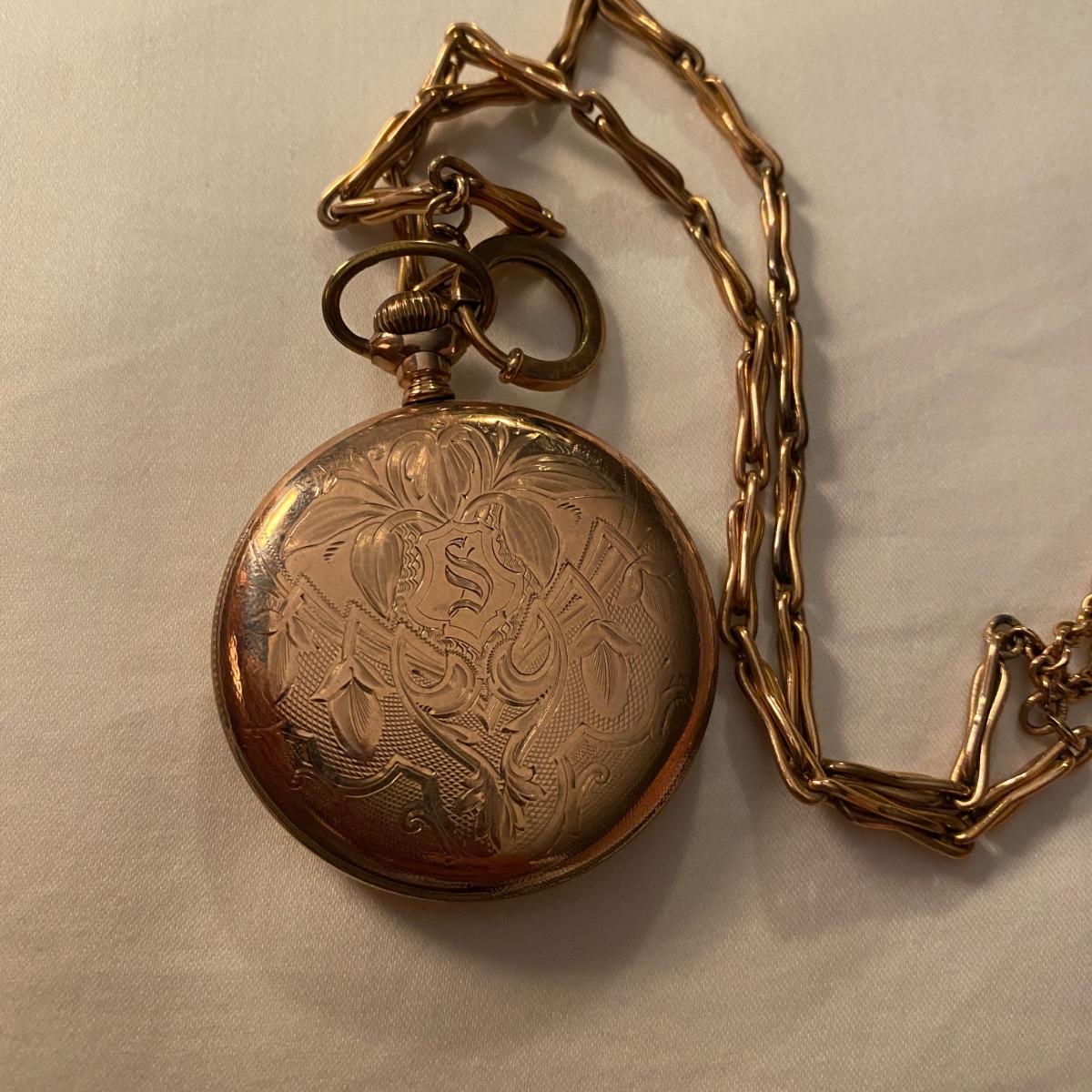 Gold pocket watch by Hampden Watch Co. Linked gold chain. See photos for marks and serial number. Appears to be gold colored. Shipping available.