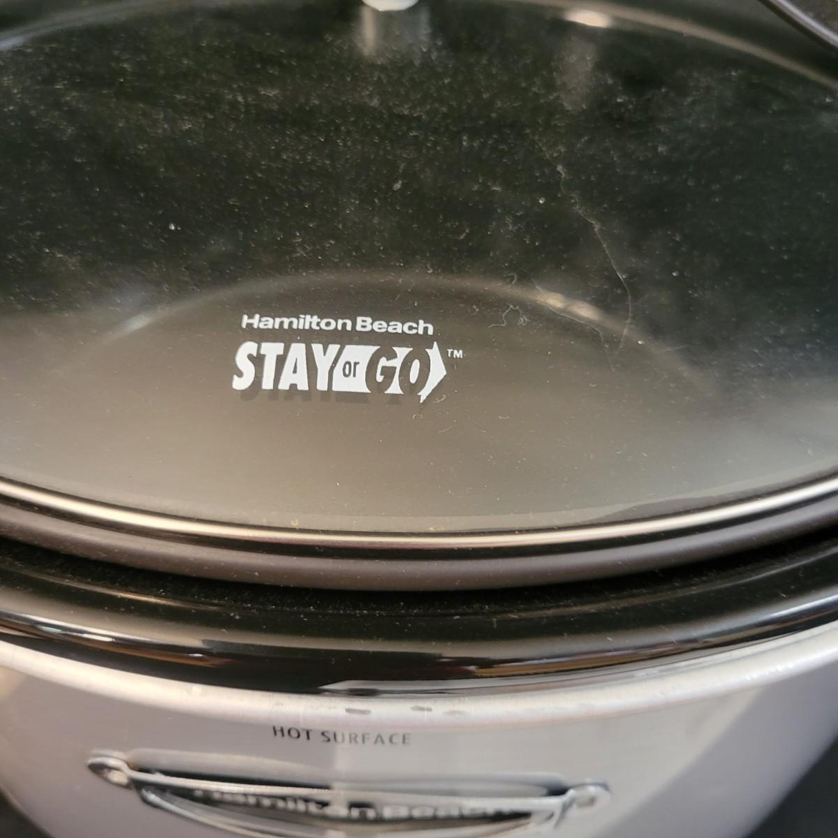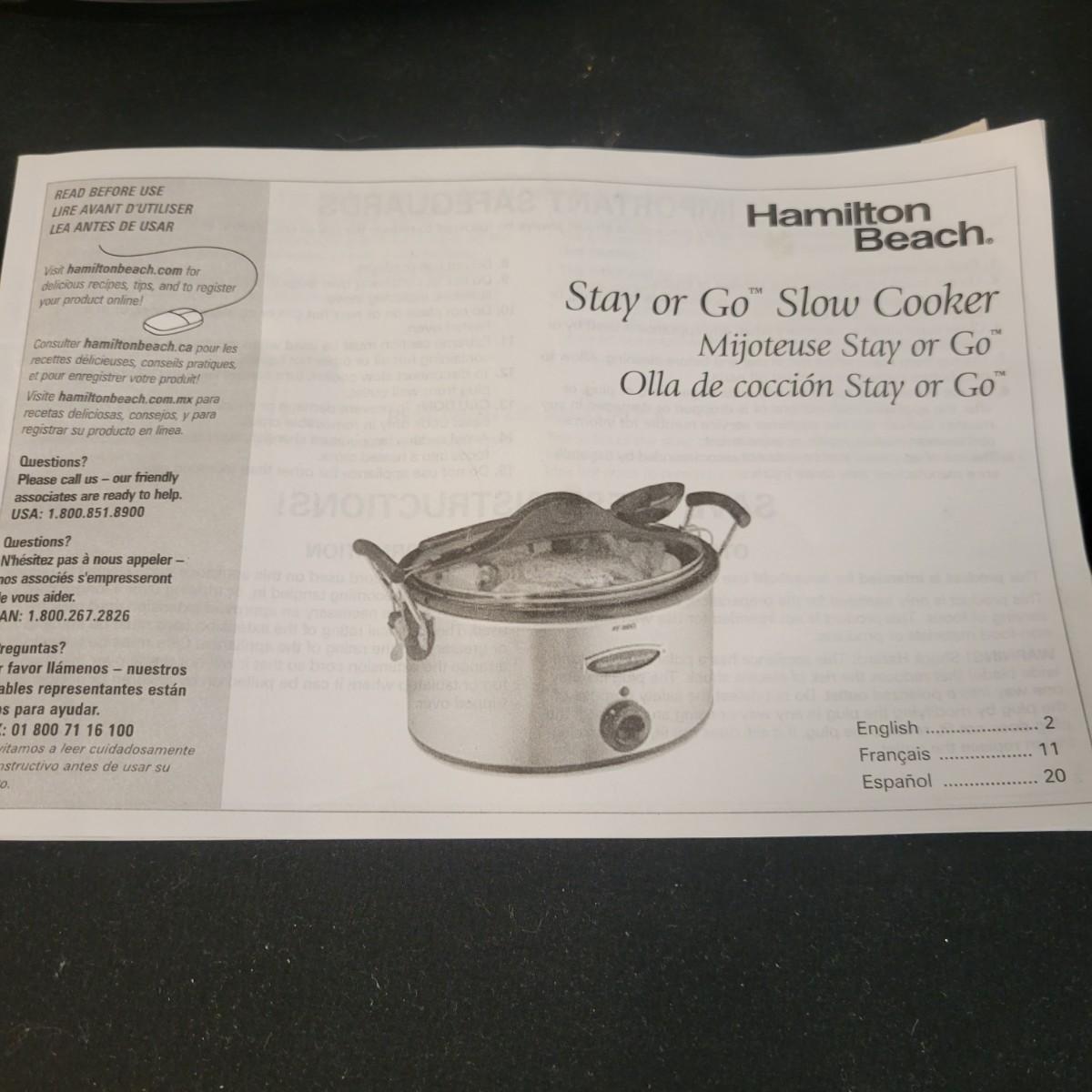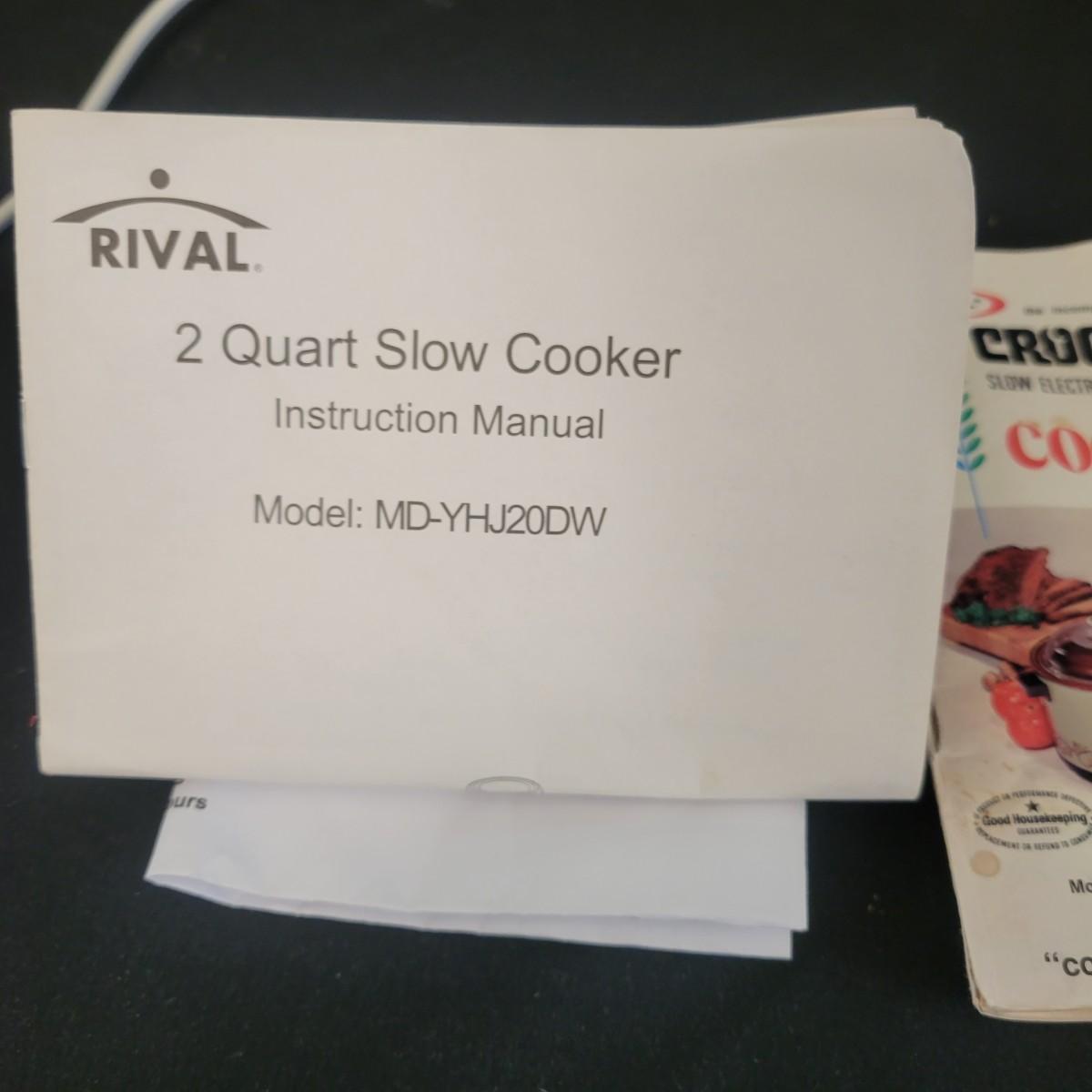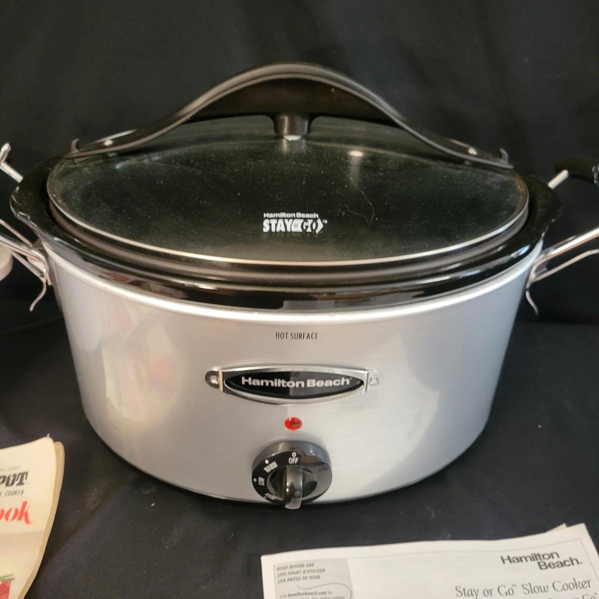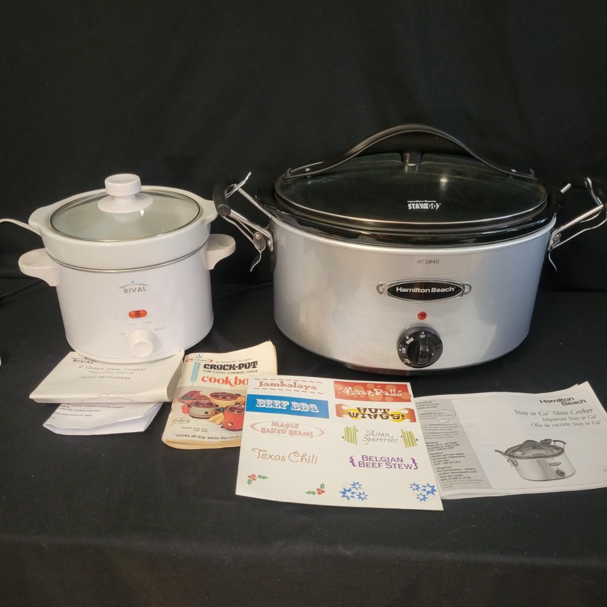 A Rival 2qt crockpot and Hamilton Beach stay n go crockpot in good condition, with some minor residue in the bottom of the crocks. The stay n go features a lockable lid with a seal for travel and little title cards to label your meal. The Rival is a 2qt and also includes a crock pot cookbook. The Hamilton Beach measures approximately 18" x 11" x 9.5" Local pickup only