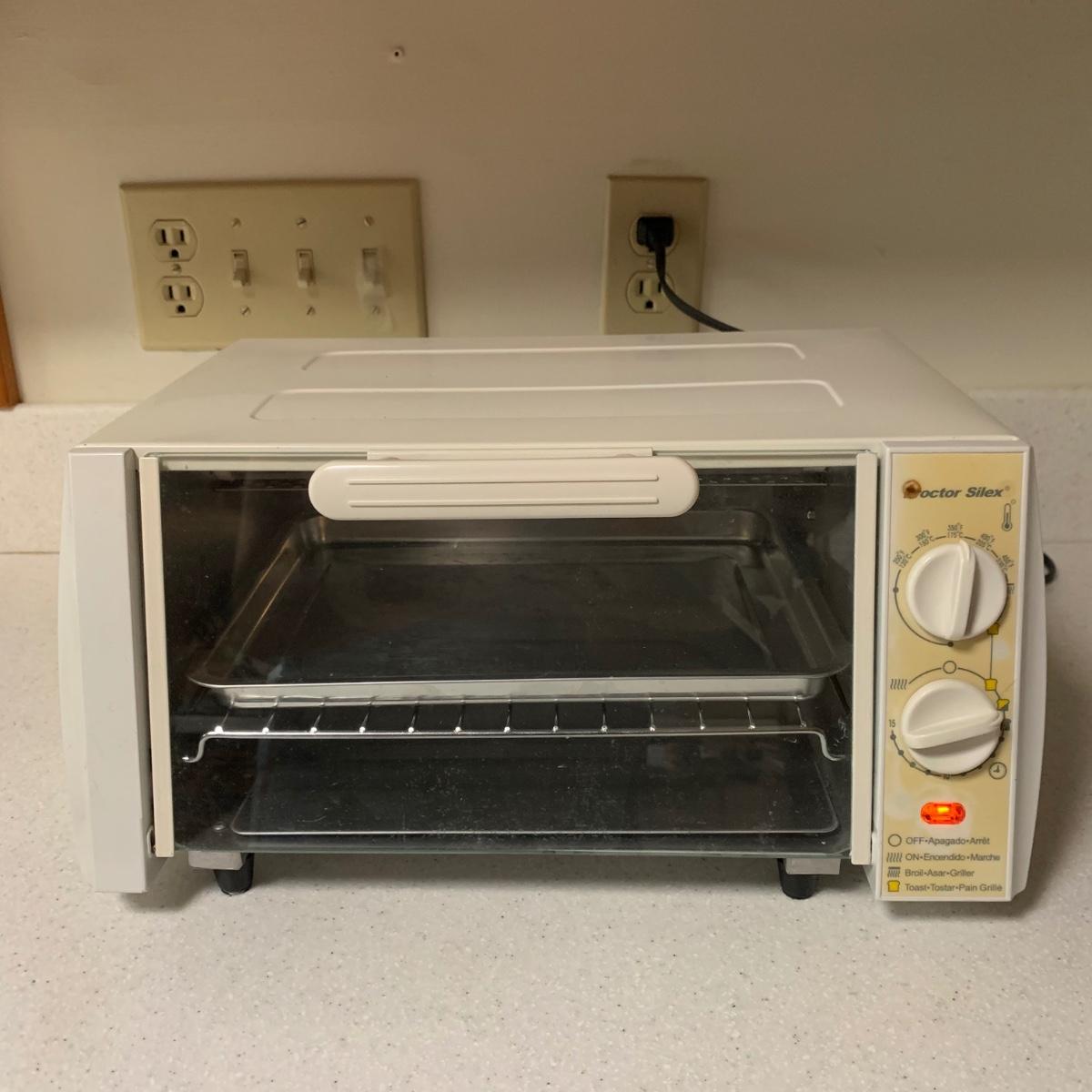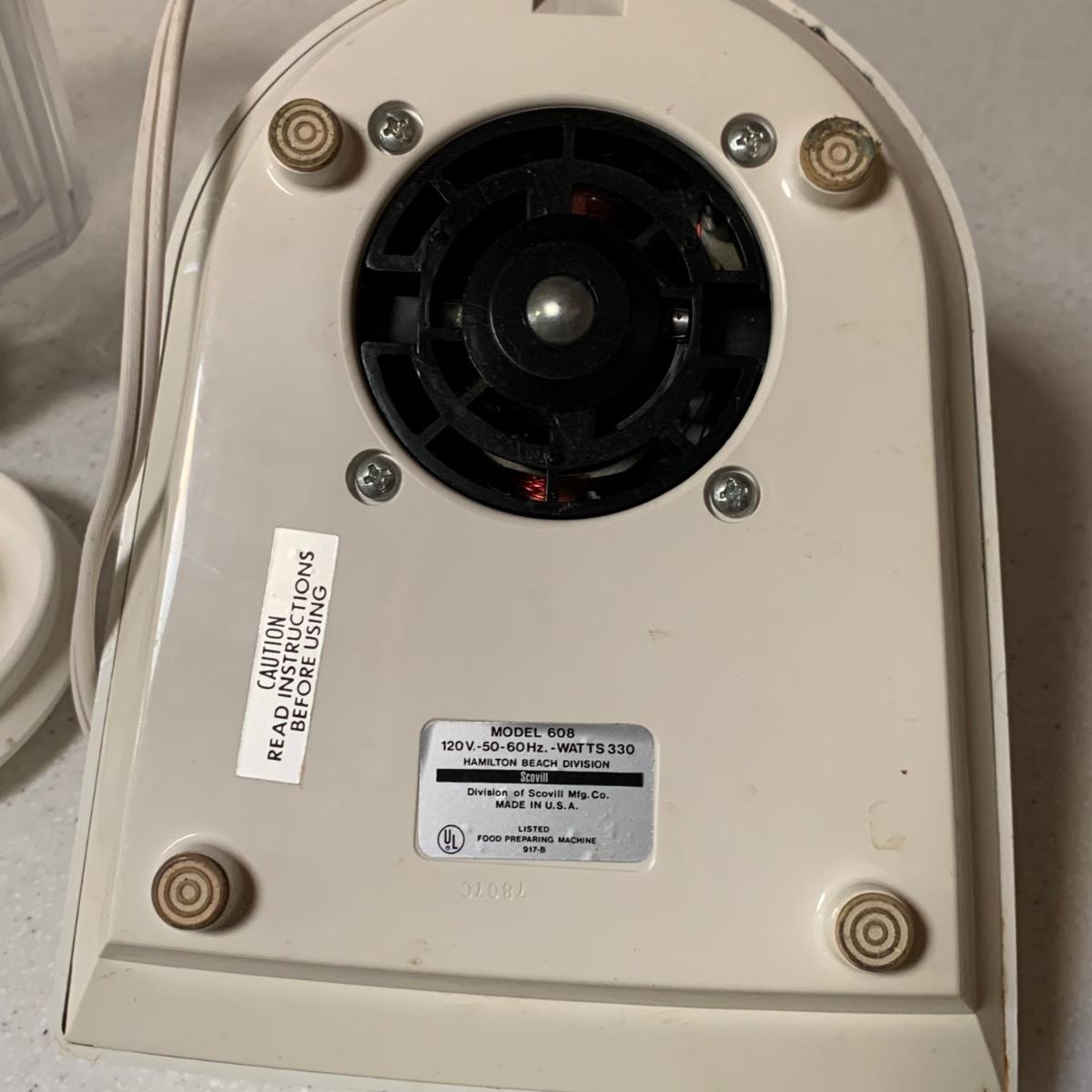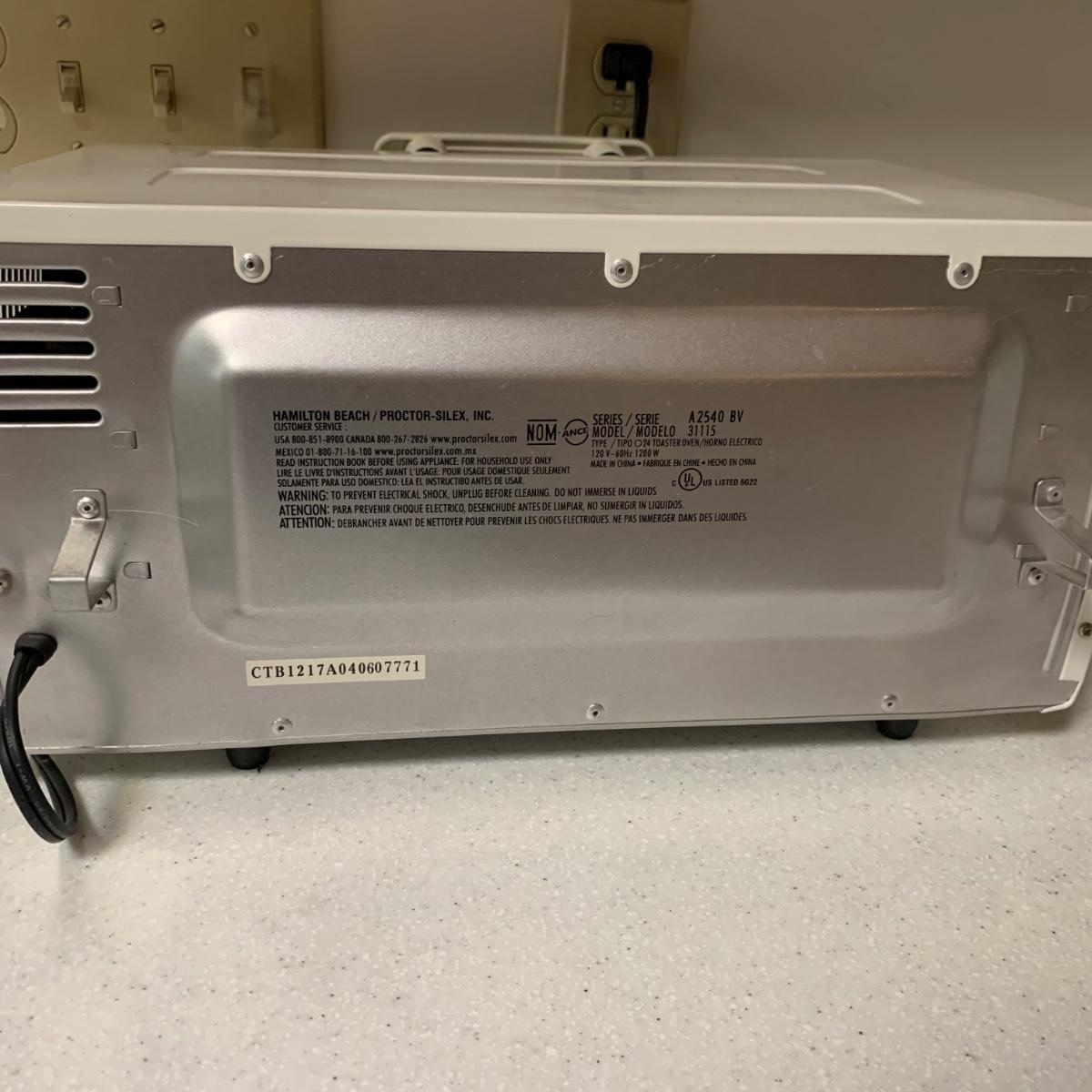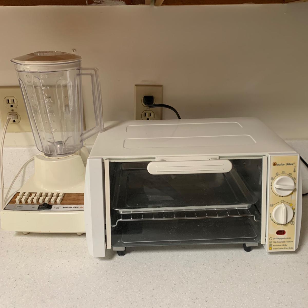 In this lot there is a blender, a toaster oven, and two cutting boards. The blender is a Hamilton Beach Scovill, Model 608, with 16 speeds. It has a plastic pitcher. It is in good condition with the exception of some wear seen on the handle part of the lid, which will not affect its function. The toaster oven is a Proctor Silex, Model 31115. It is in good condition and very clean. Both items functioned when tested. The larger cutting board feels like acrylic and is 24” x 15”. Both cutting boards show signs of use.