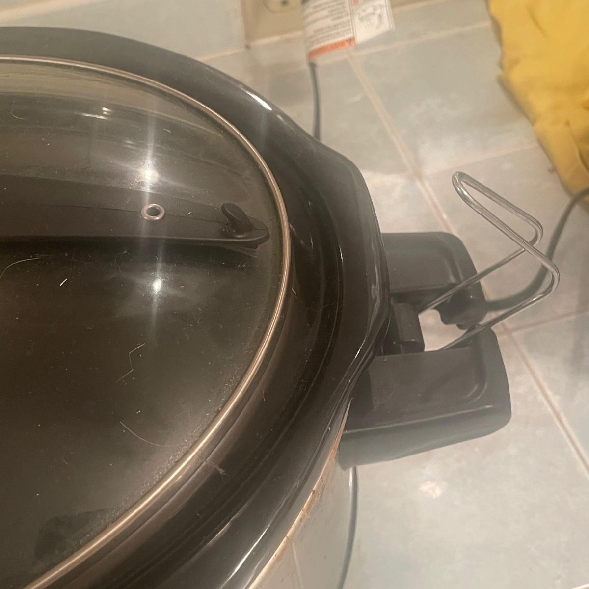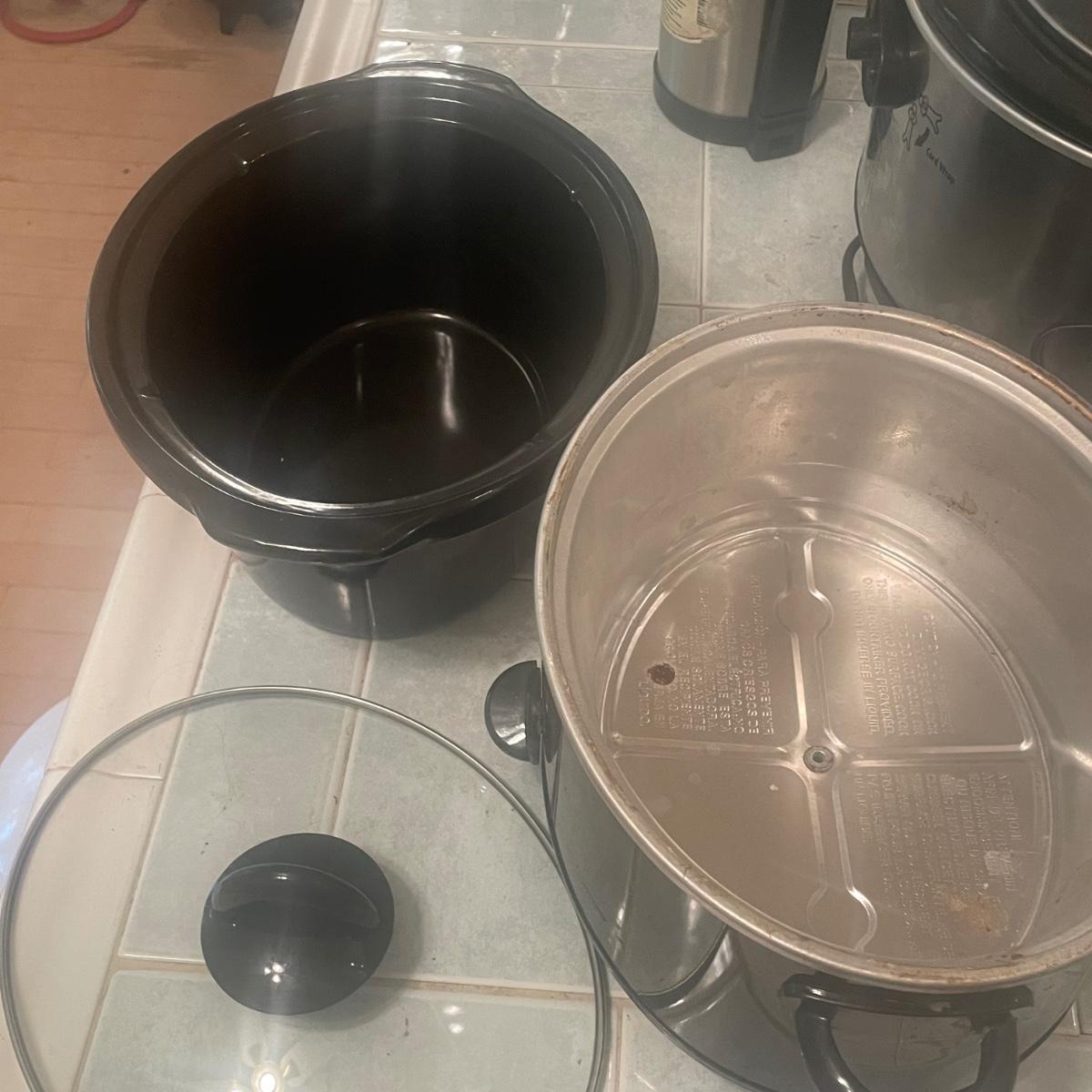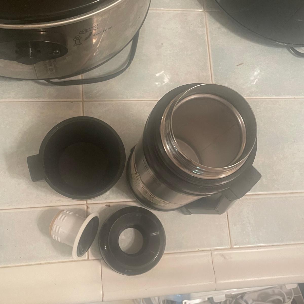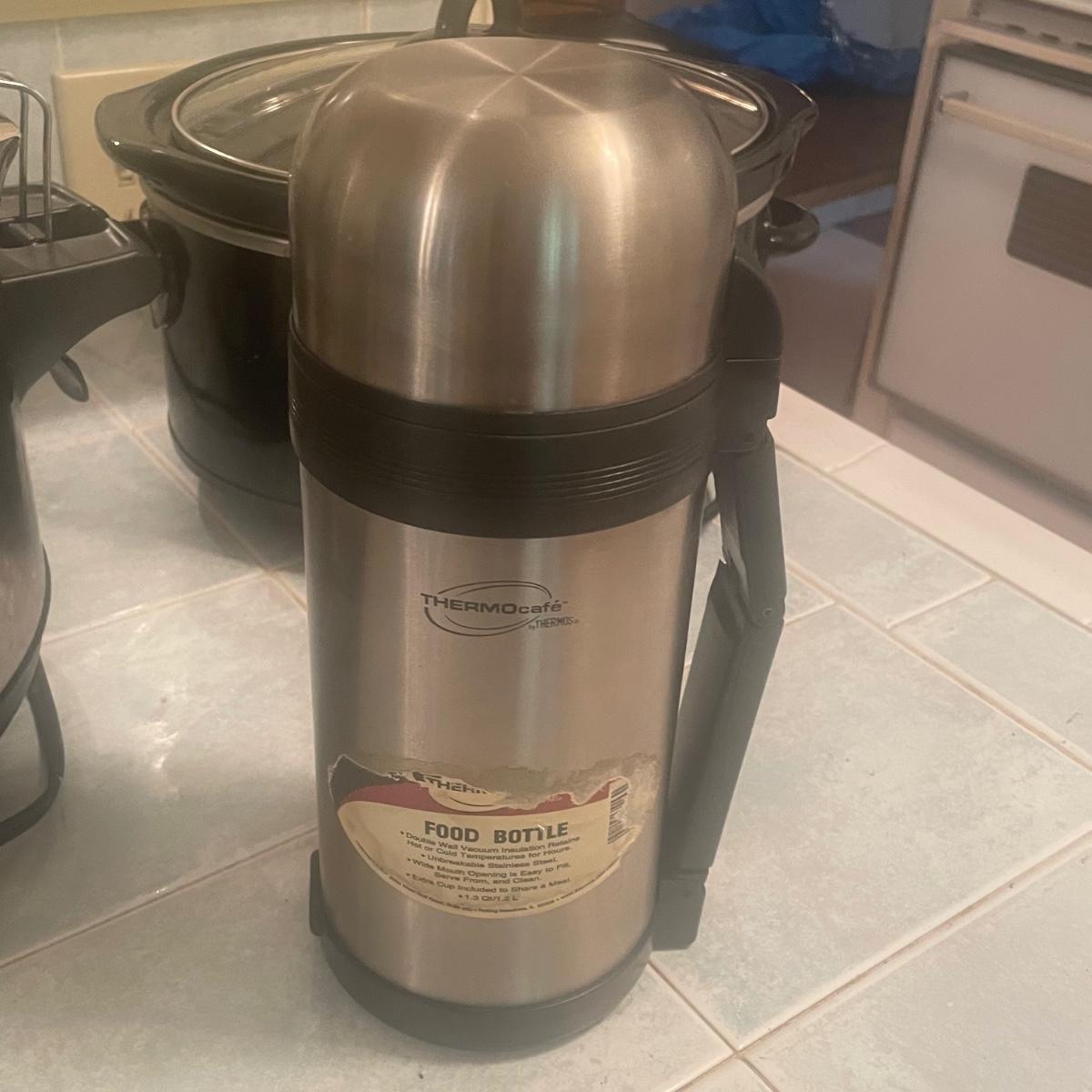 The Hamilton Beach crock pot is programmable and is a large 6 quart crock pot. The smaller pot is made by Crock Pot and is 4 quart. Both powered on when plugged in and are in good, but dirty condition. Note there is a small chip in the outer rim of the inside bowl of the Hamilton Beach. Fortunately as it’s the rim it shouldn’t affect its cooking capabilities. Also included is an aluminum ThermoCafe Thermos.