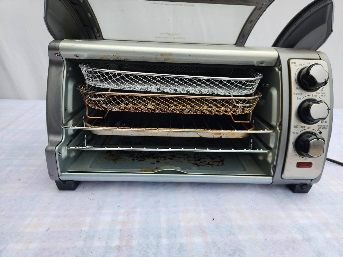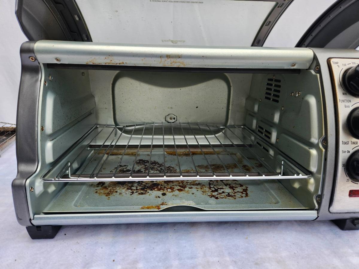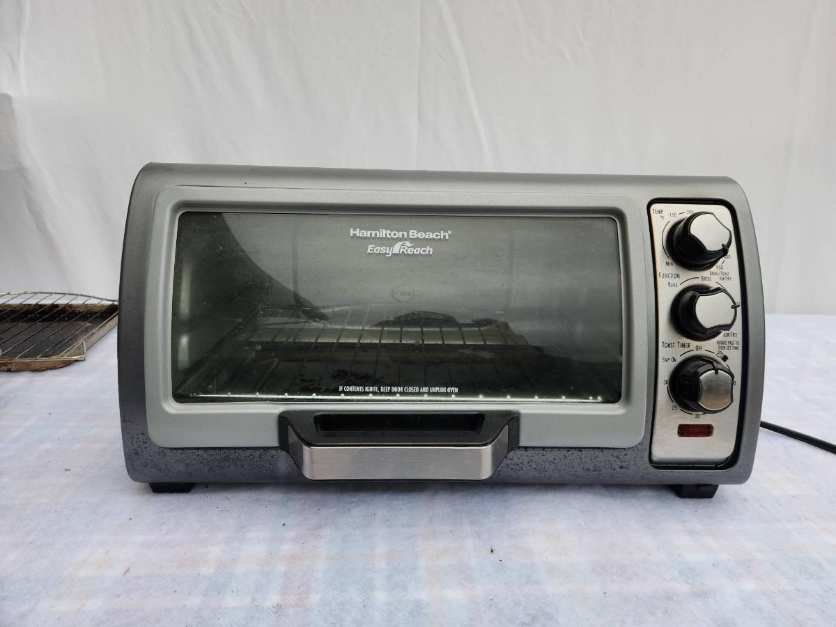 Hamilton Beach Easy Reach toaster oven featuring a roll-top door for convenient access. Includes adjustable temperature control knobs, a wire rack, crumb tray, and additional wire baskets. Shows signs of use with visible surface discoloration and residue. Plug-in power cord is intact. Functionality untested. Dimensions unspecified.
