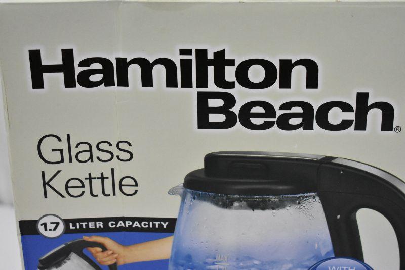 Hamilton Beach Glass Kettle, 1.7 litre capacity, electric with auto shut off, includes box