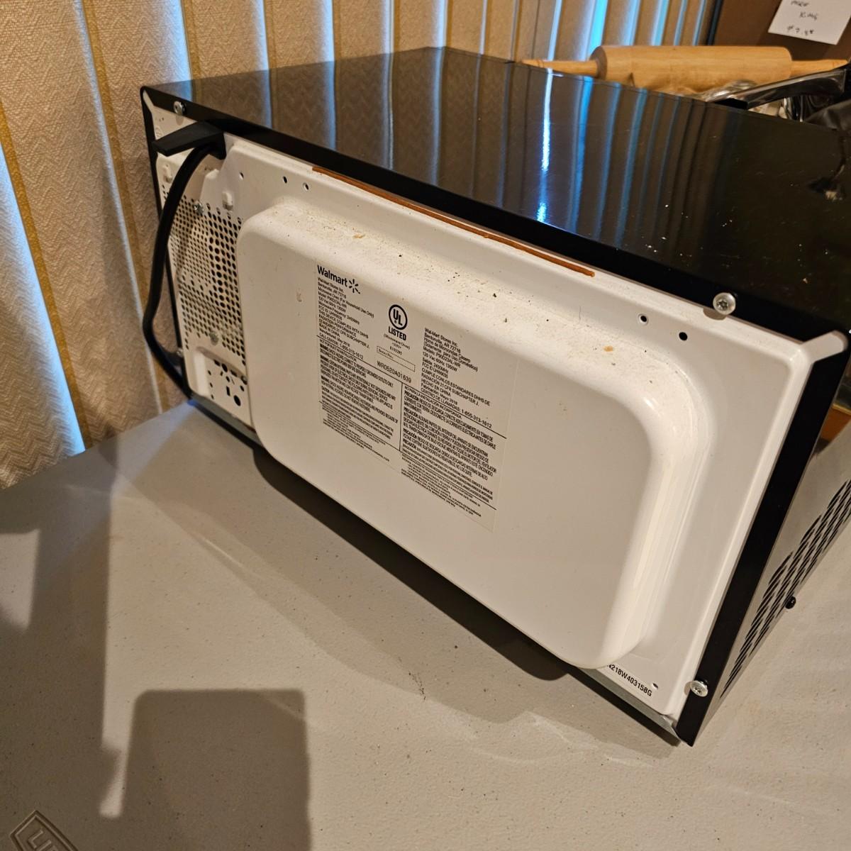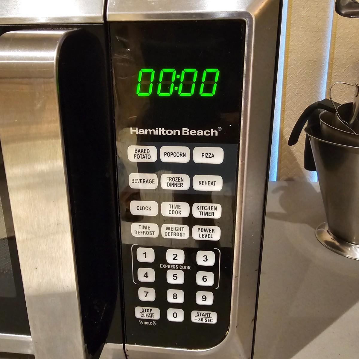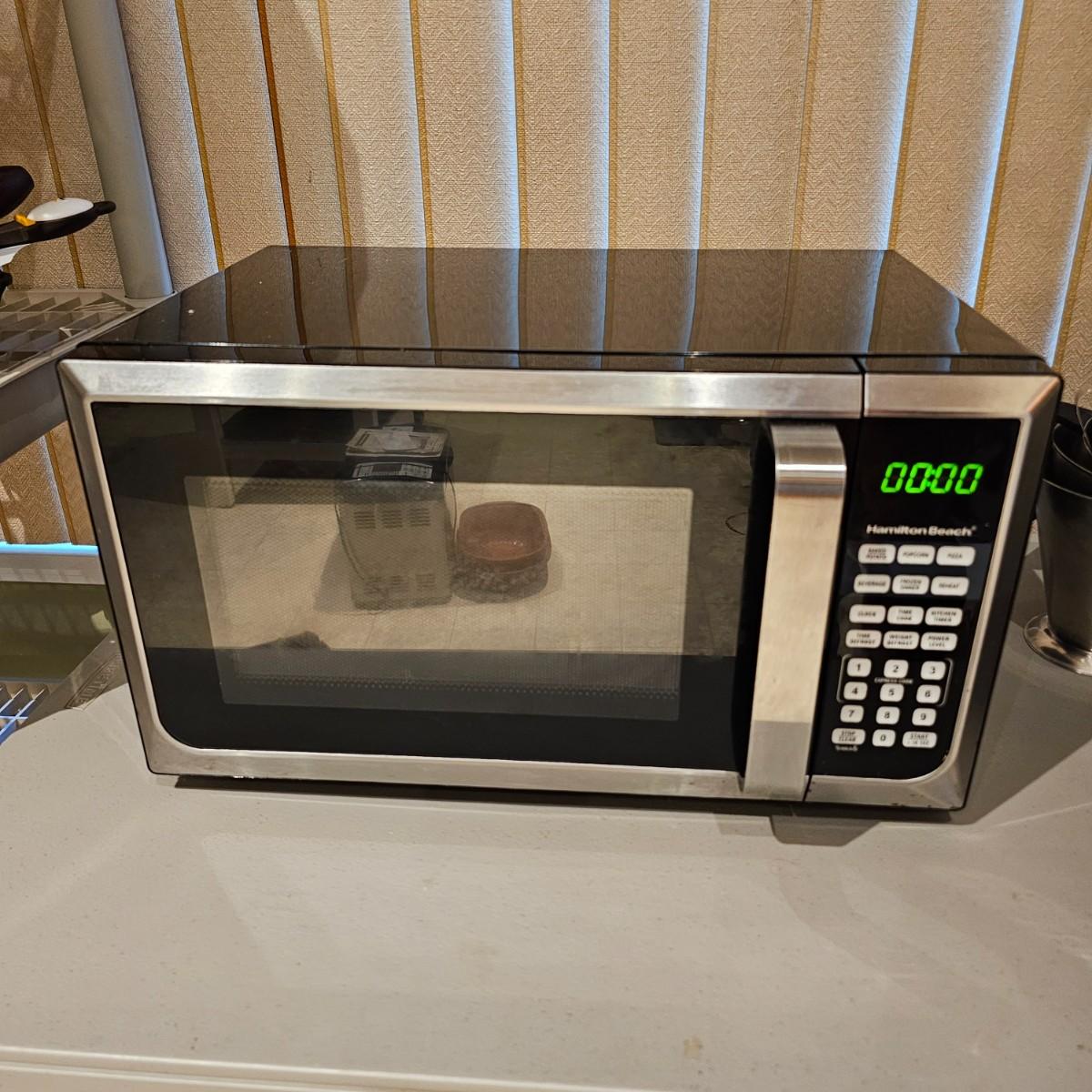 Compact size microwave by Hamilton Beach. Glass turntable, pull door handle. Item measures 19" x 16" x 10.5"H and powered on when plugged in. See photos for details. Local pickup only.