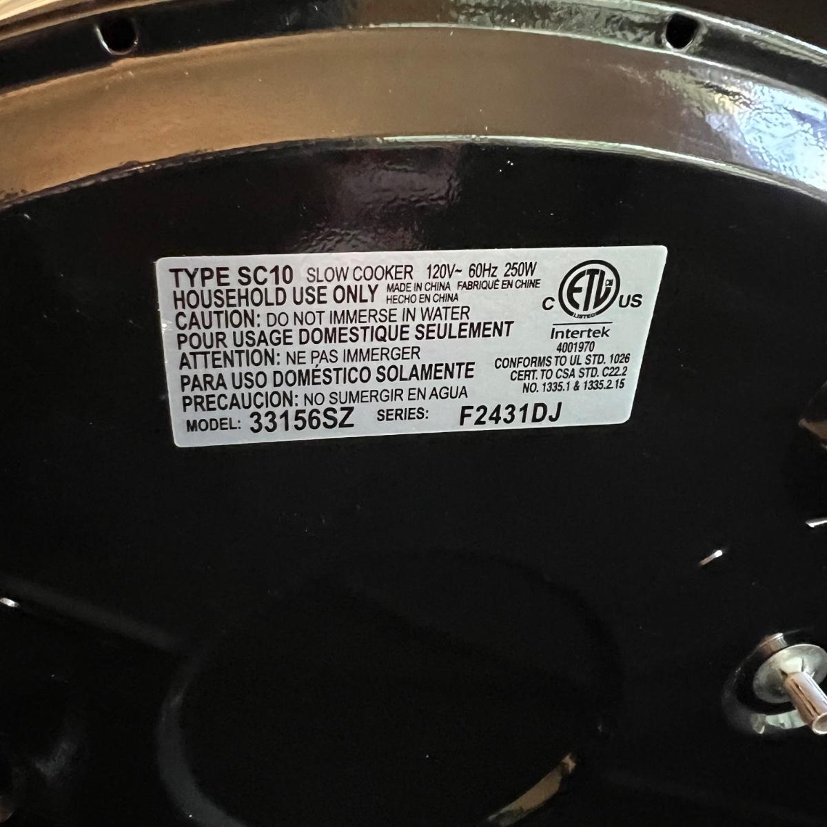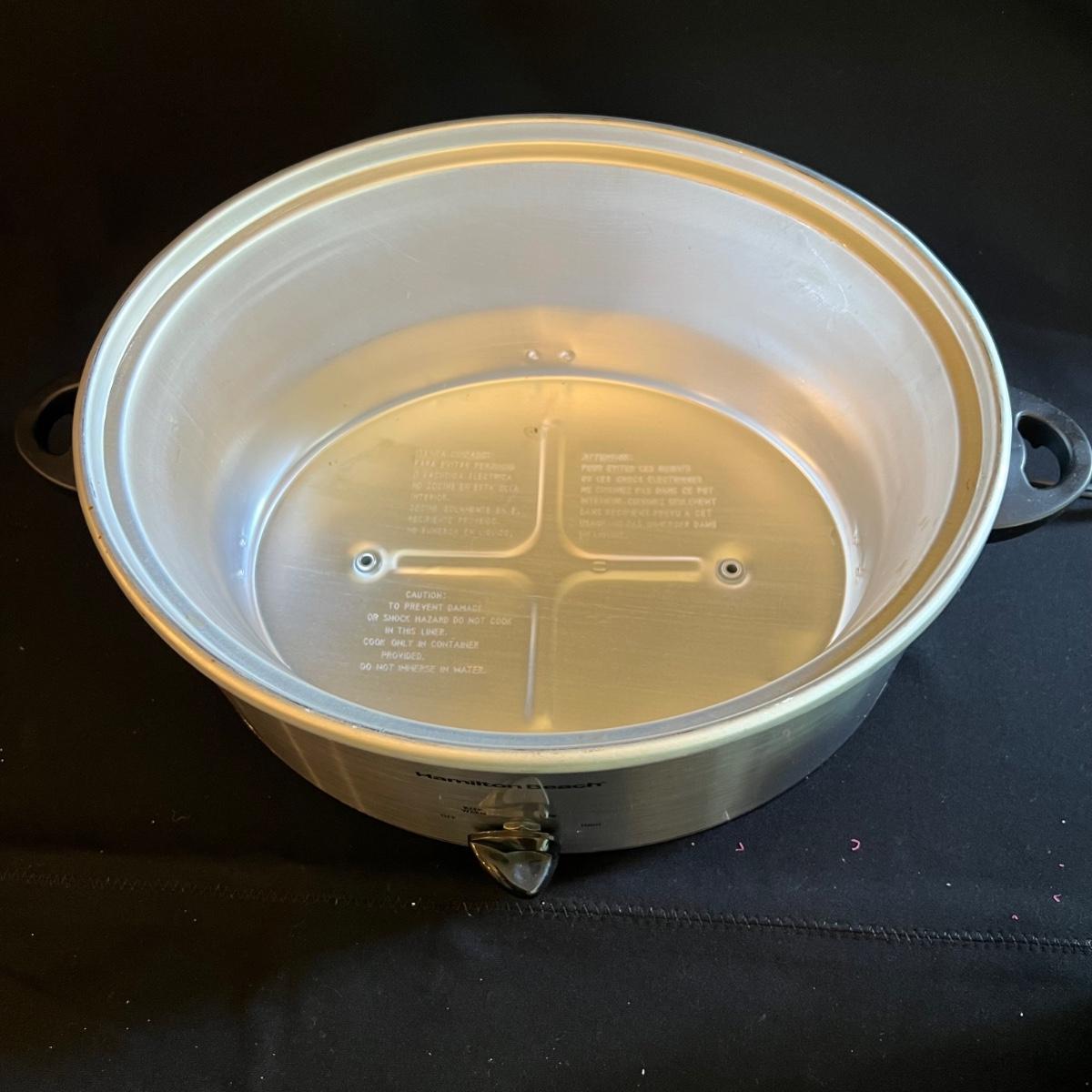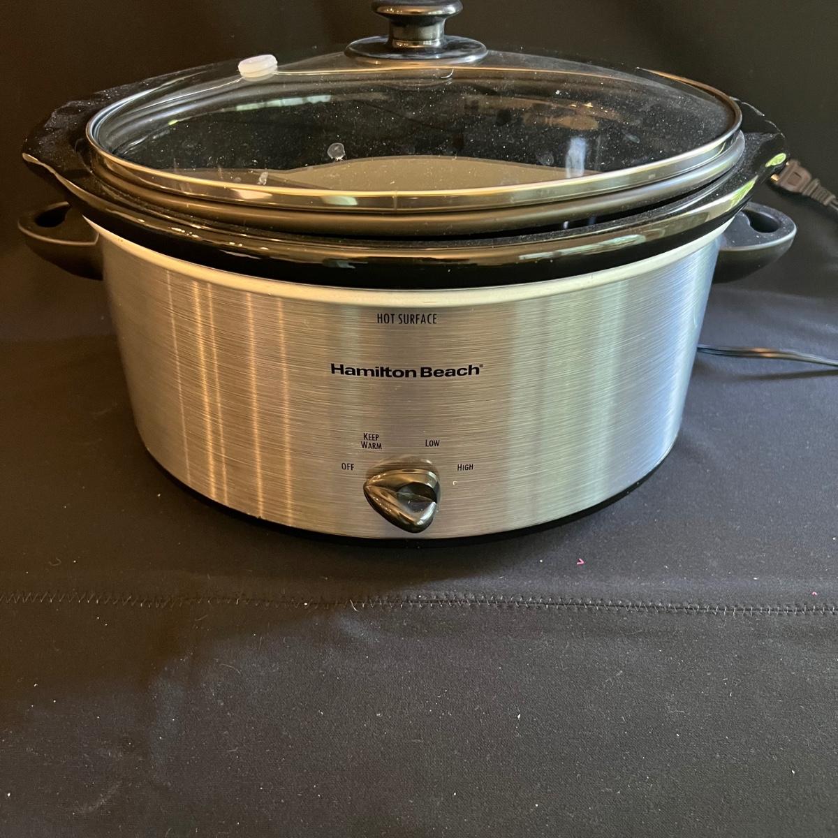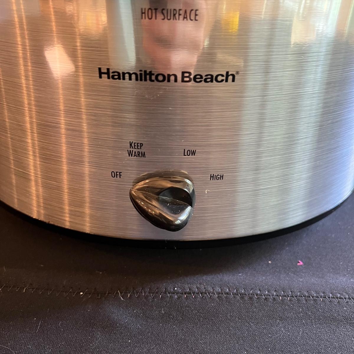 Hamilton Beach slow cooker which has three separate settings and measures 14” x 11” x 8”H. The appliance powers on when plugged in.