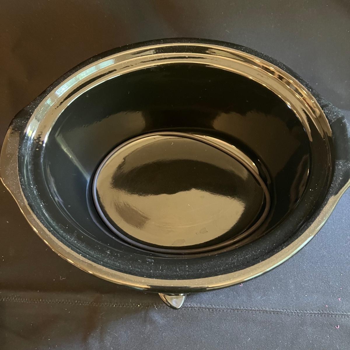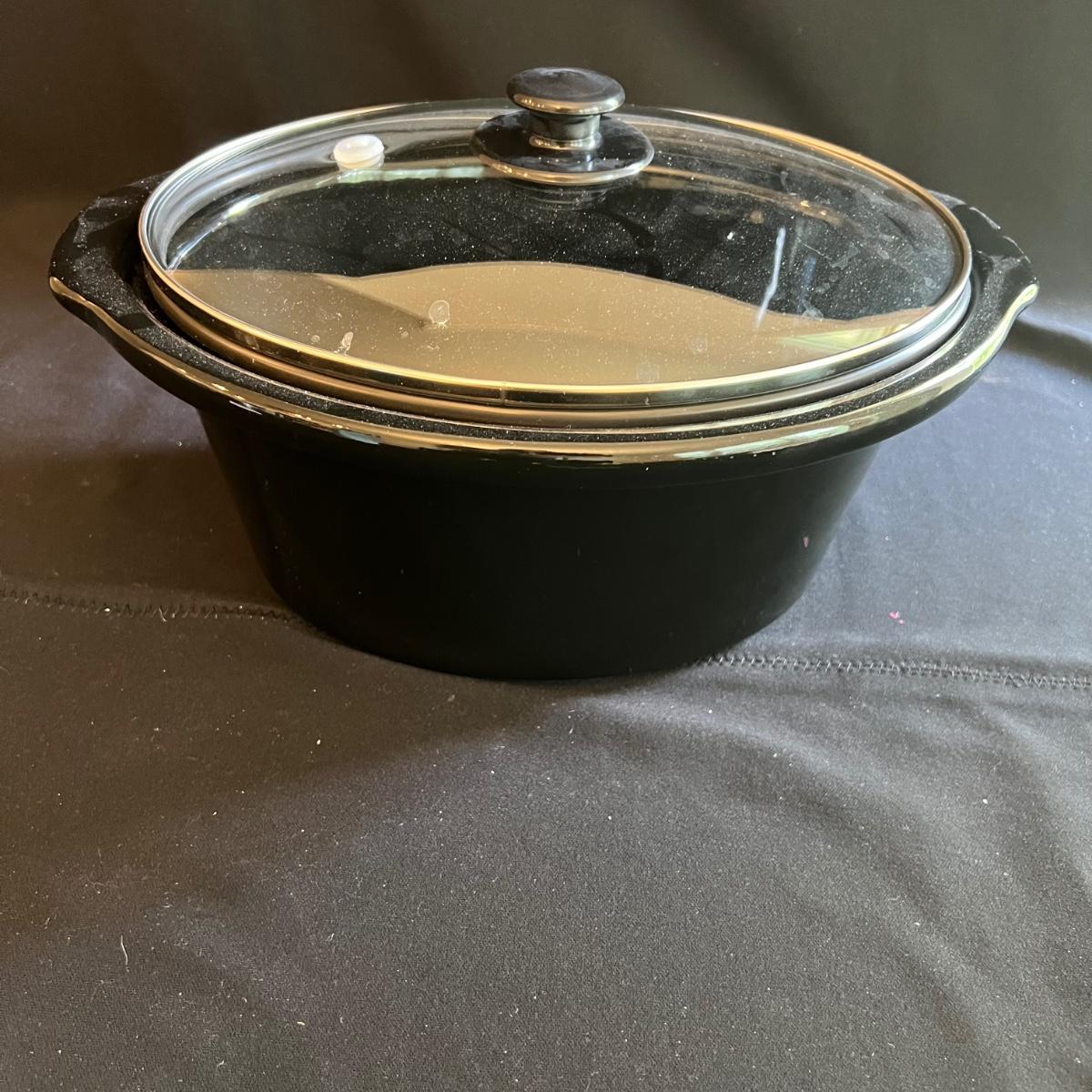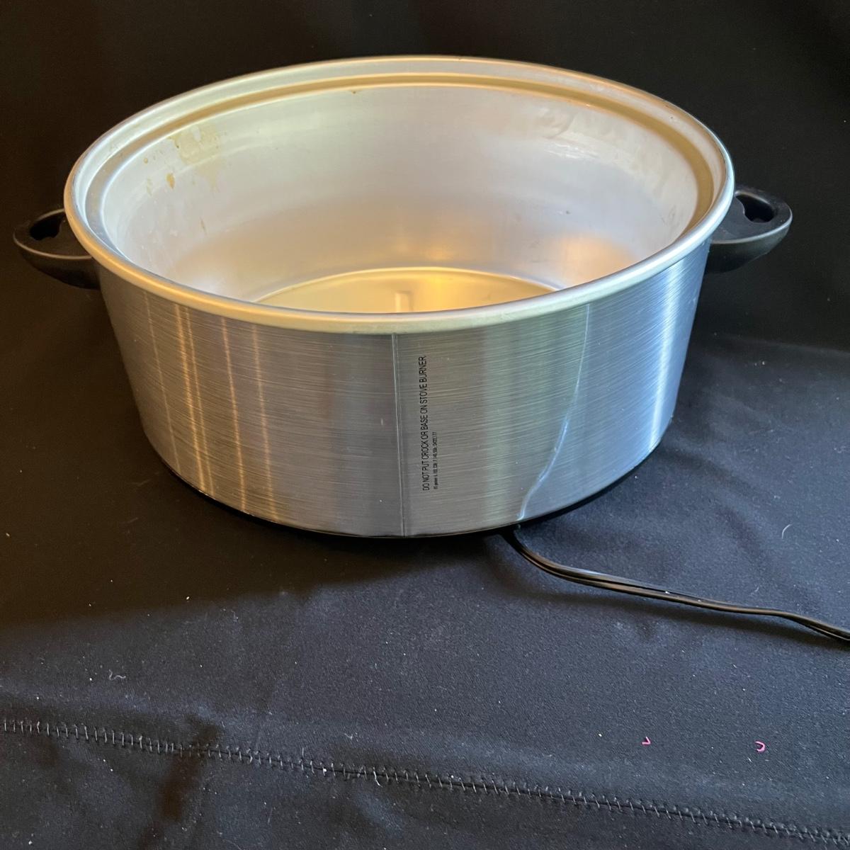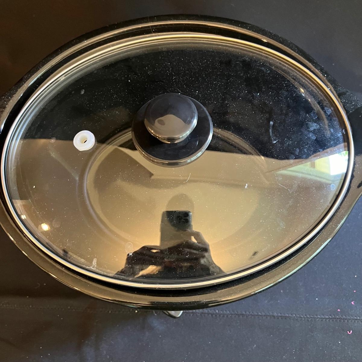 Hamilton Beach slow cooker which has three separate settings and measures 14” x 11” x 8”H. The appliance powers on when plugged in.