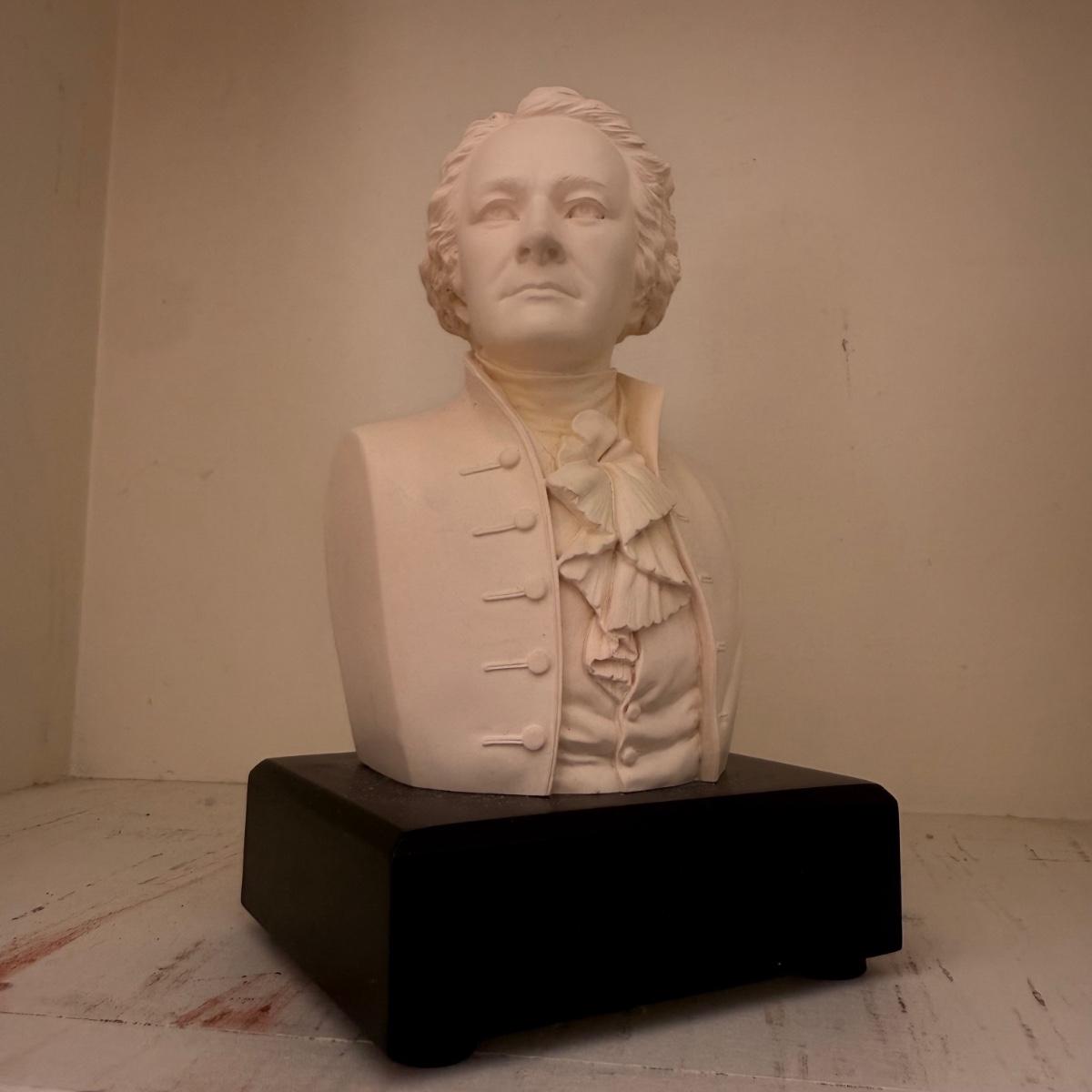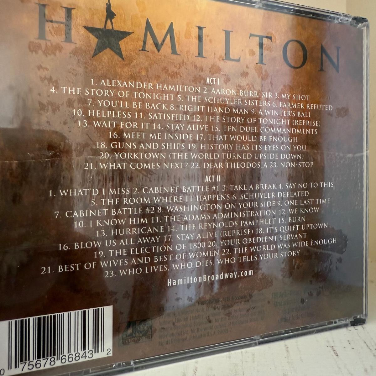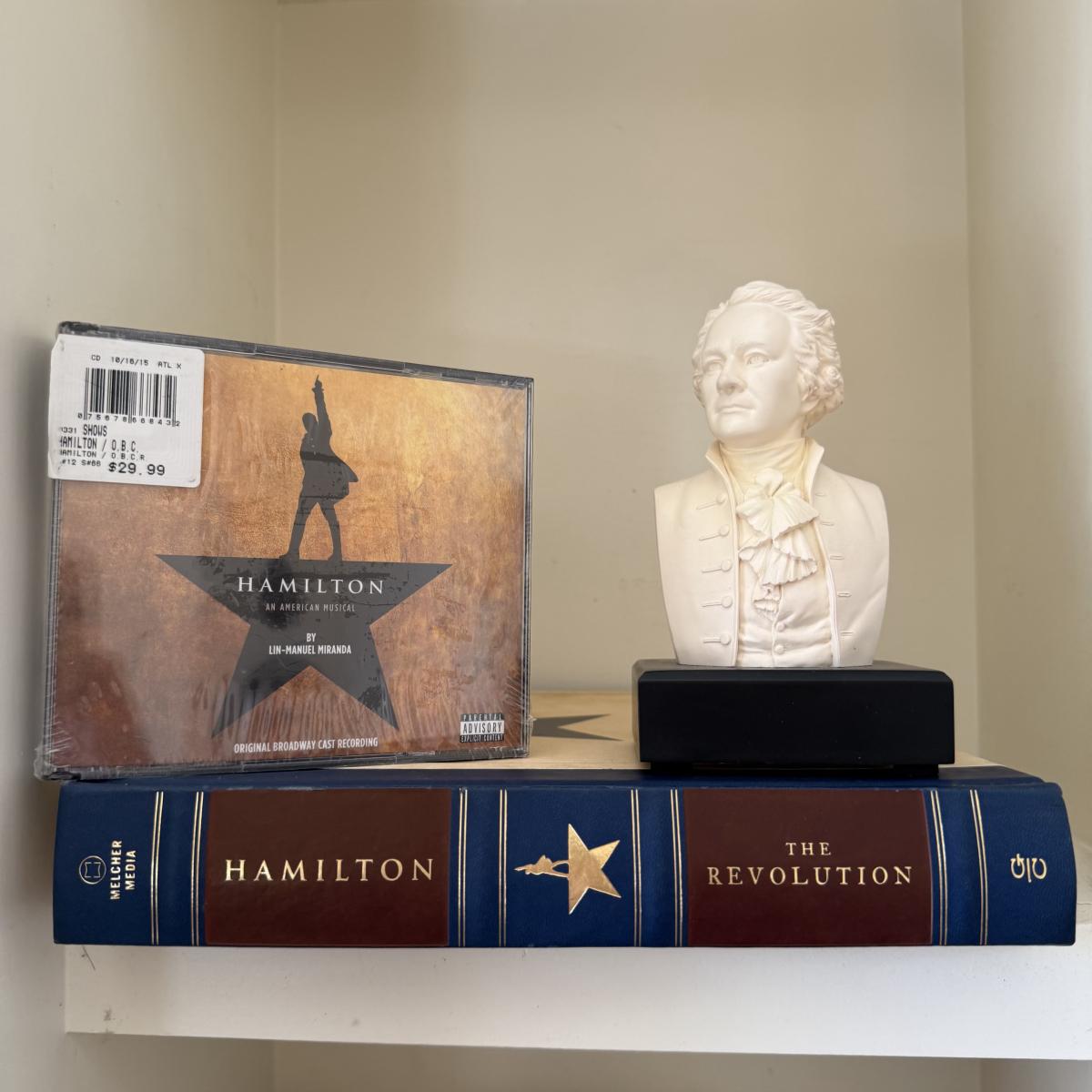 Hamilton Broadway musical memorabilia included Hamilton: The Revolution book and an unopened two-disc set of the original Broadway cast recording. Also included is a small Hamilton bust sculpture that appears to be made of resin, as well as six books about the founding fathers and/or early US presidents.