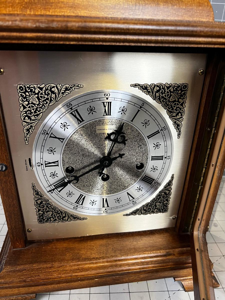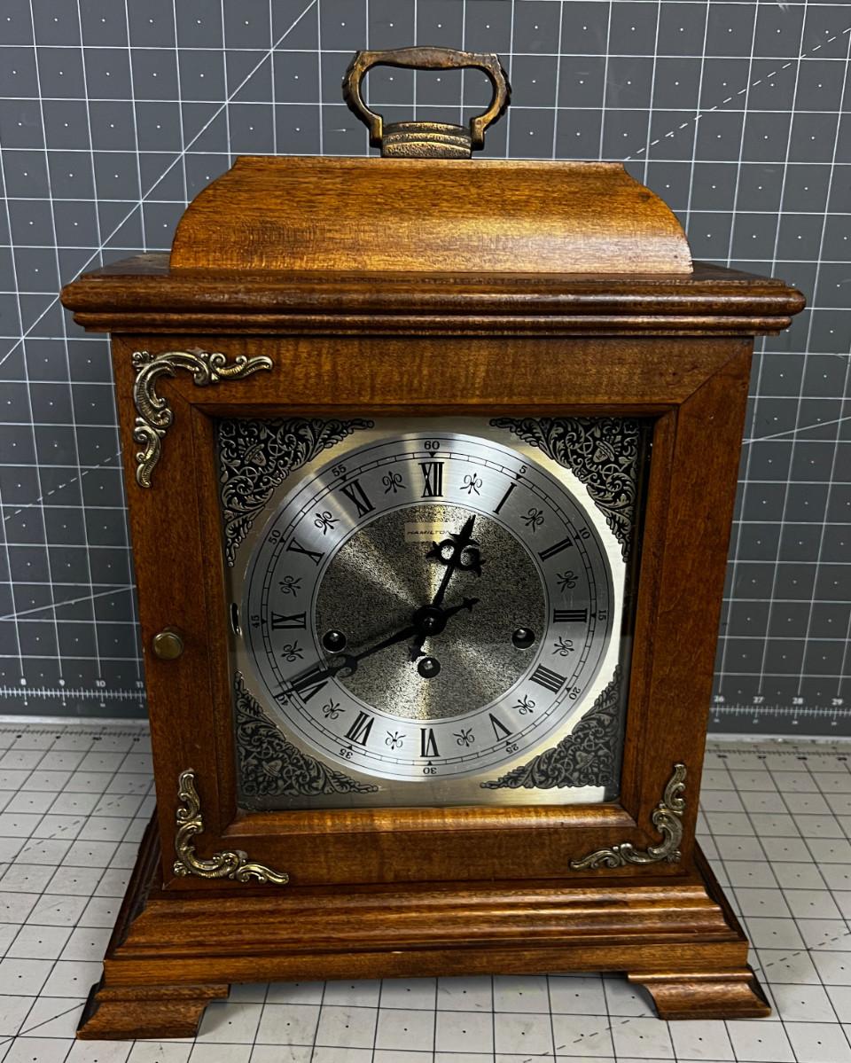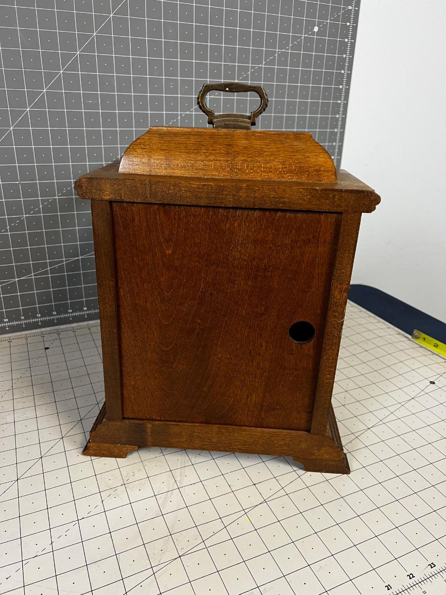 Appears to be in working condition, but we do not have a key to wind. It Seems to b e working from moving it. It chimes when you move the hands. Measures 12" X 7" x 16"