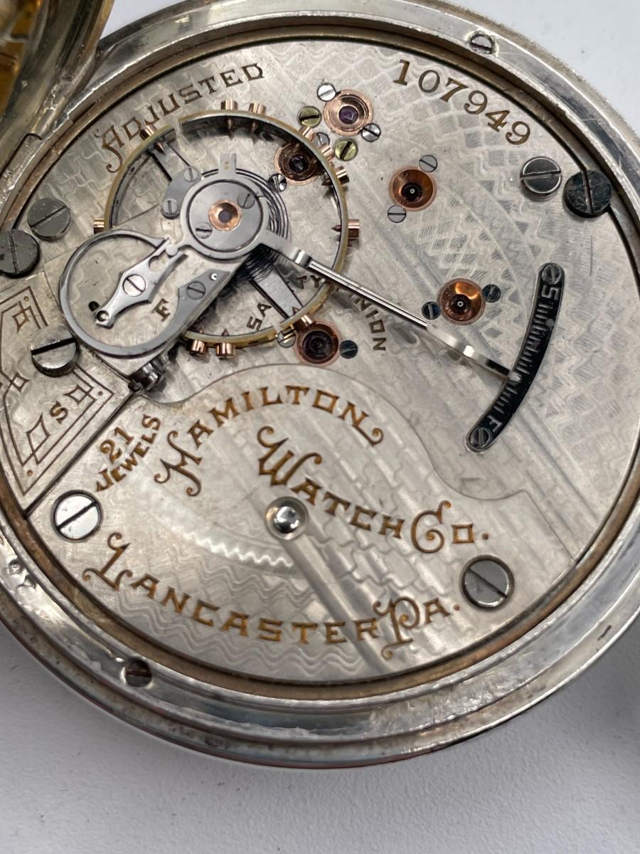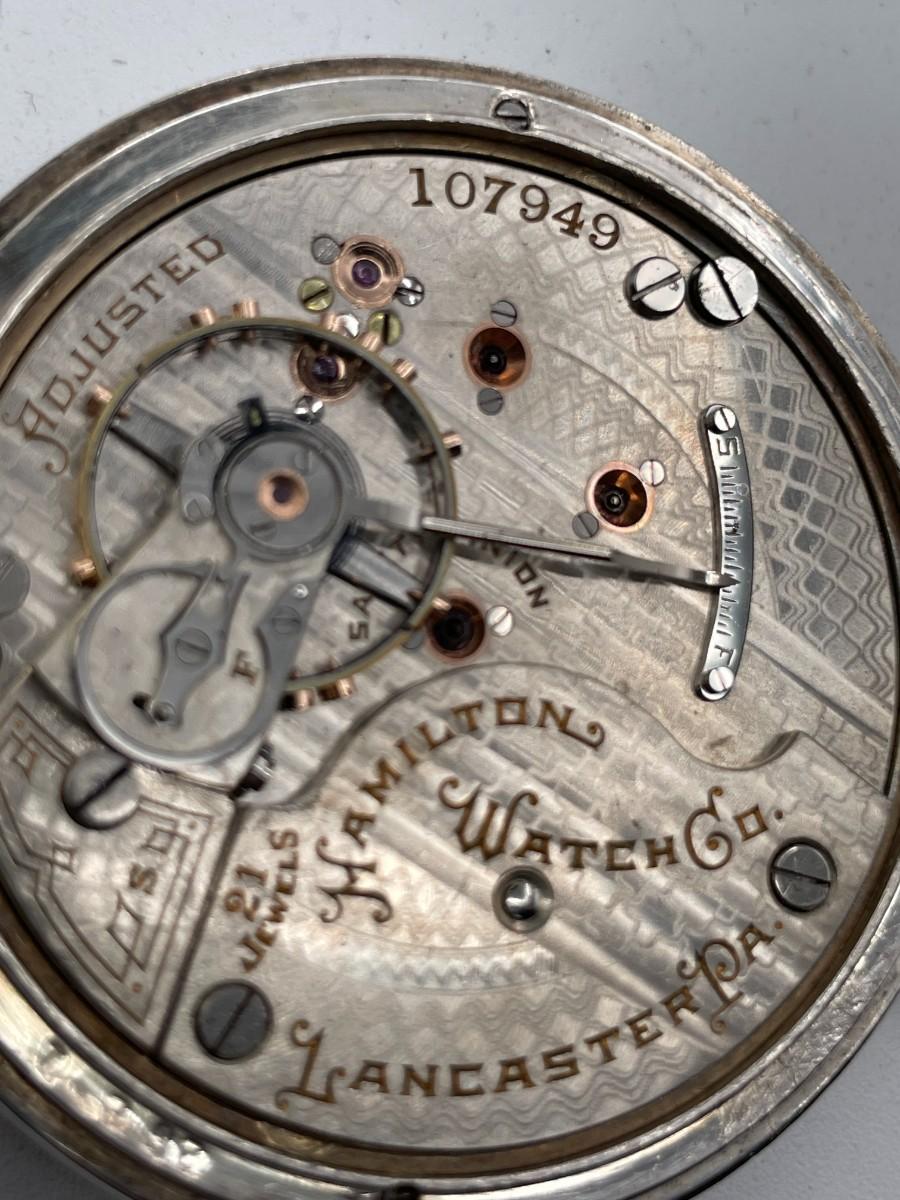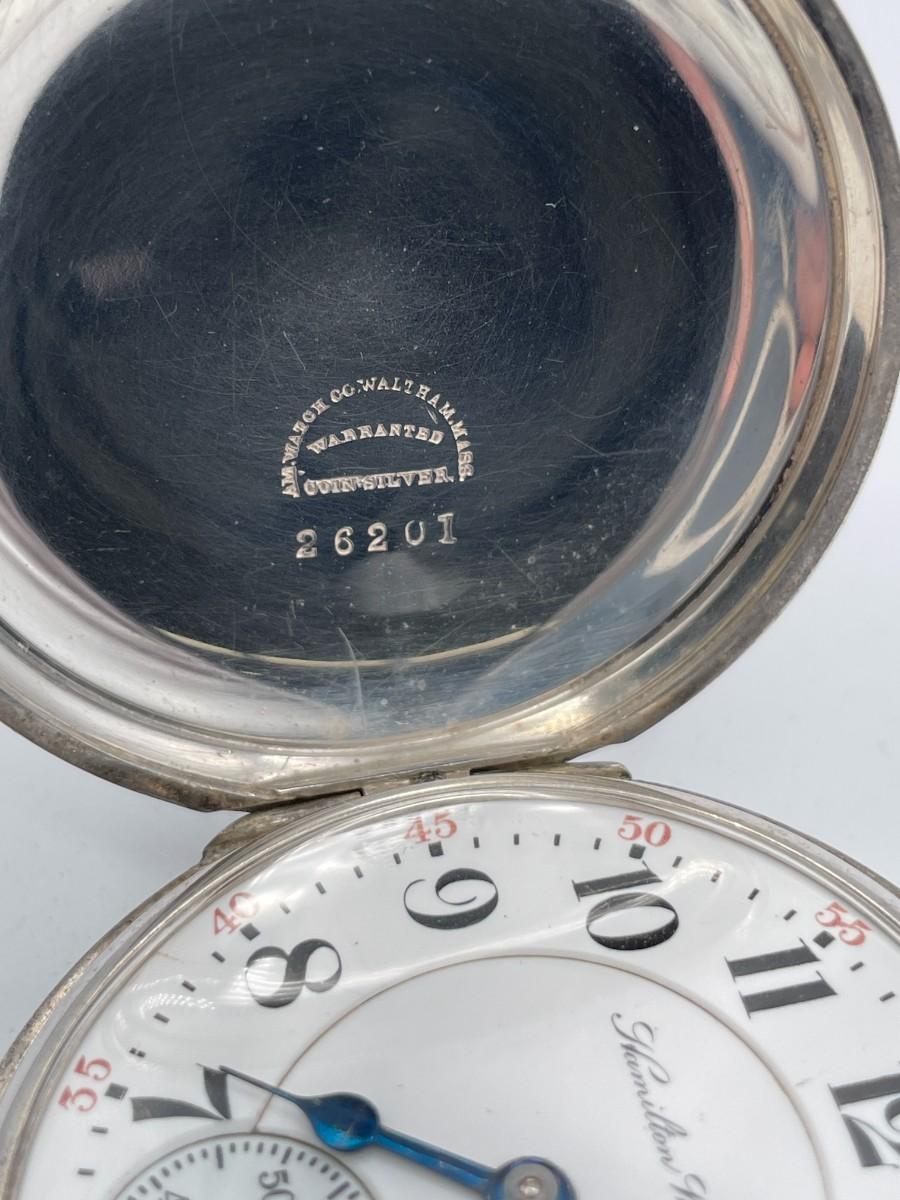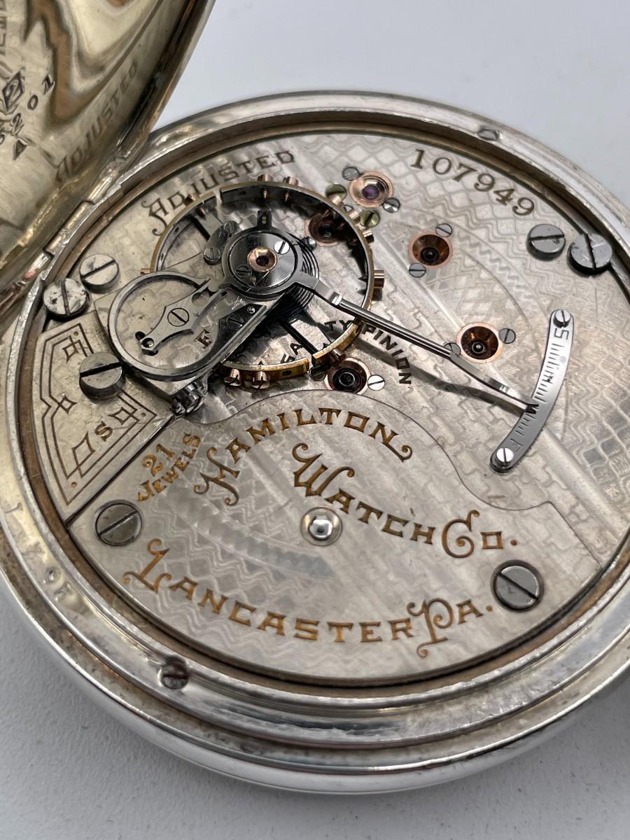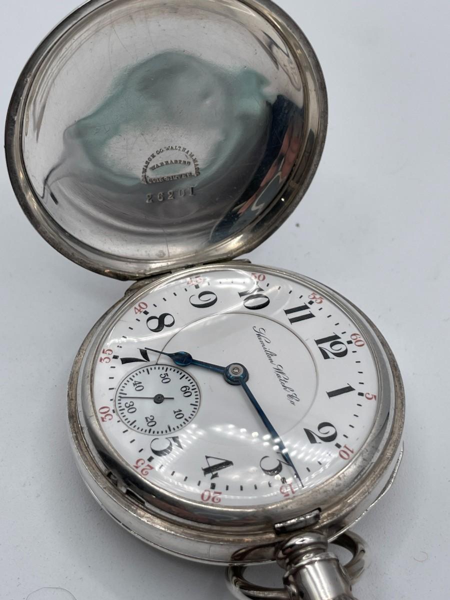 Hamilton Pocket watch No. (107949), Size 18S, Production Yr. 1901, 21 Jewels. Case: A M Watch CC, Coin Silver, No. 26201, Decorative case. Condition - Winder & watch are in working order. This is not a guarantee that all parts are original nor is the watch autheniticated.