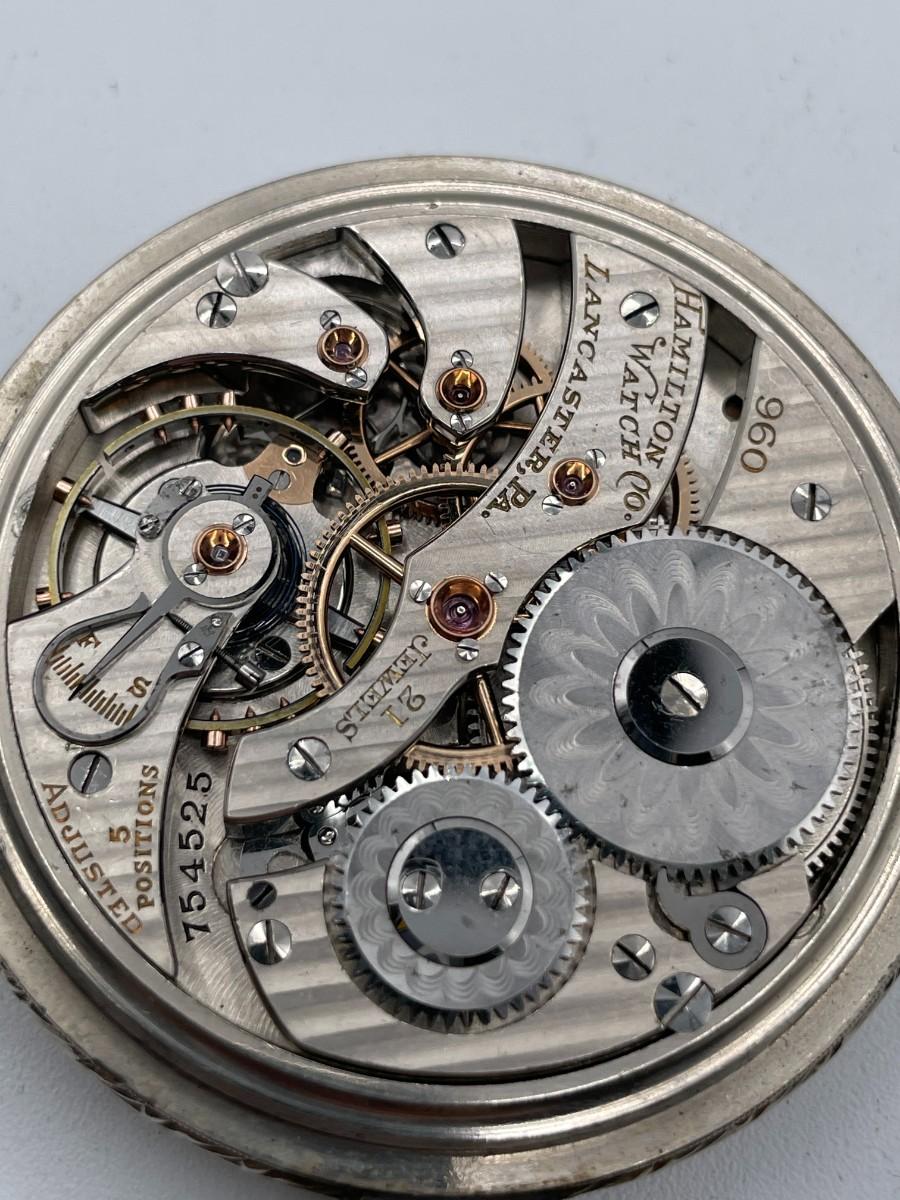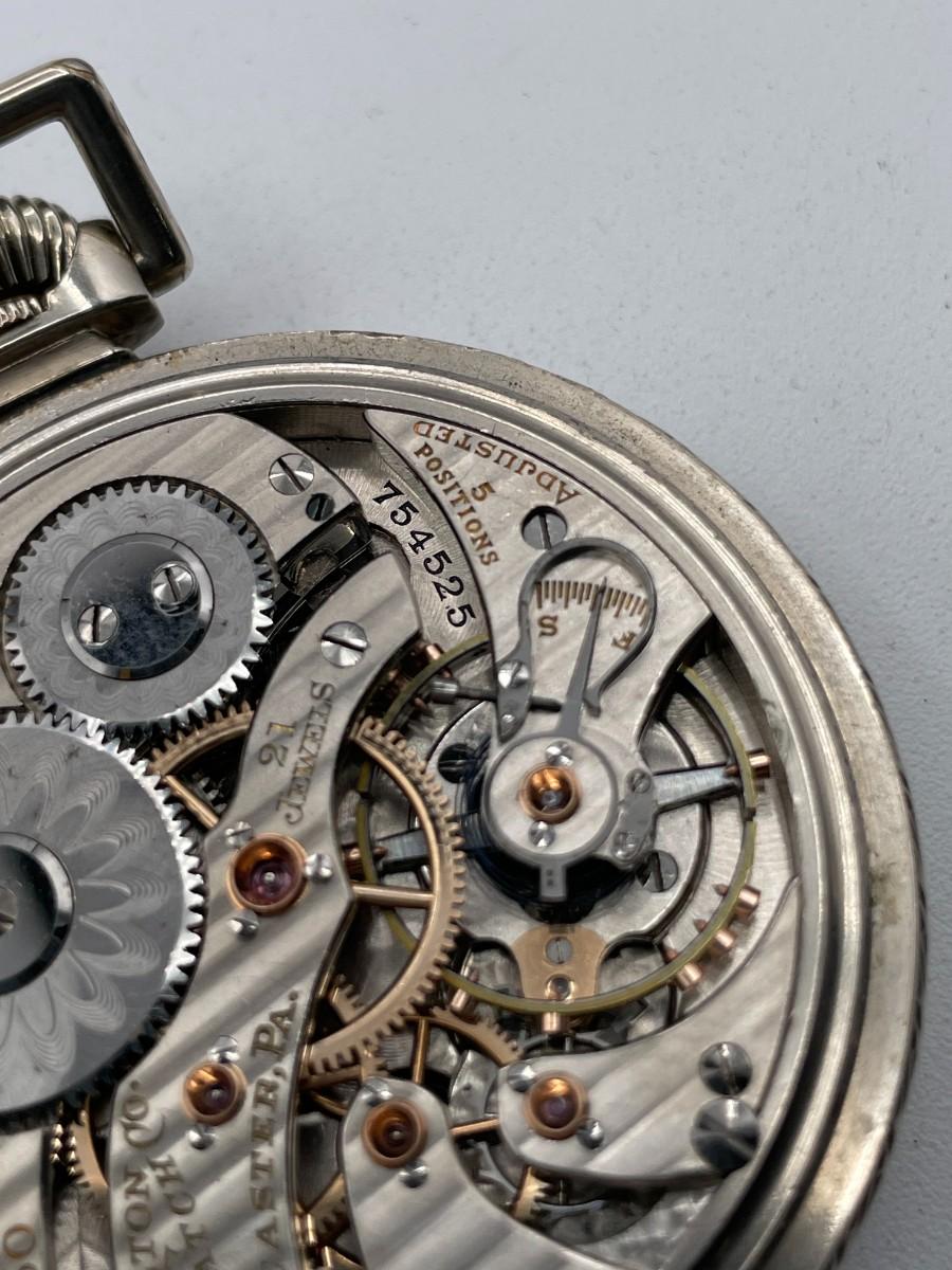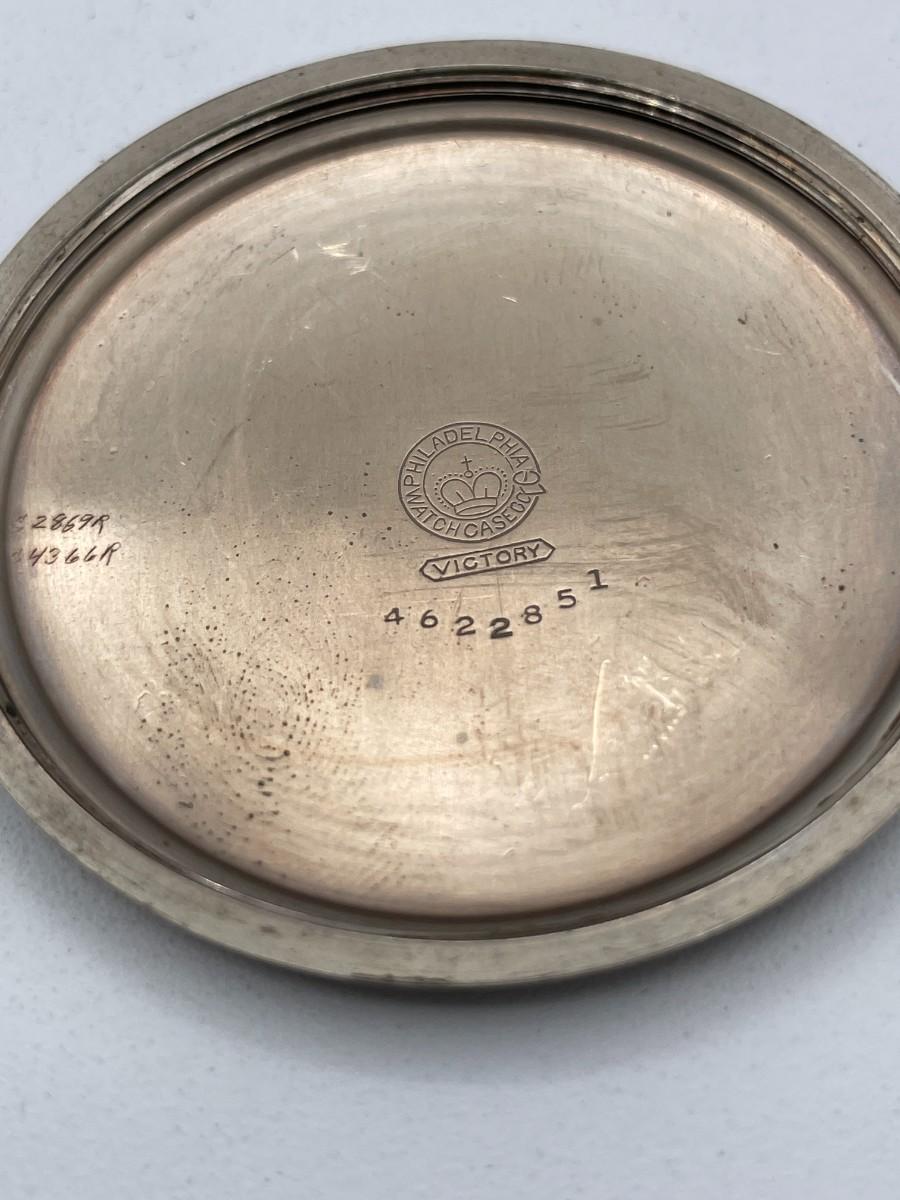Hamilton Pocket Watch, No. 754525, Size 16s, Prod Yr. 1910, 21 Jewels. Case: Philadelphia Watch Case, Victory, No. 4622851, Silver-tone. Condition - Winder & watch are in working order. This is not a guarantee that all parts are original nor is the watch autheniticated.