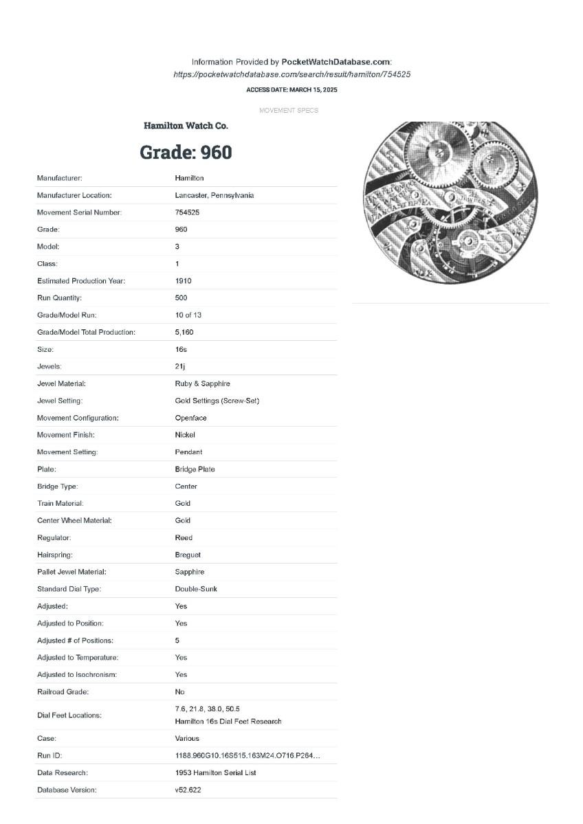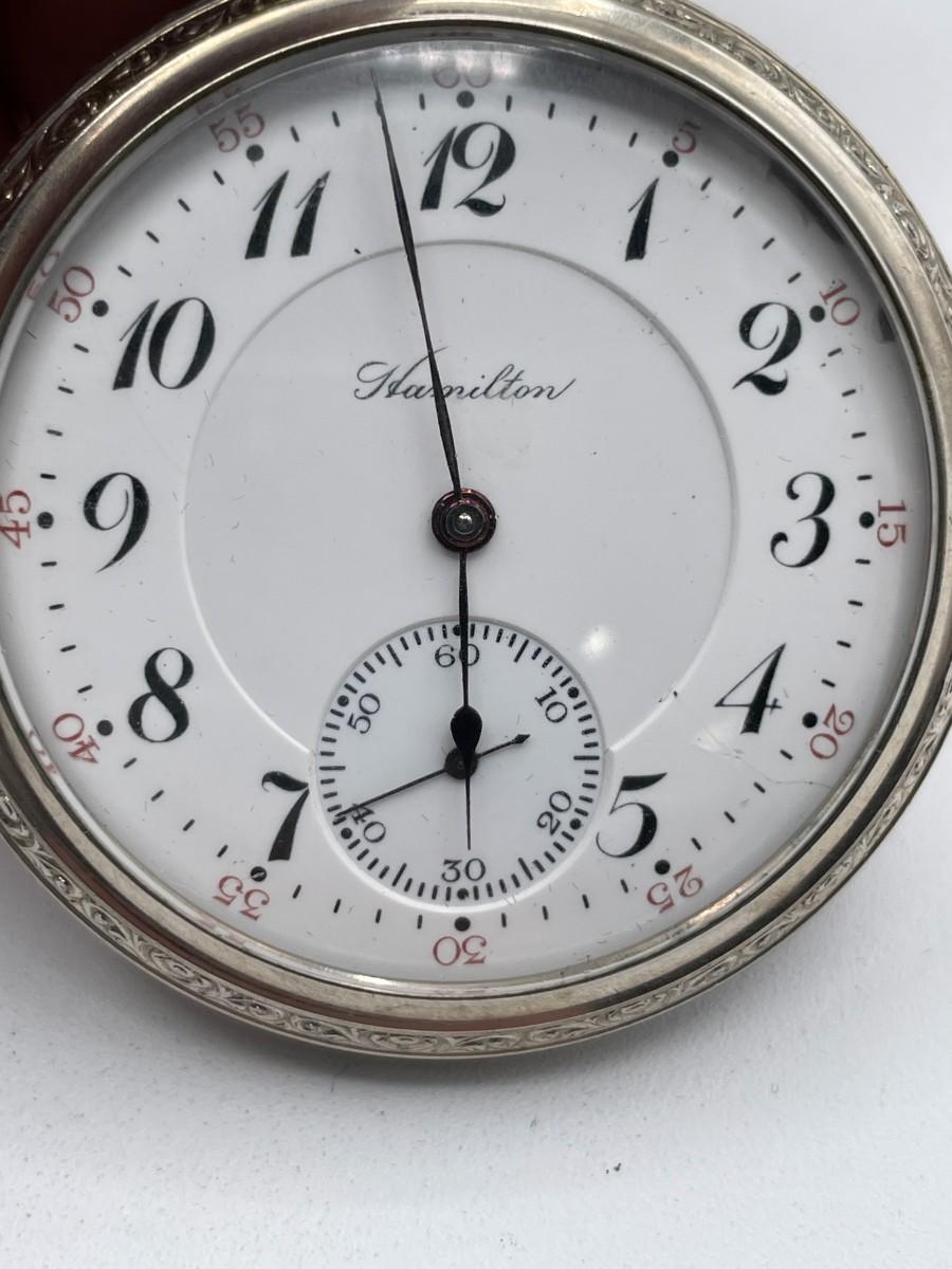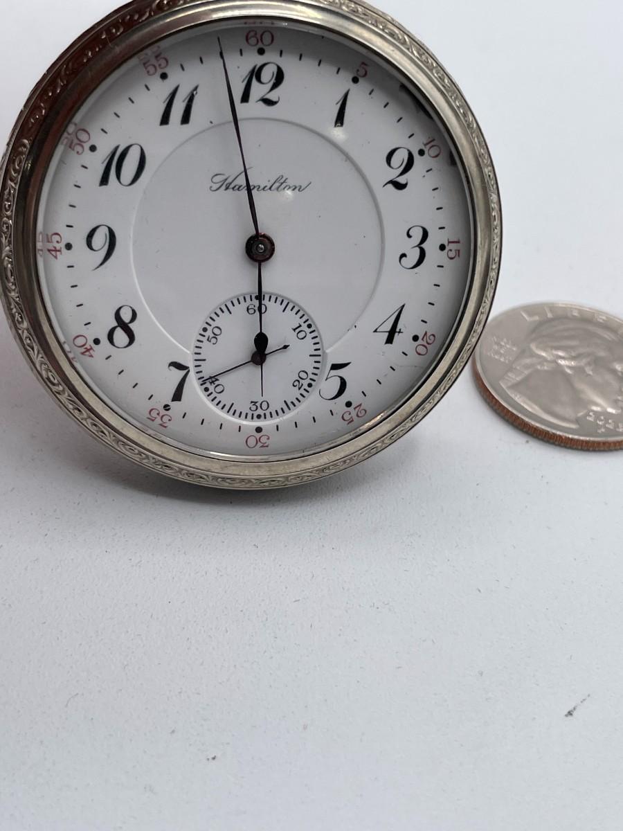 Hamilton Pocket Watch, No. 754525, Size 16s, Prod Yr. 1910, 21 Jewels. Case: Philadelphia Watch Case, Victory, No. 4622851, Silver-tone. Condition - Winder & watch are in working order. This is not a guarantee that all parts are original nor is the watch autheniticated.