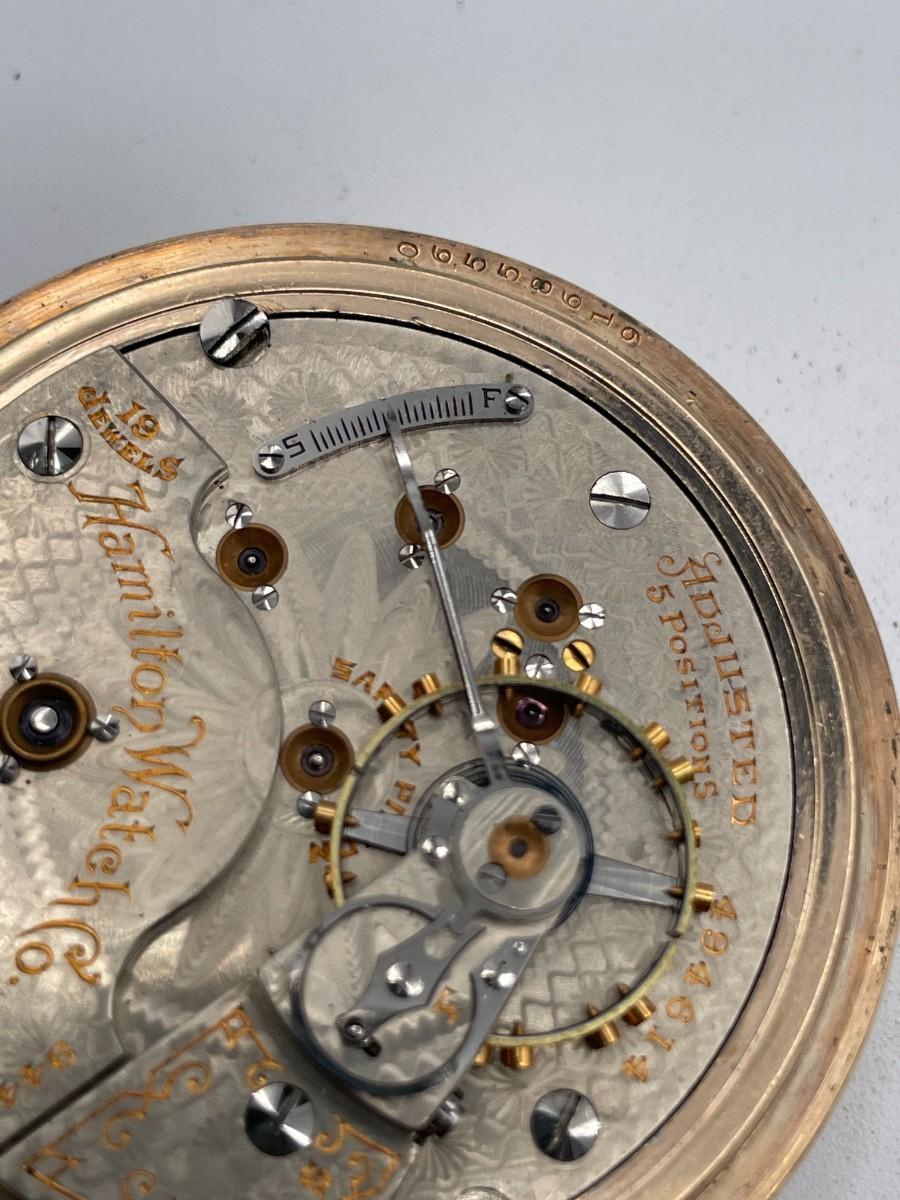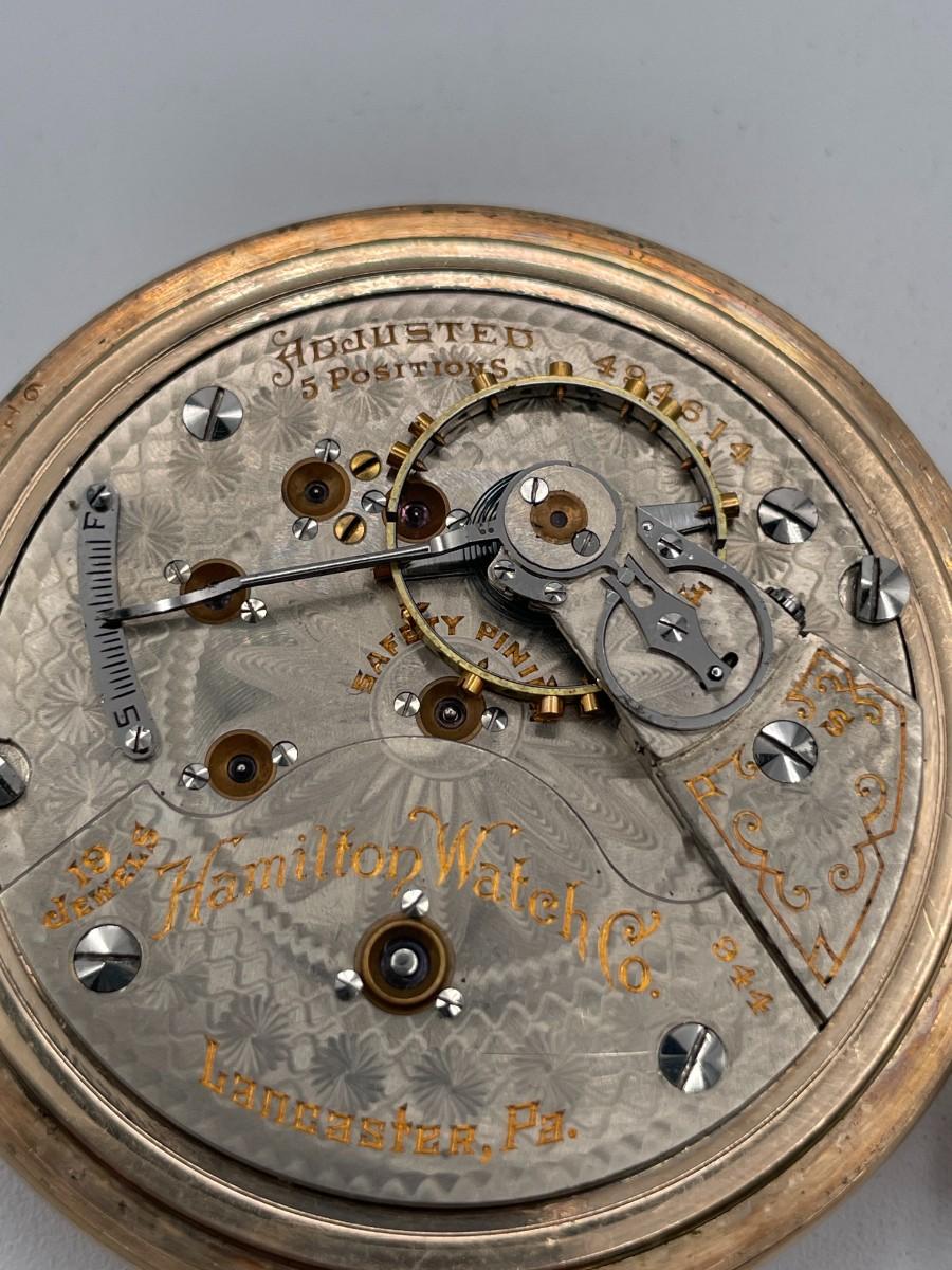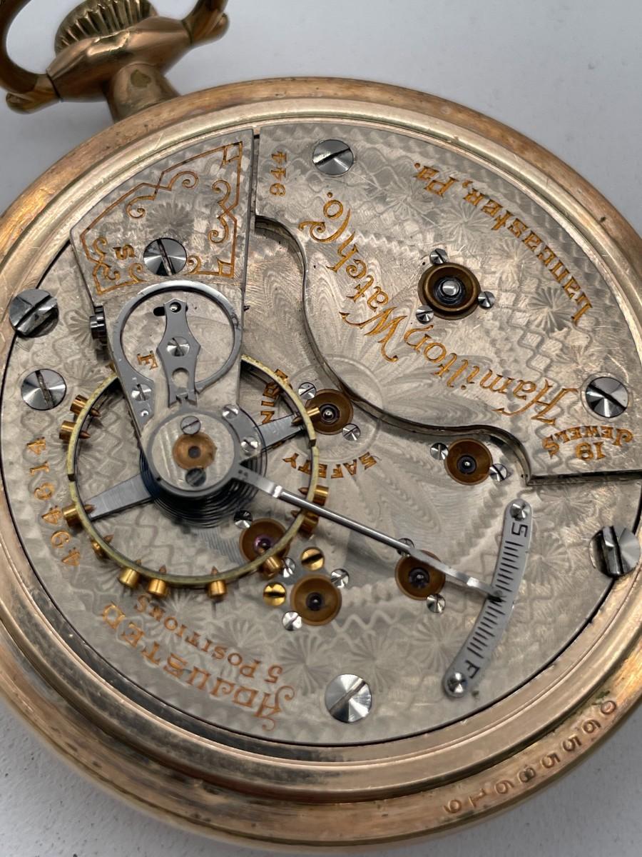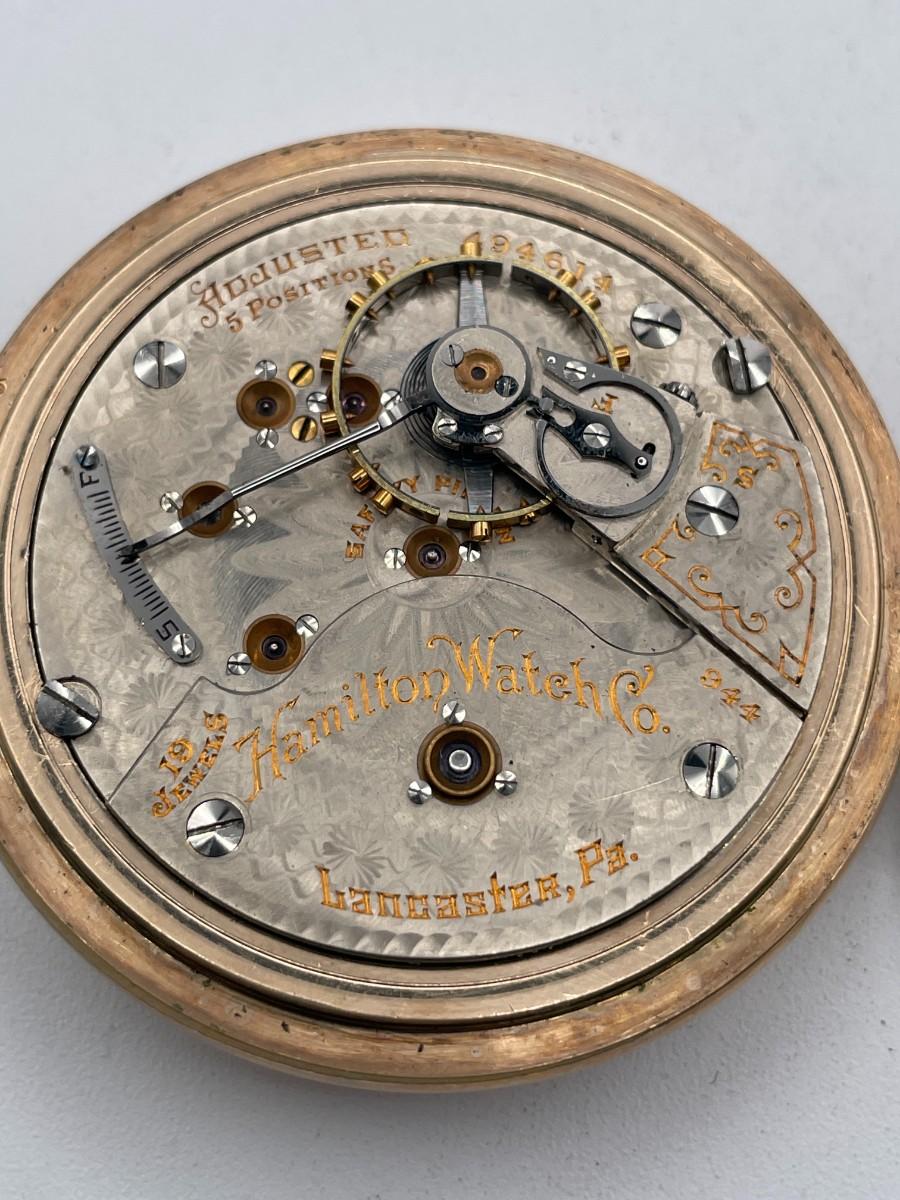 Hamilton Pocket Watch, No. 494614, Size 18s, Prod Yr. 1907, 19 Jewels. Case: No. 6558619, B & B Royal, warr. 20 yrs. Condition - Winder & watch are in working order. This is not a guarantee that all parts are original nor is the watch autheniticated.
