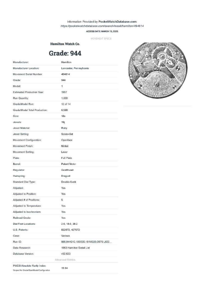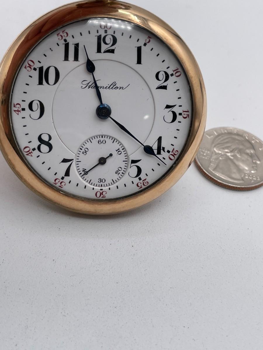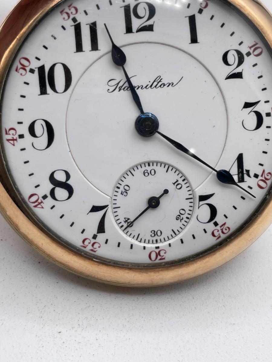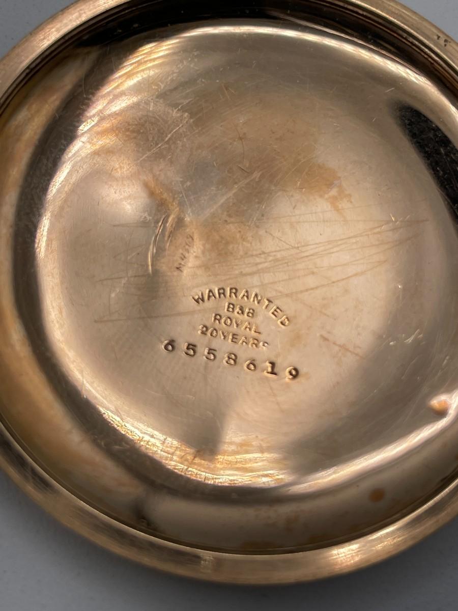 Hamilton Pocket Watch, No. 494614, Size 18s, Prod Yr. 1907, 19 Jewels. Case: No. 6558619, B & B Royal, warr. 20 yrs. Condition - Winder & watch are in working order. This is not a guarantee that all parts are original nor is the watch autheniticated.