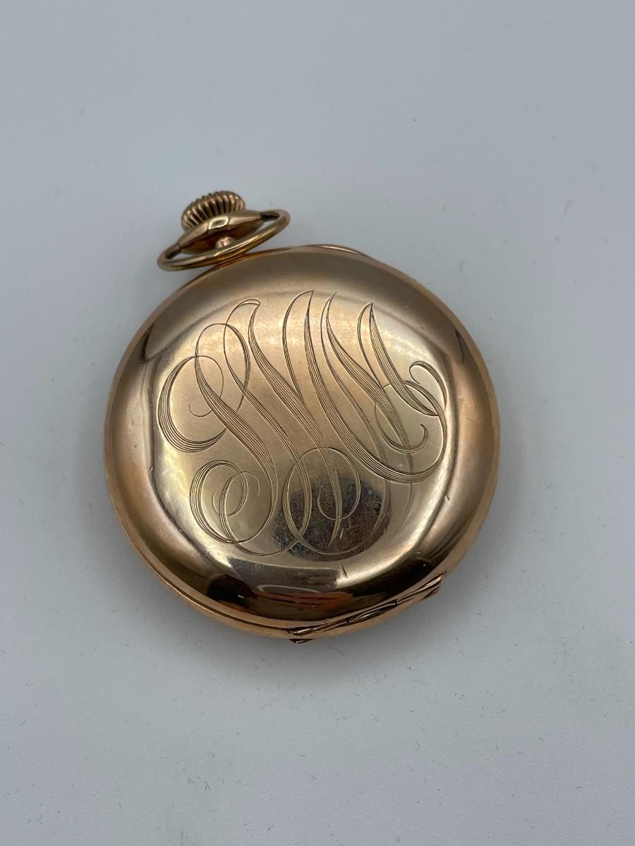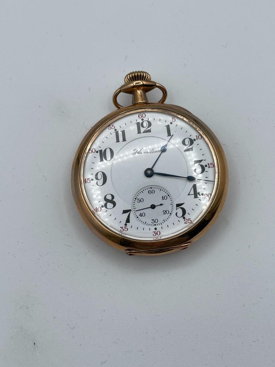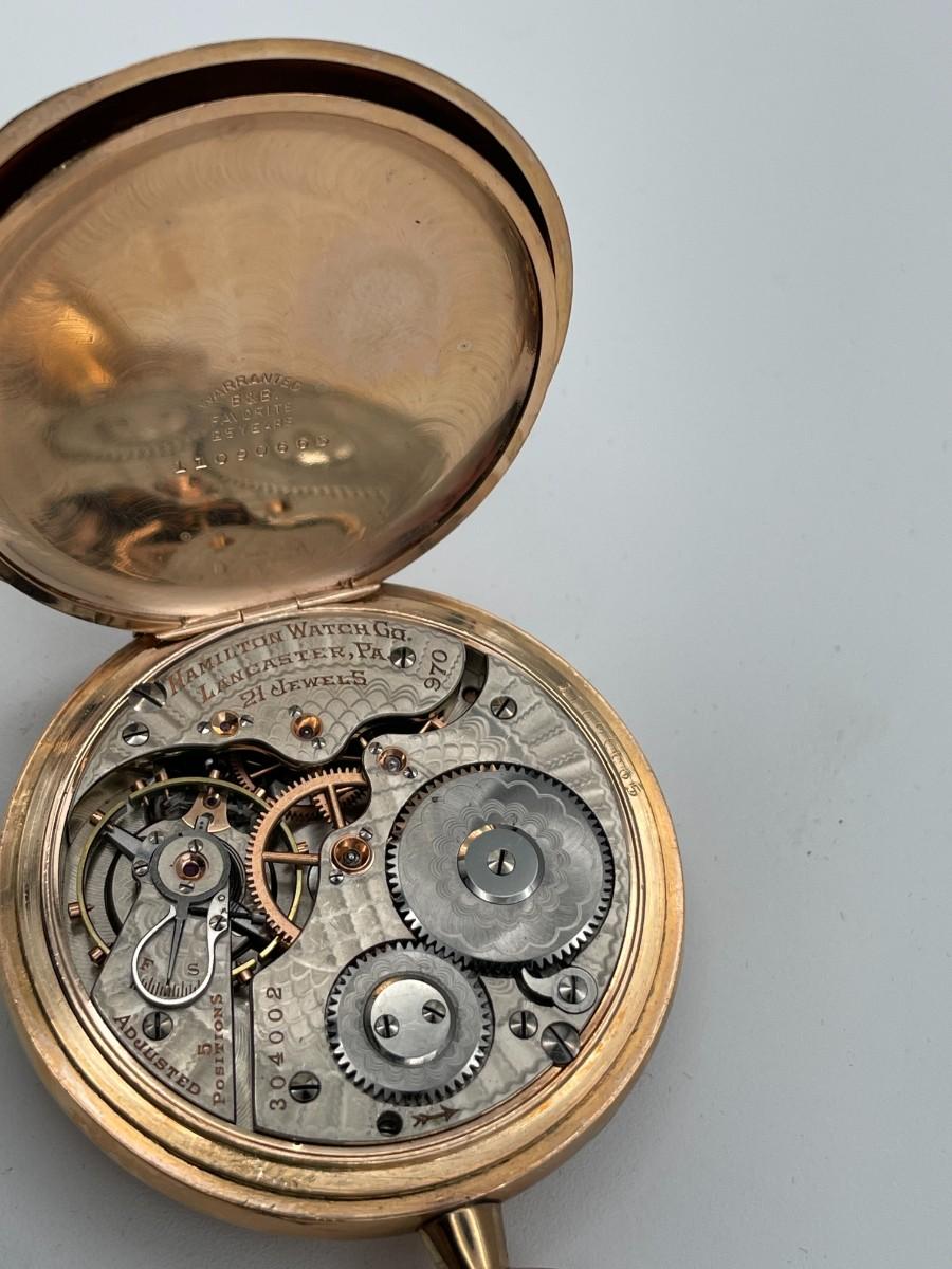 Hamilton Pocketwatch Railroad Model - Gold Tone - Size 16S- Watch Number (304002) with Gold Filled Case B &B Number ( 11090665). Condition - Winder & watch are in working order. This is not a guarantee that all parts are original nor is the watch autheniticated. Estimated Value - $505 - $670. Year 1903