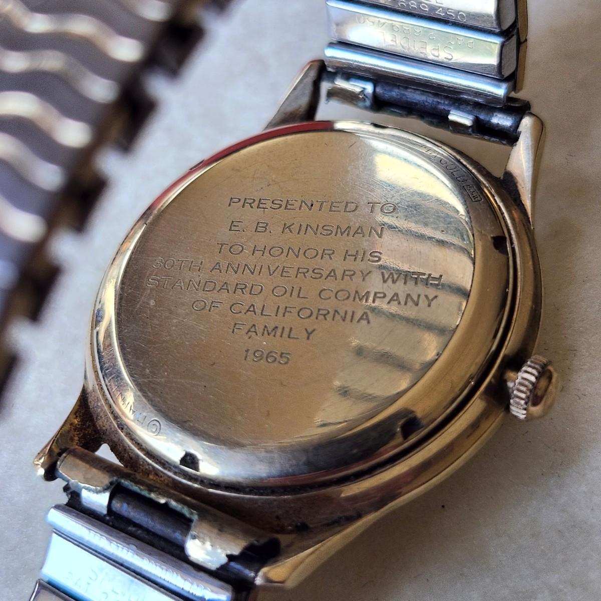 Presentaion watch, with engraved wording on the back. It may be 10K or 14K gold, we did not open the back. A jeweler put a new battery in.