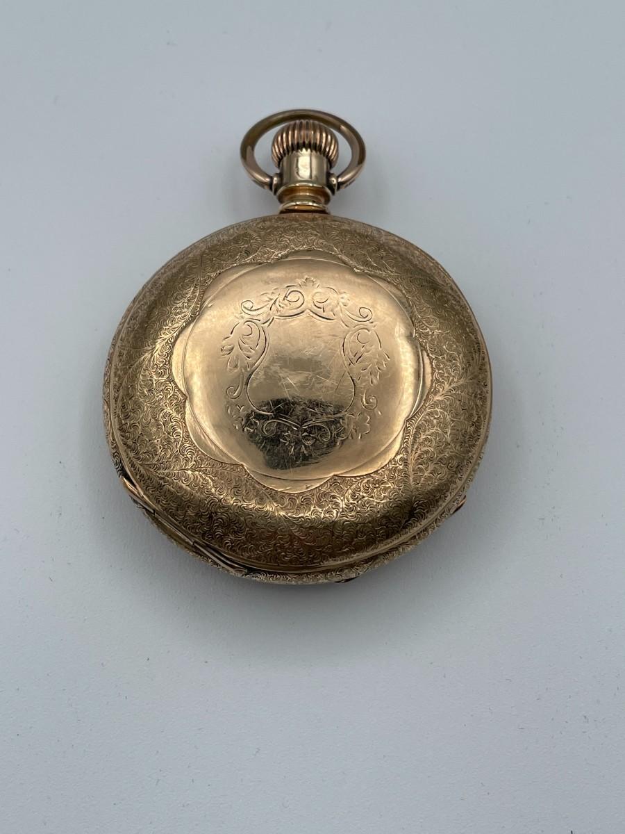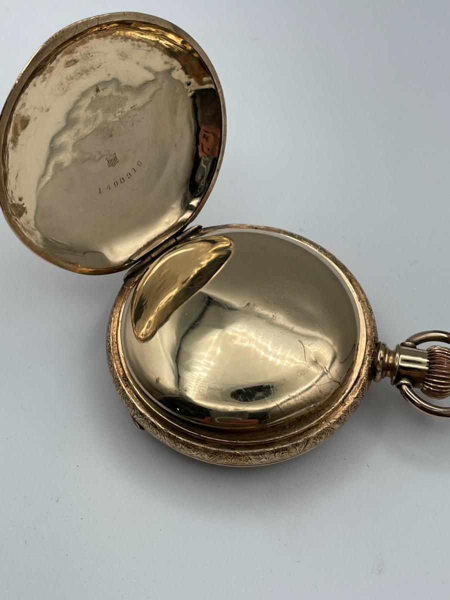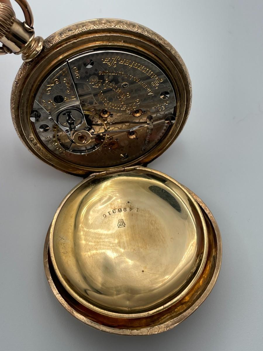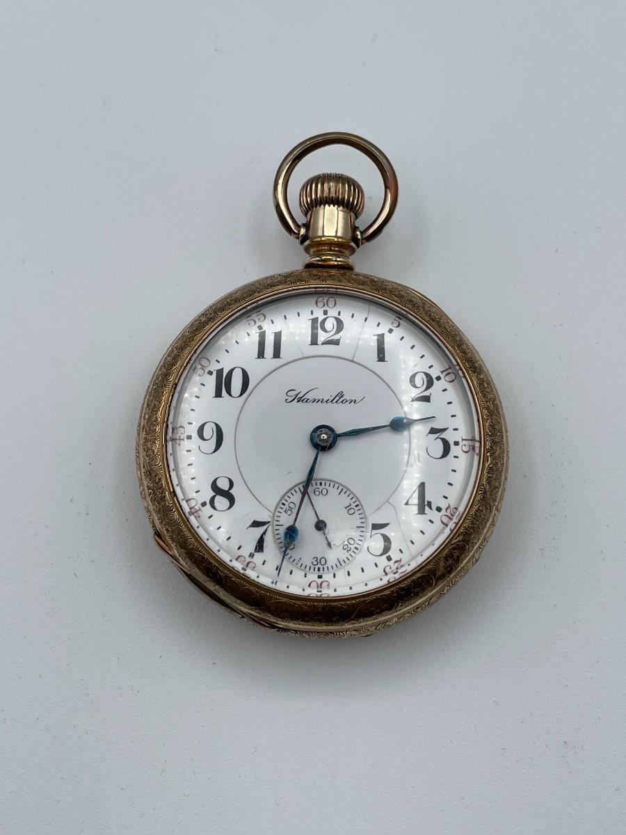 Hamilton Watch Company Pocketwatch Gold Tone - 21 Jewels - Adjusted 5 positions Size 18S - Watch Number (596818) with Gold Tone Case Number (1498316). Condition - Winder & watch are in working order. This is not a guarantee that all parts are original nor is the watch autheniticated. Estimated value $405 - $535. Year 1908