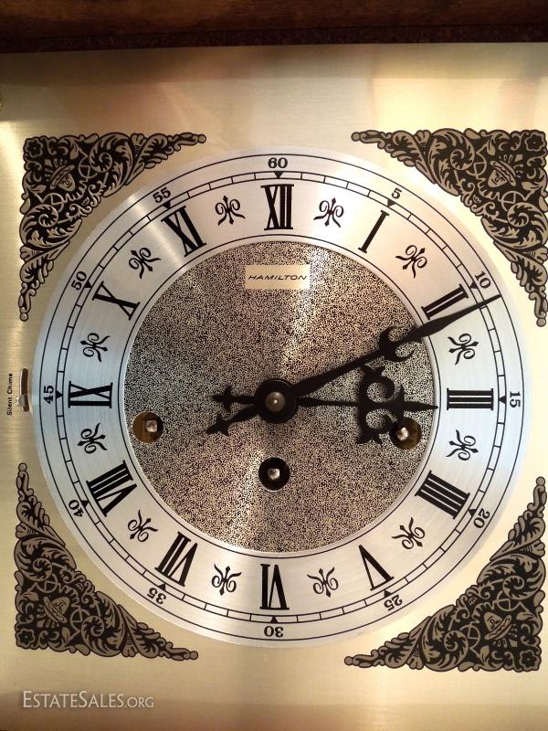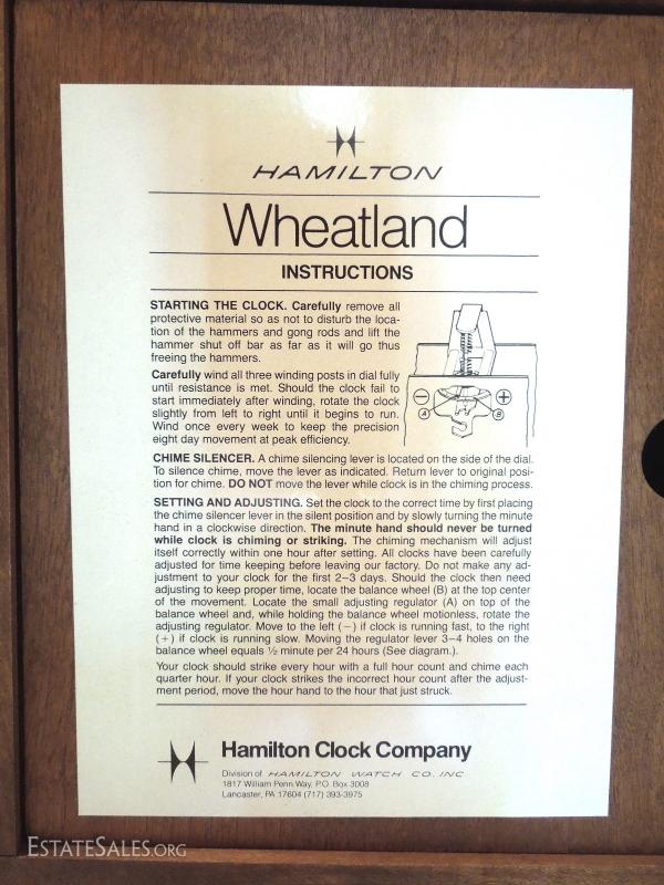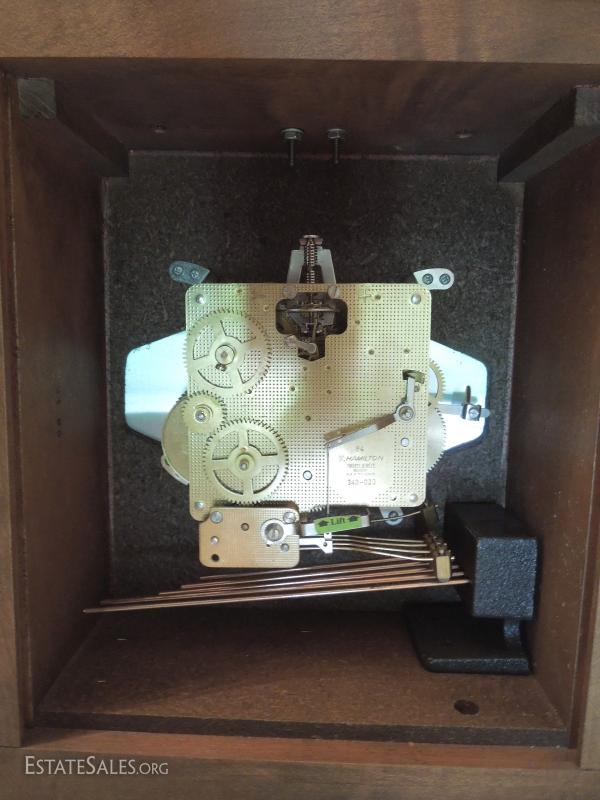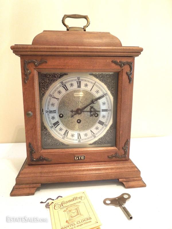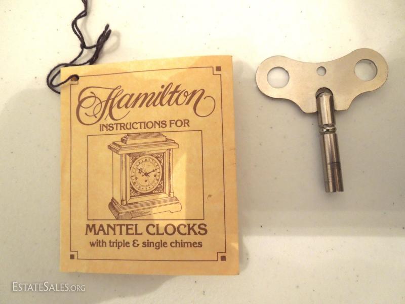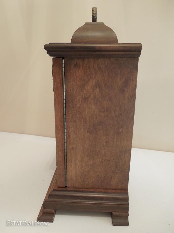 Wood case is made of walnut. Metal face and hands. Winds with key. Includes booklet. Seems to keep time. In very good condition.