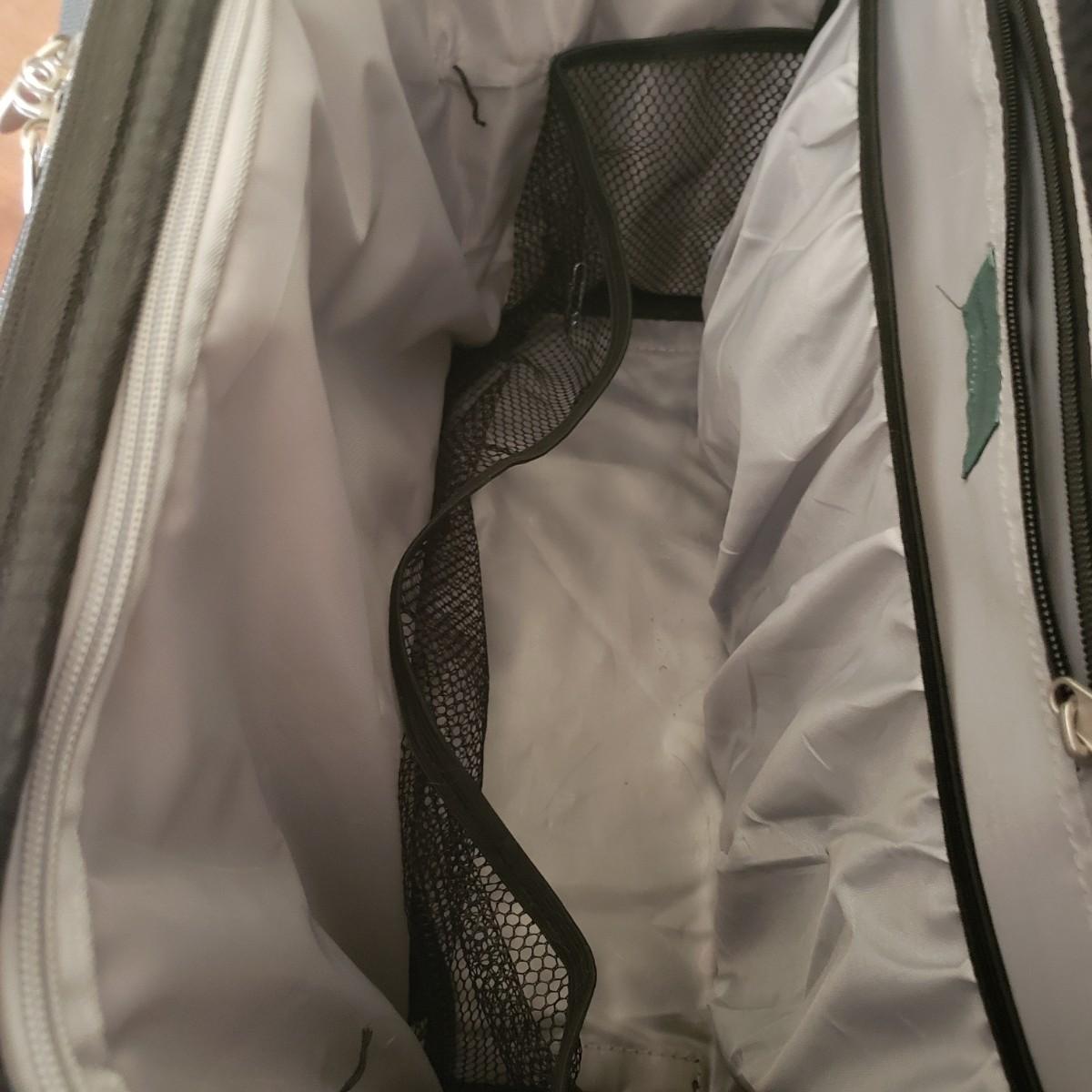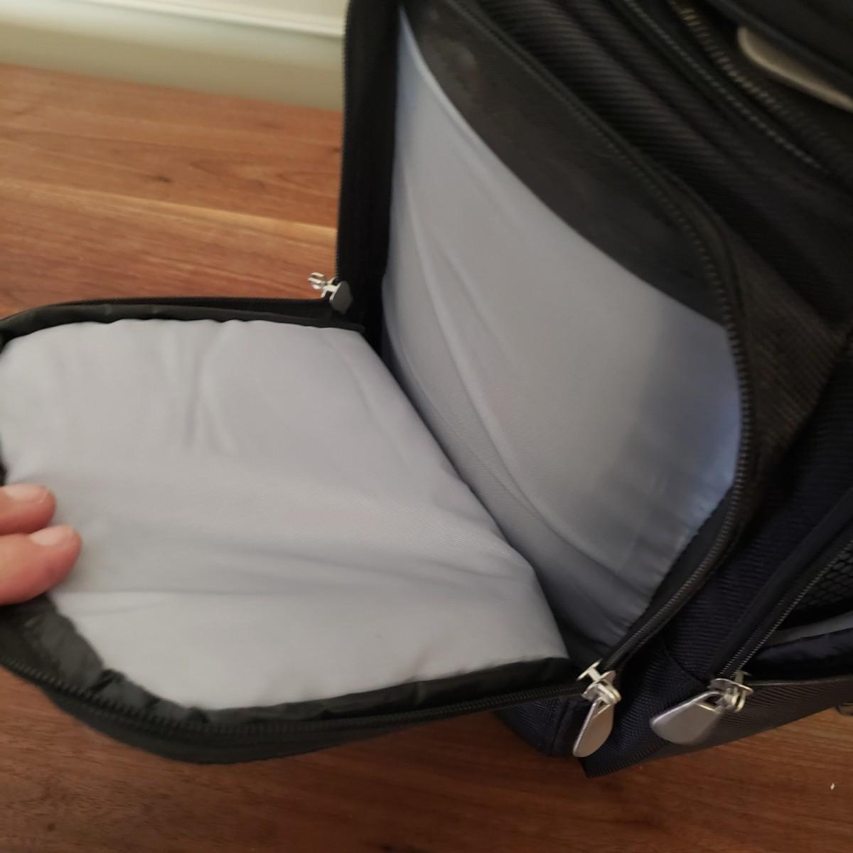 This rolling carry-on can be rolled from curb to airline aisle, then placed under the seat in front of you. The handle collapses, and multiple side pockets and a spacious interior are easy to reach during flight. The padded sides are sturdy enough to hold a laptop safely, and the top compartment can be unzipped to expand an extra 3". Nylon case with zippers and in-line skate wheels. Measures 16" x 9" x 14"H.