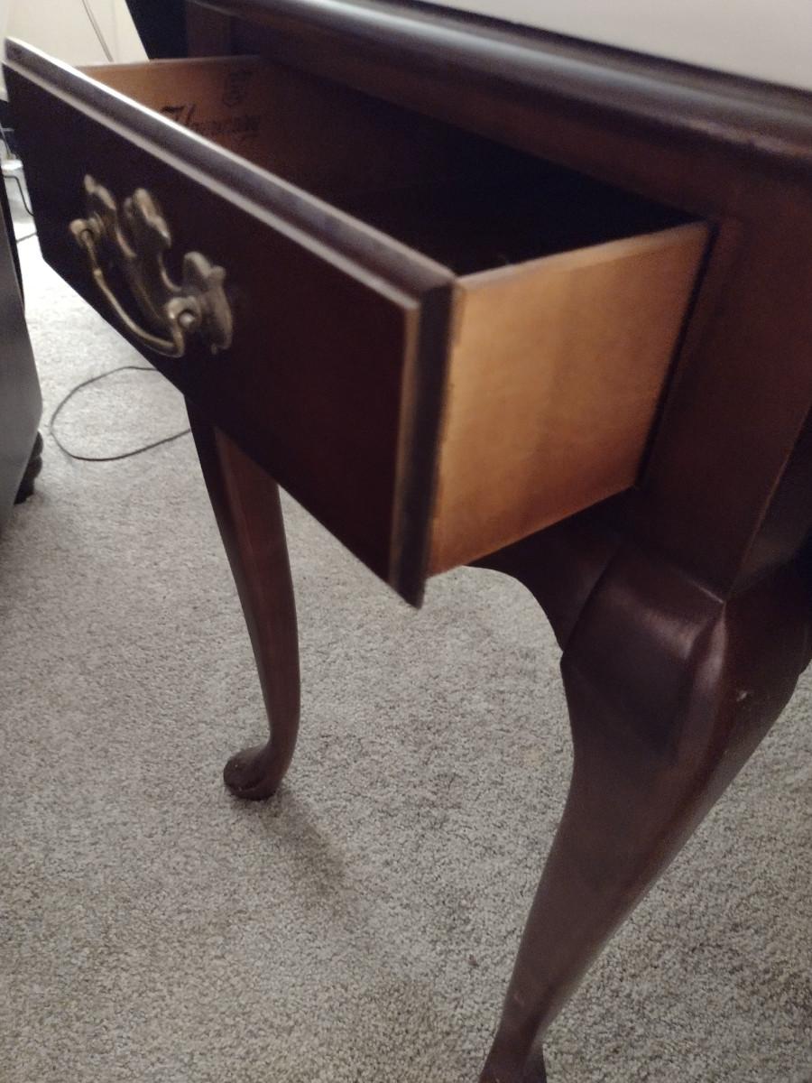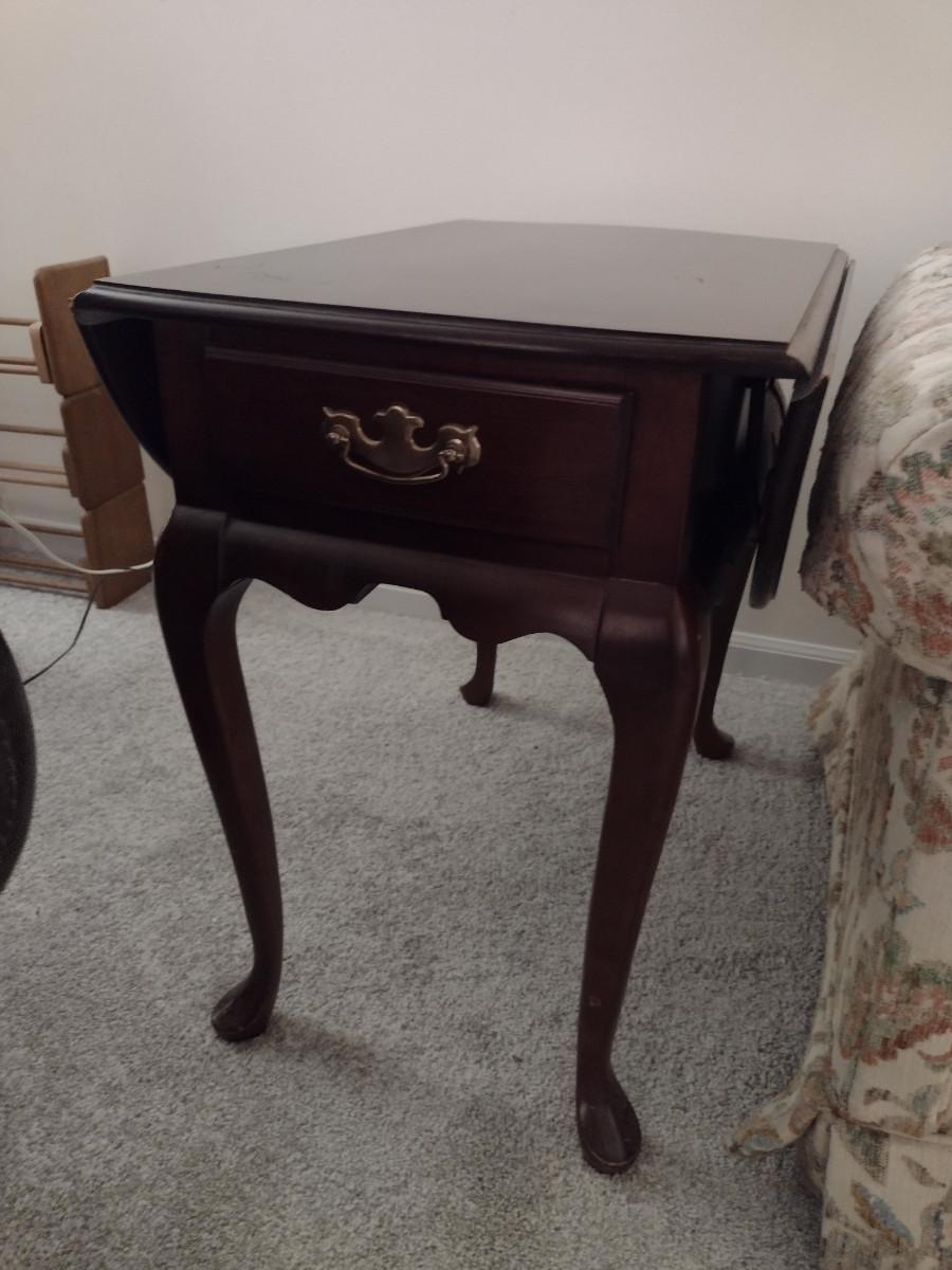 Hammary Wooden Chippendale Style Double Drop Leaf Side Table with Drawer (Choice A). Item measures approx 28" deep, 28" tall. Item is 18" wide when both leaves are down. Each leaf adds approx 9" to width when raised. Item is in used but good condition- finish has a couple areas of wear.