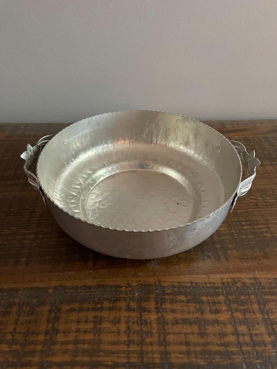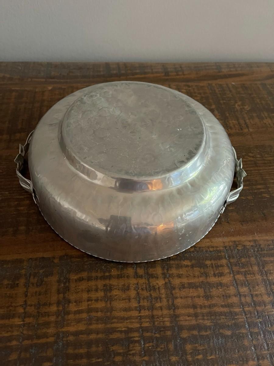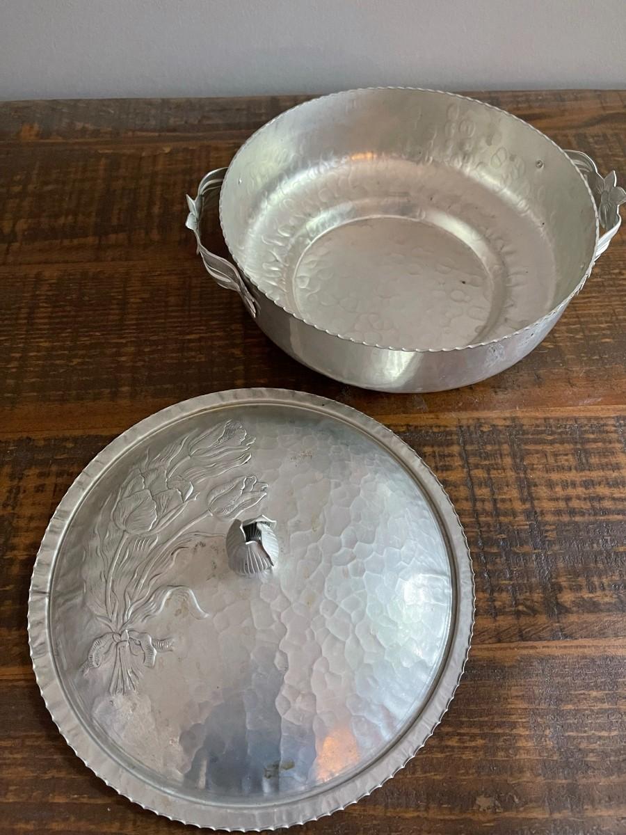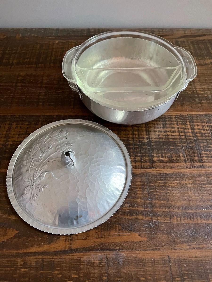 Hammered Aluminum, 10" covered serving bowl with lid and glass insert divided into 2 compartments.
