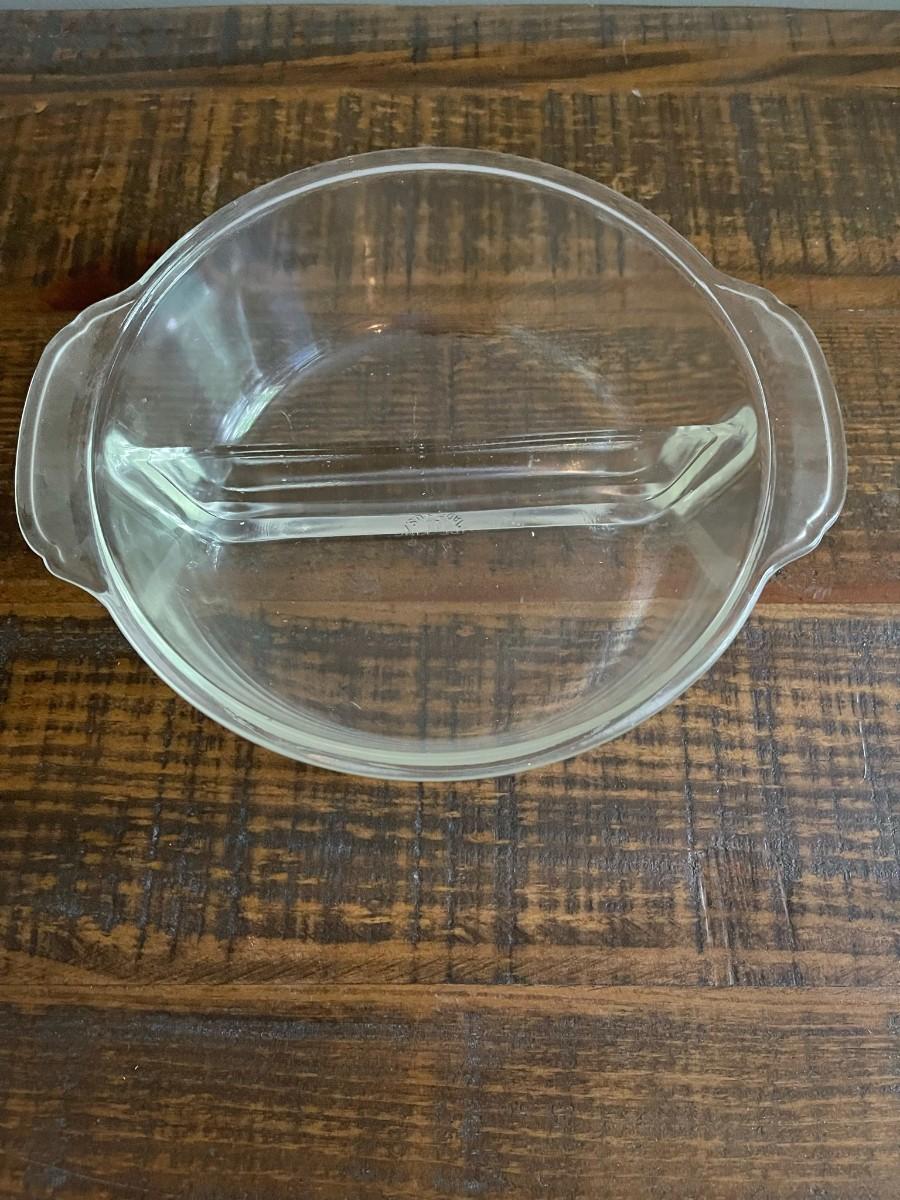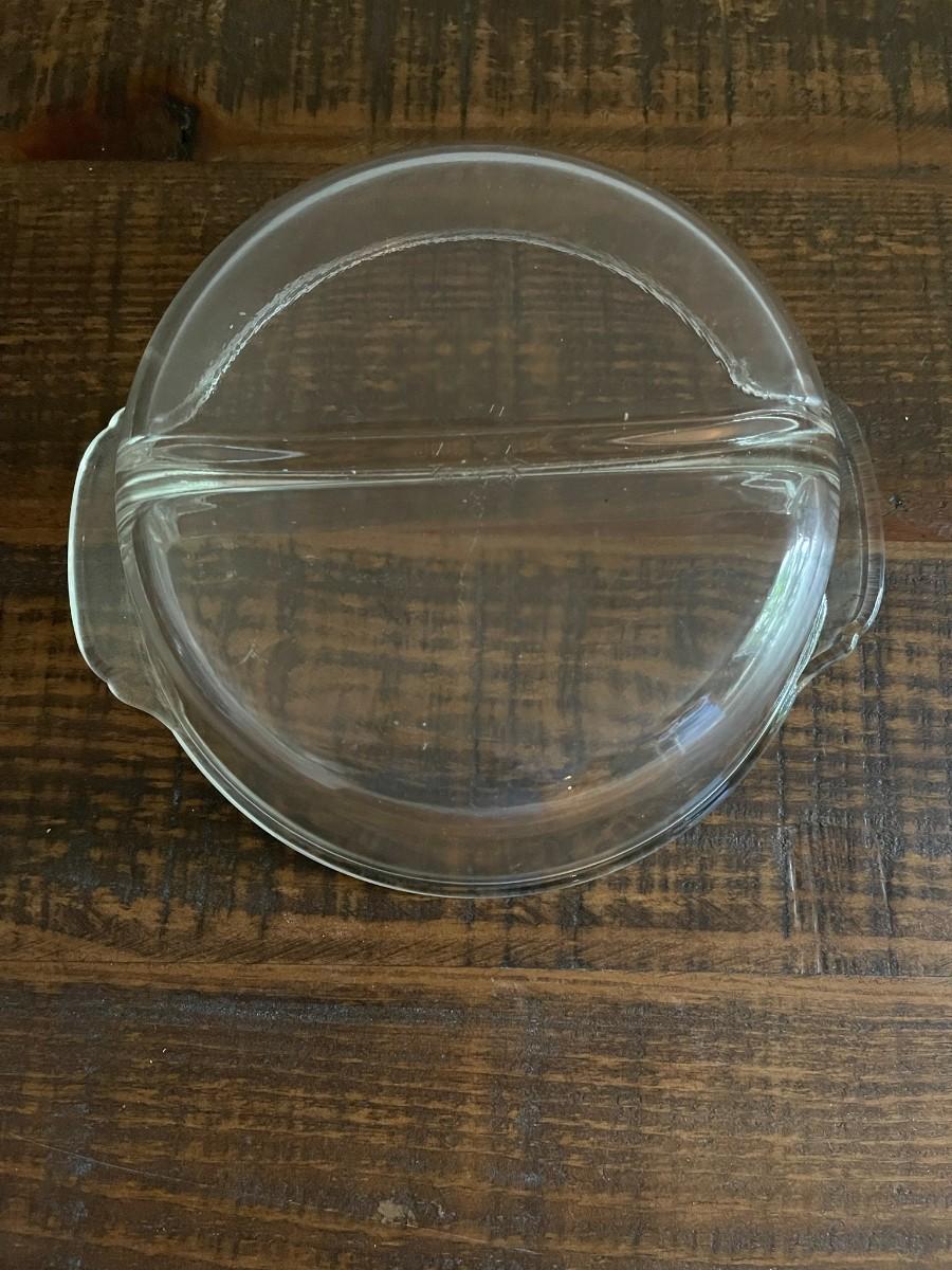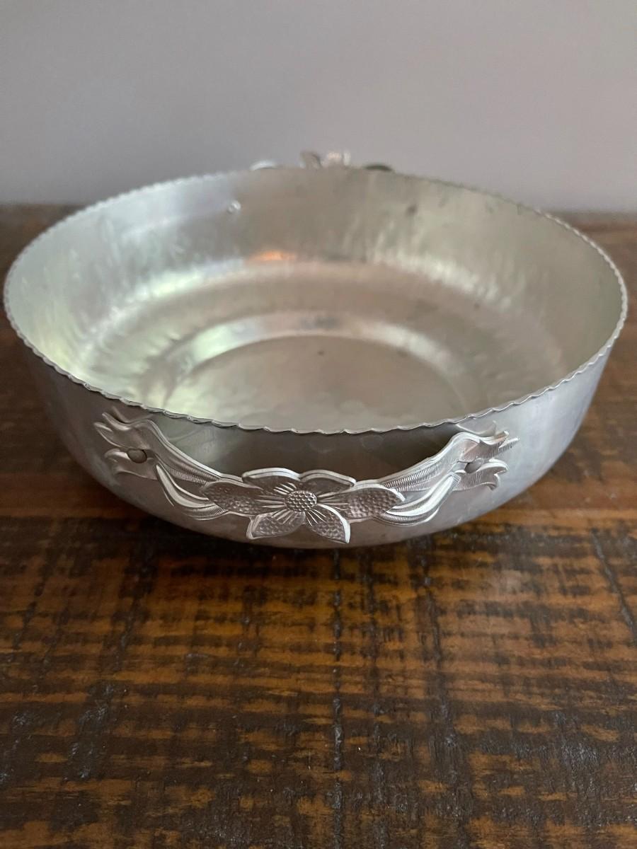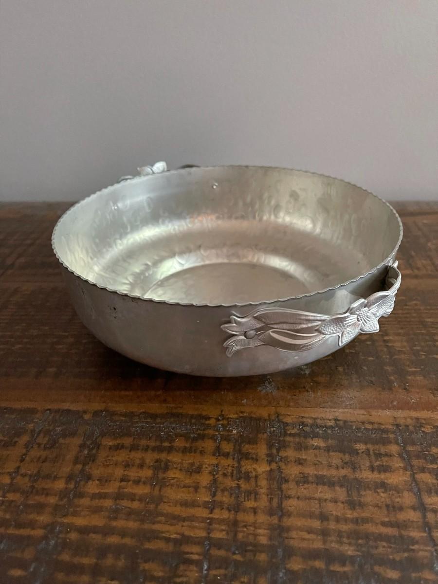 Hammered Aluminum, 10" covered serving bowl with lid and glass insert divided into 2 compartments.