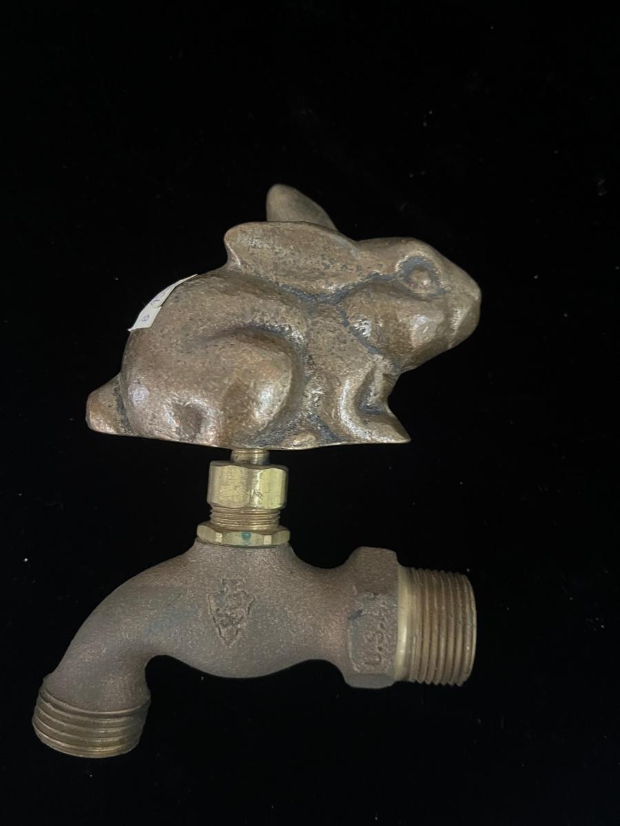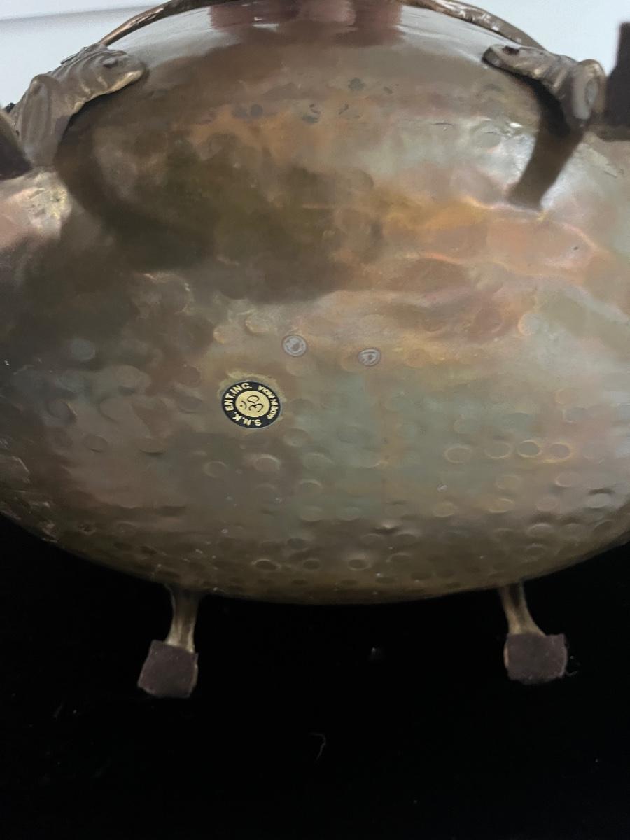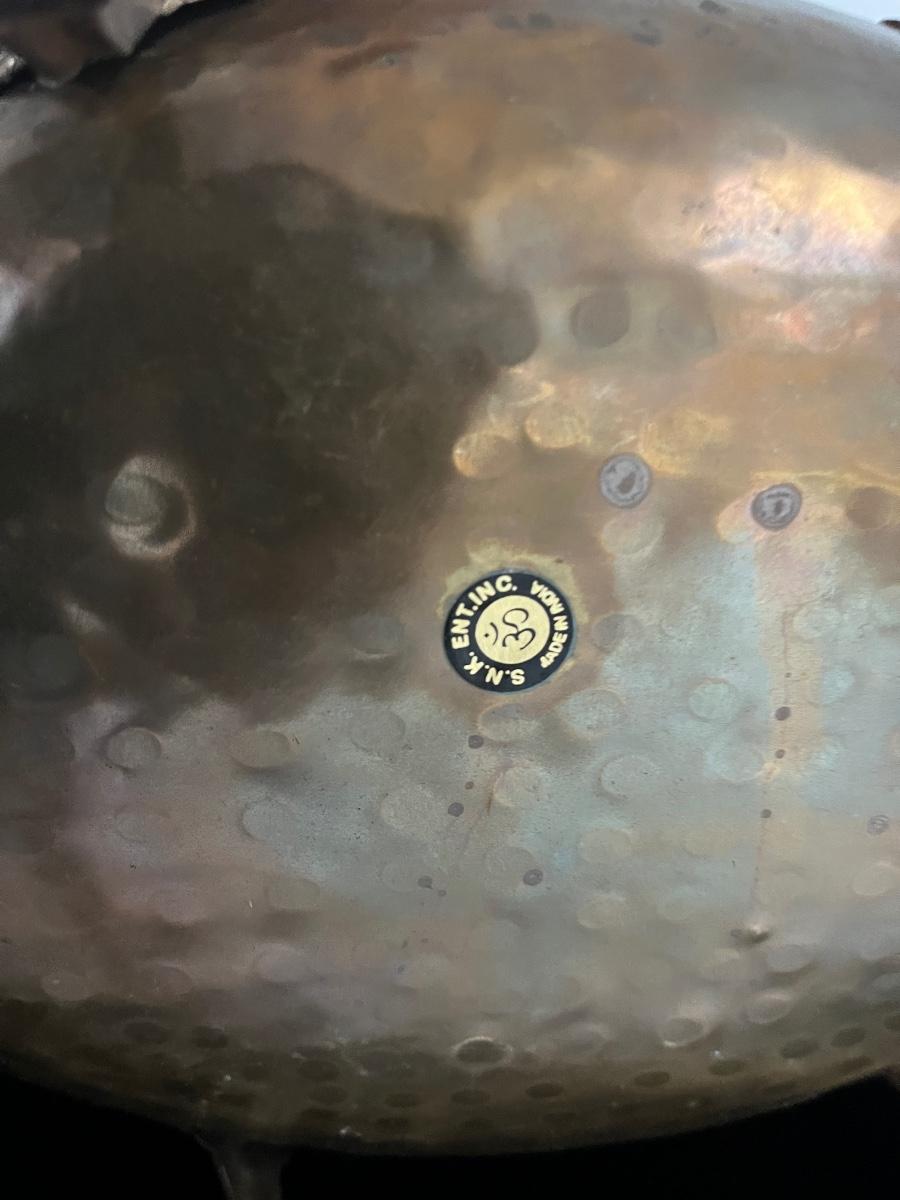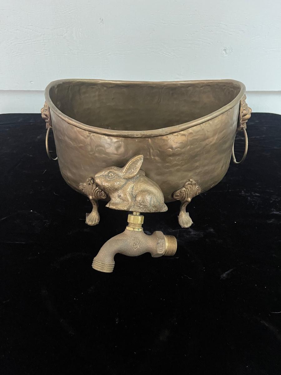 Lot includes a hammered copper pot that is made in India. Pot measures 12.5” x 8.5” x 7”H. Also includes a spigot with a metal rabbit handle. Pot has loose stones in bottom.