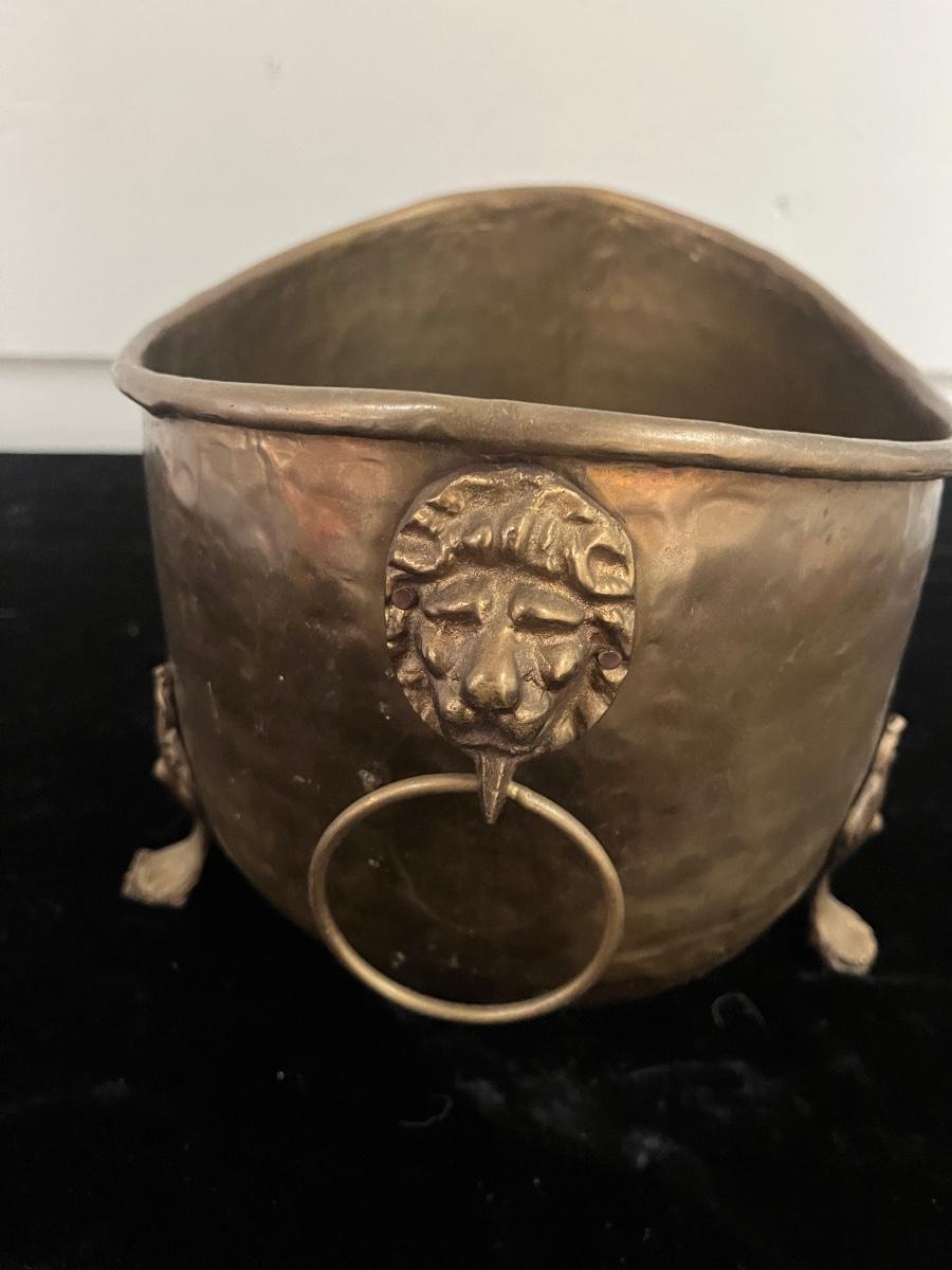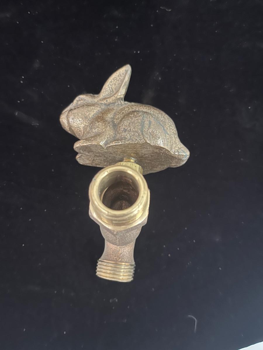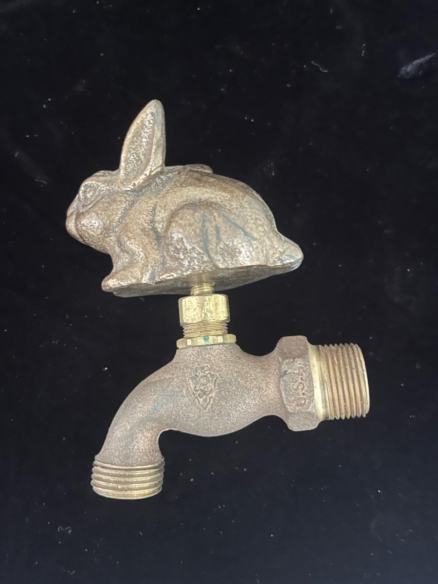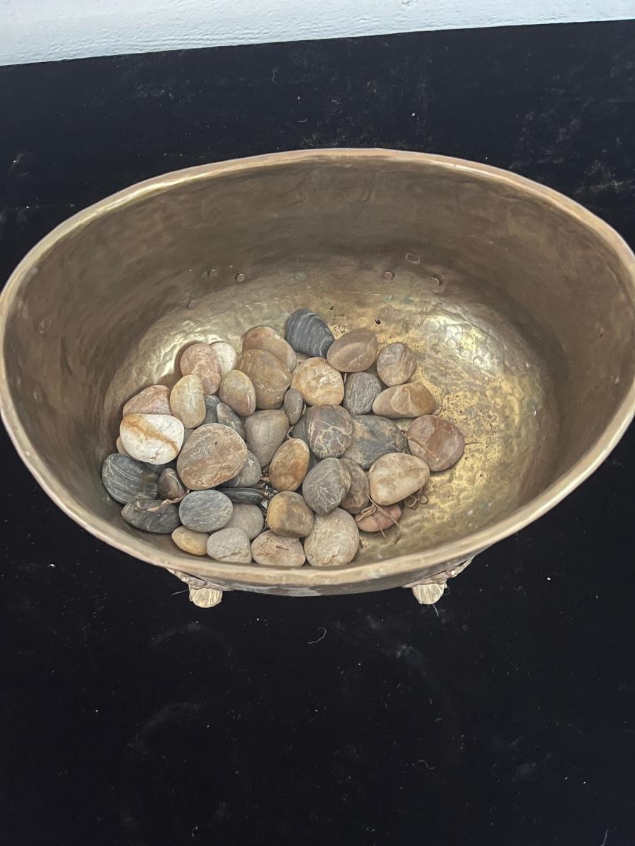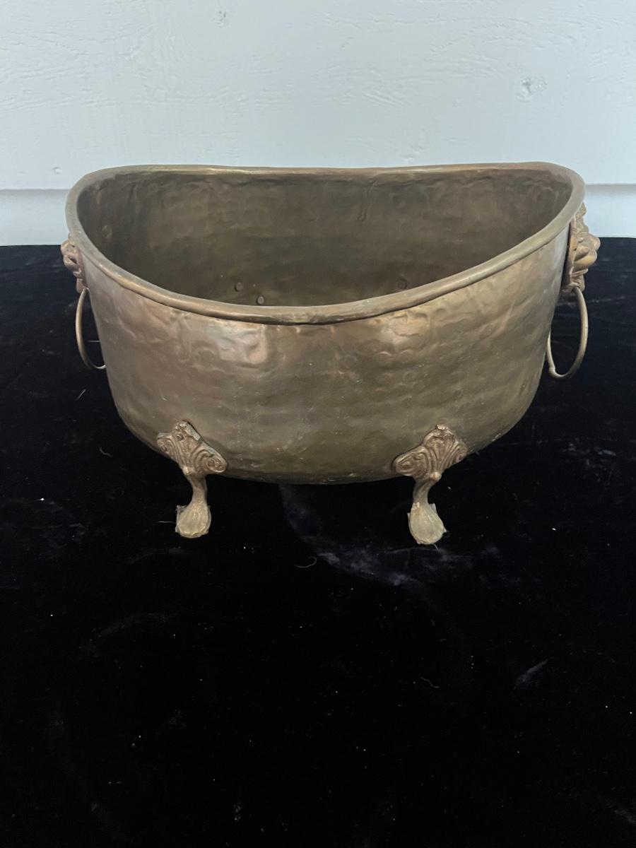 Lot includes a hammered copper pot that is made in India. Pot measures 12.5” x 8.5” x 7”H. Also includes a spigot with a metal rabbit handle. Pot has loose stones in bottom.
