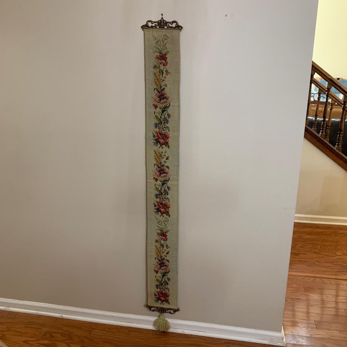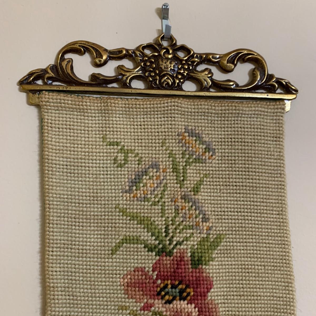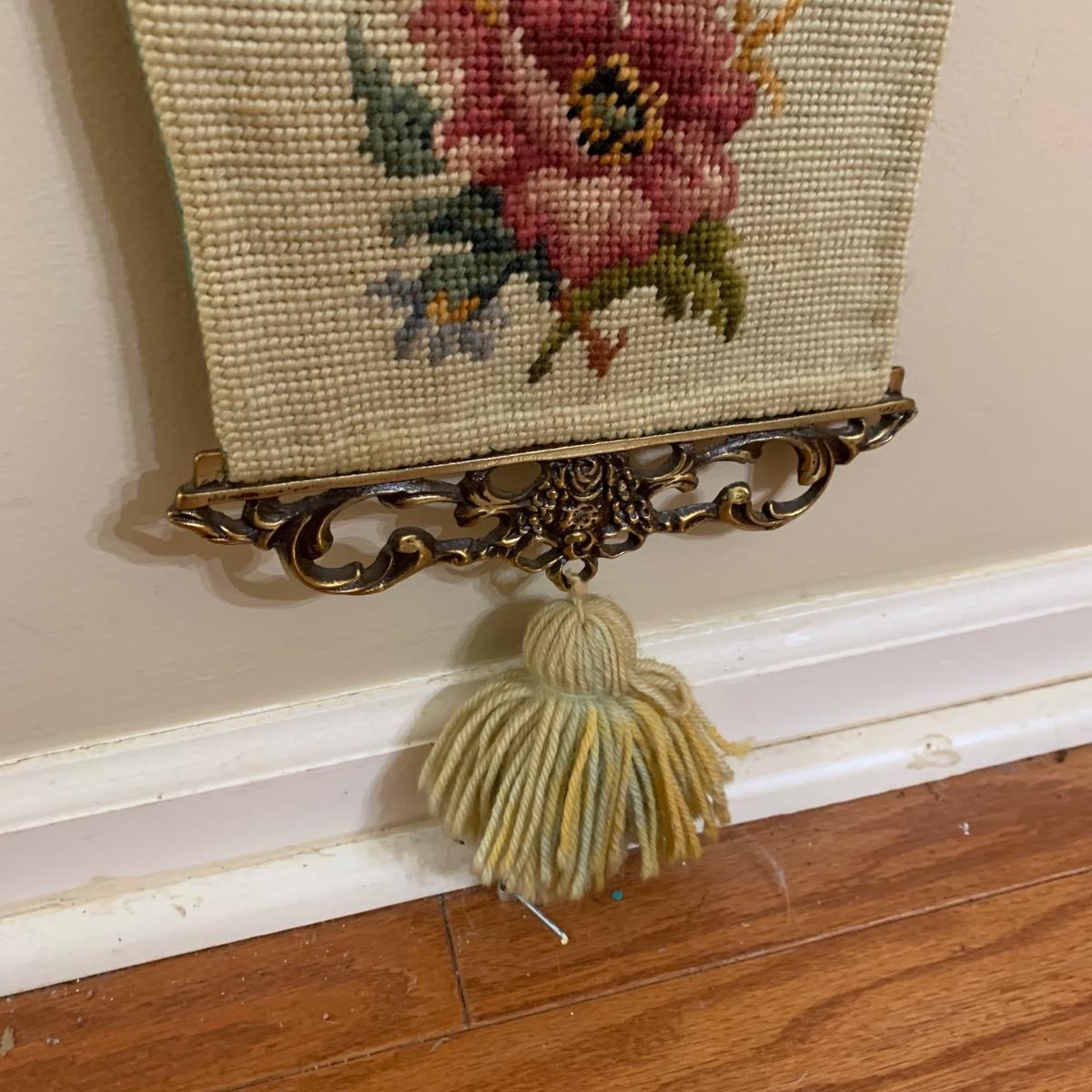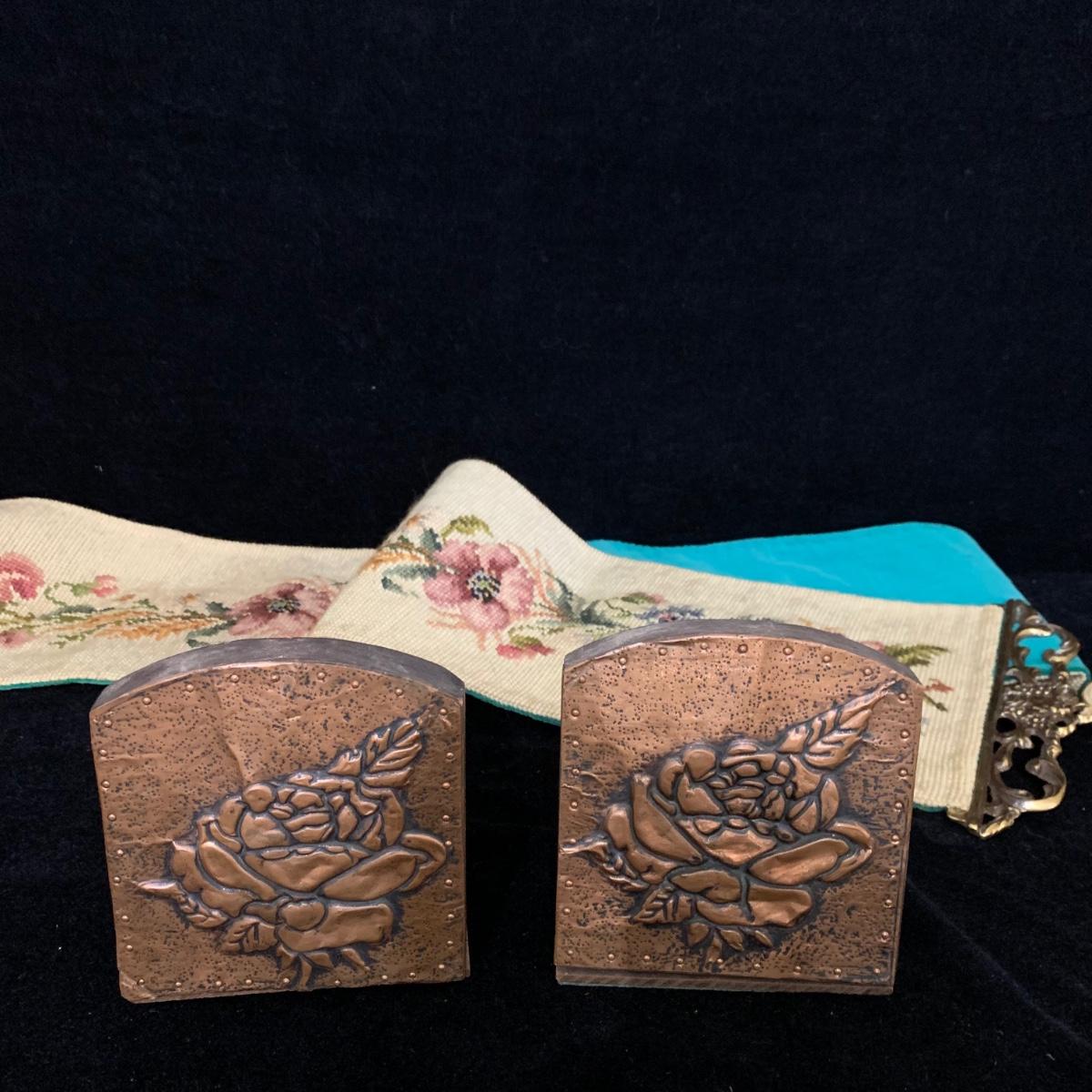 Unique and lovely hammered copper rose bookends on wooden backs. Bookends are 5”x 5.5”. Their bases are loose and need small repairs to reattach sturdily. The long needlepoint wall hanging features a floral motif and has ornate brass pieces on the top and bottom, as well as a tassel attached to the bottom. The wall hanging measures 8” x 69”.