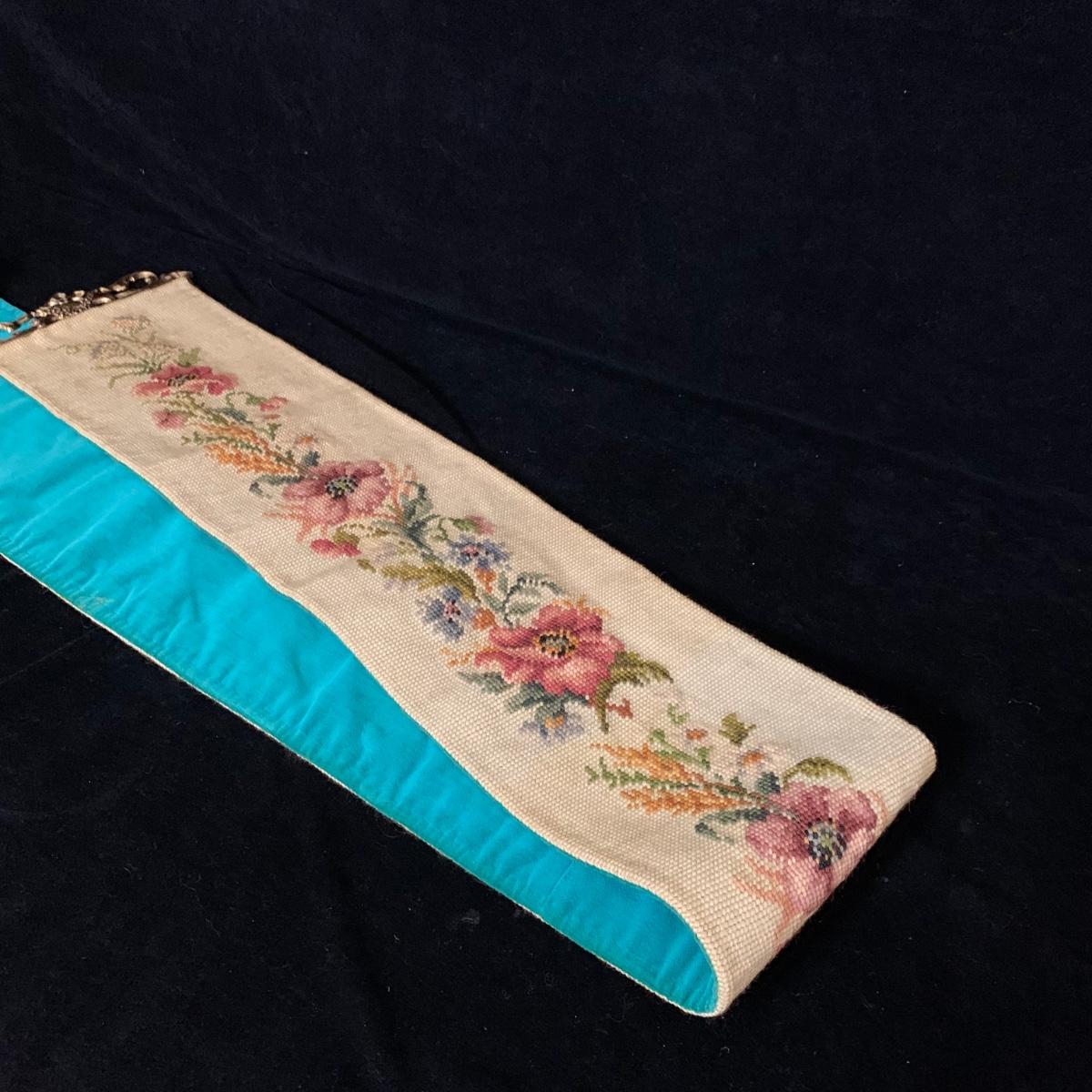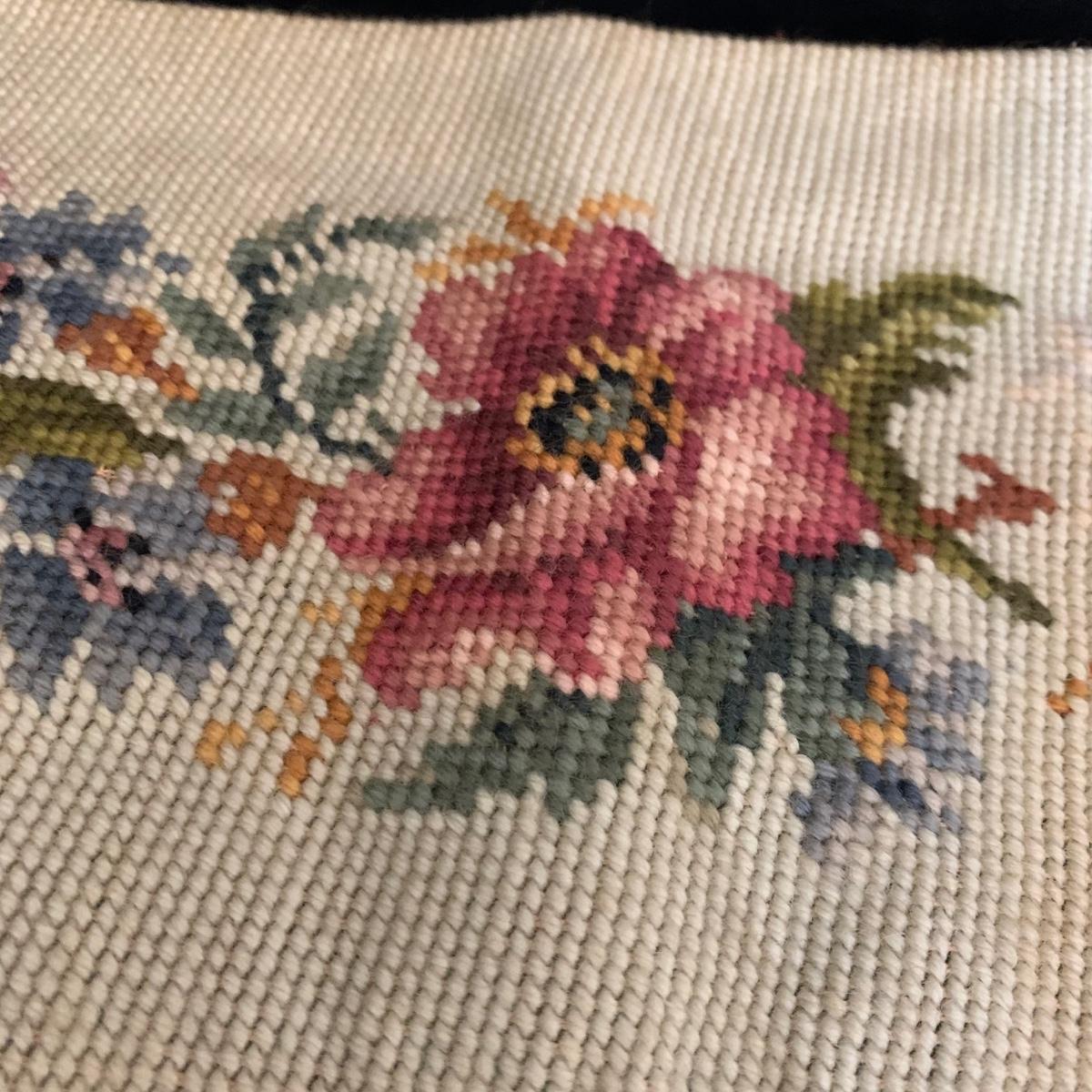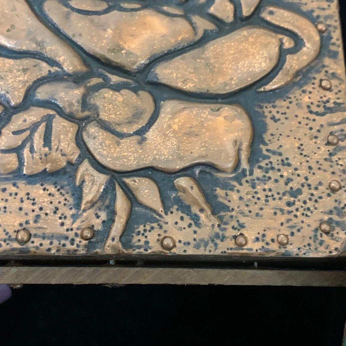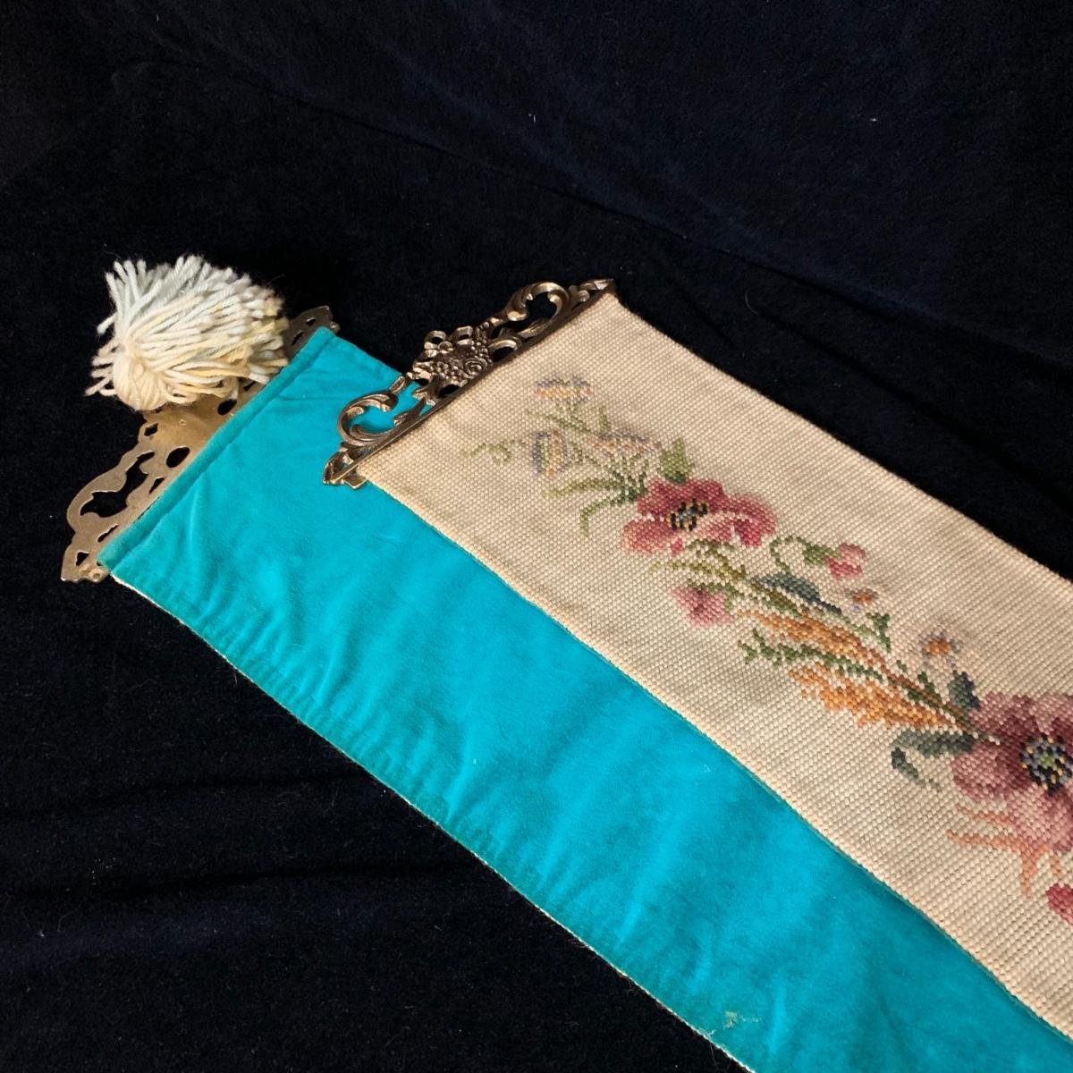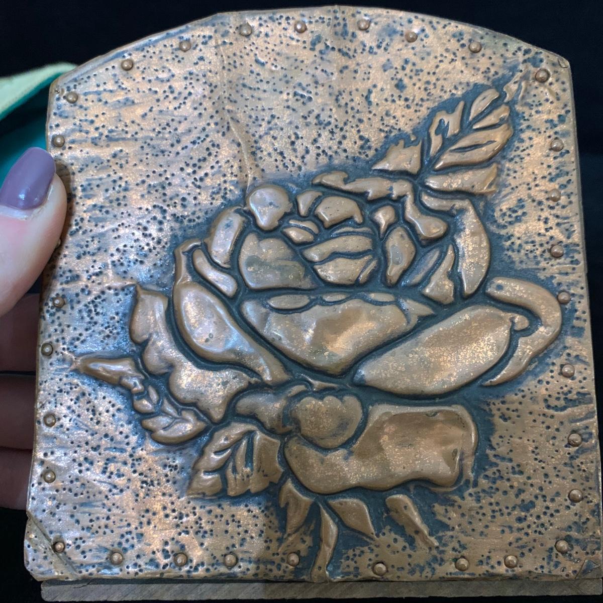 Unique and lovely hammered copper rose bookends on wooden backs. Bookends are 5”x 5.5”. Their bases are loose and need small repairs to reattach sturdily. The long needlepoint wall hanging features a floral motif and has ornate brass pieces on the top and bottom, as well as a tassel attached to the bottom. The wall hanging measures 8” x 69”.
