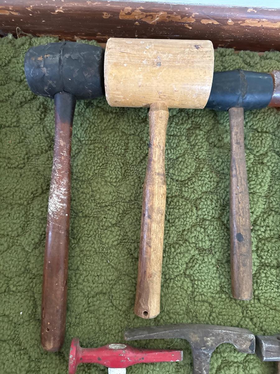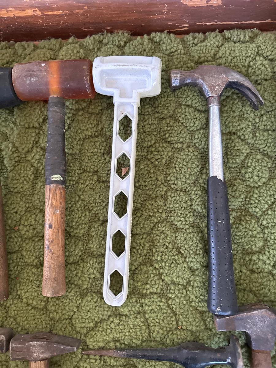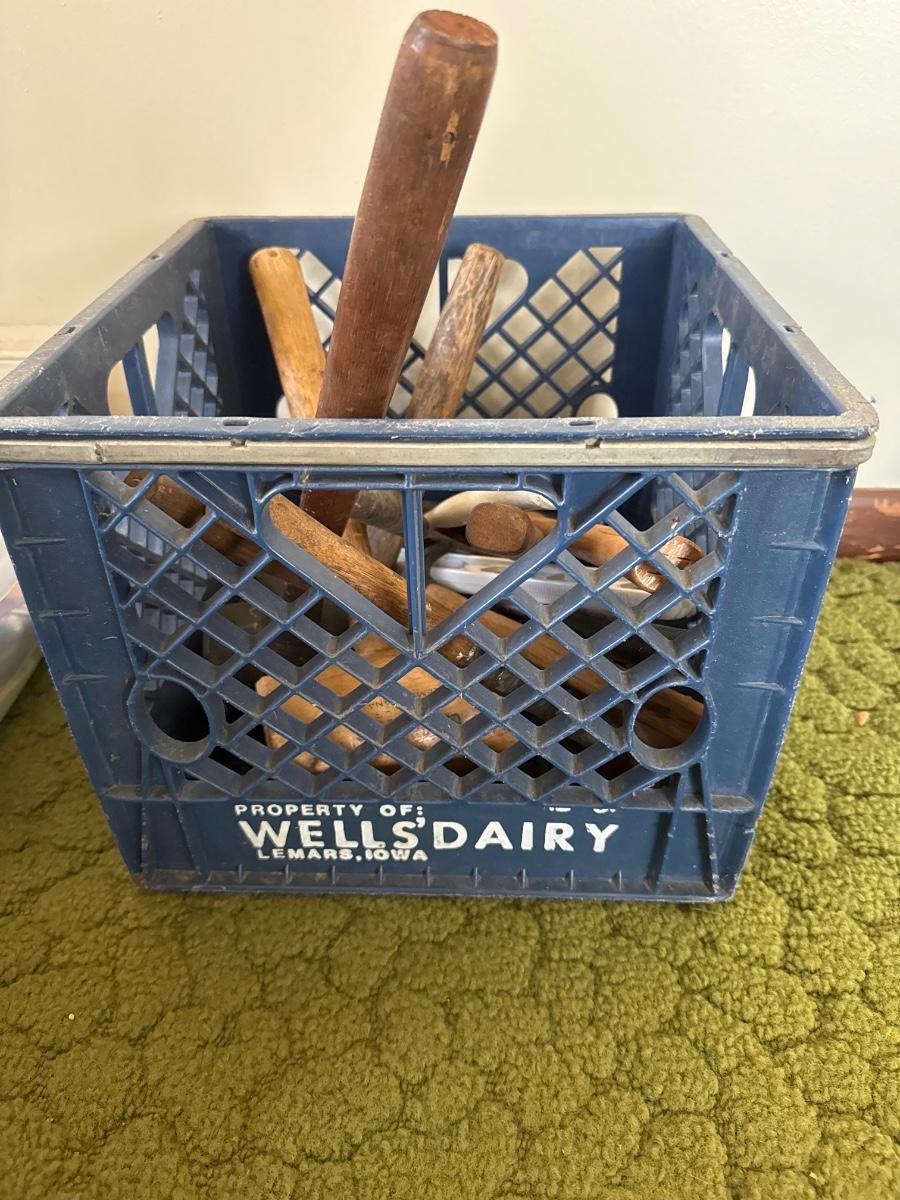 Includes 12 Hammers and mallets In a blue Wells Dairy plastic milk crate.