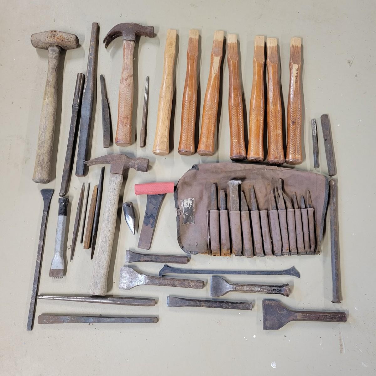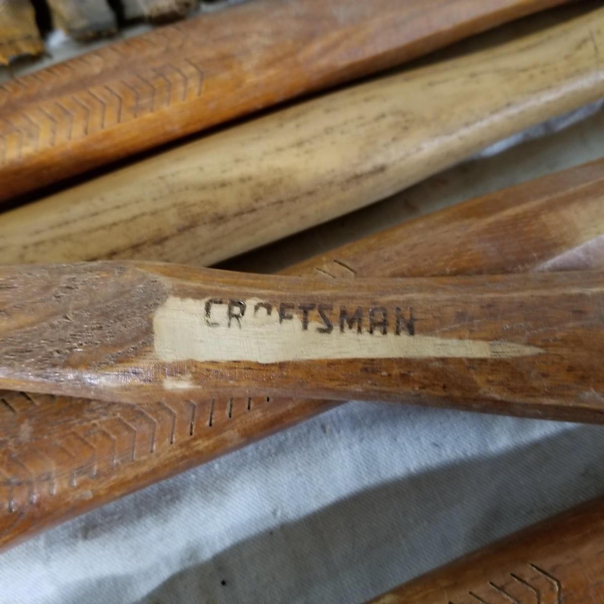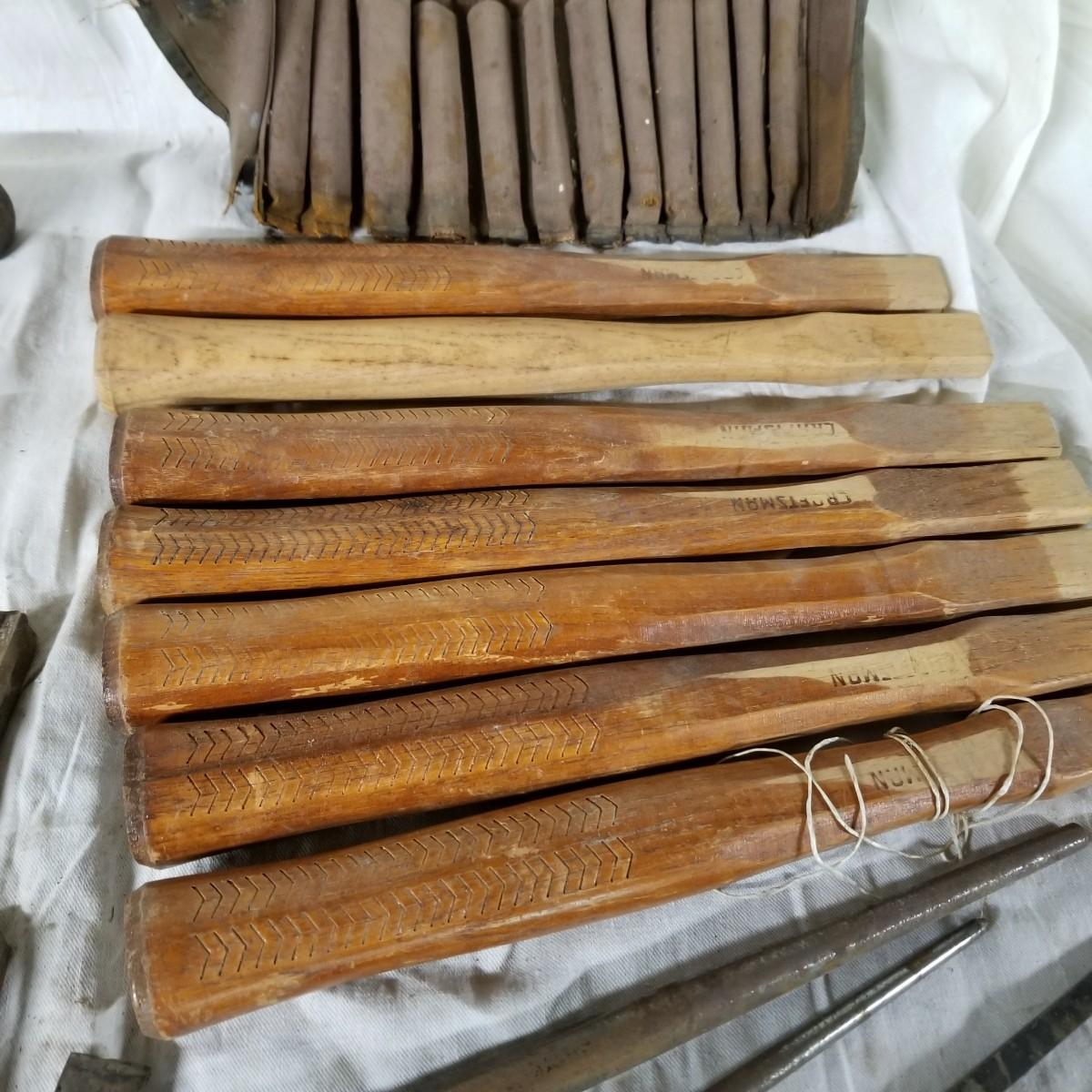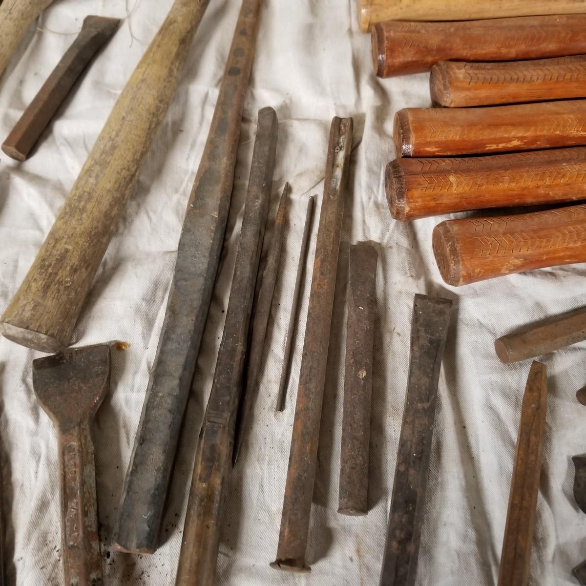 Hammers, hammer handles, chisels.  Seven Craftsman wood handles, various cold chisels, drifts, punches.  Brick chisels, star drill. Longest item is 16 1/2".  All items show some wear and tear.  Local pickup only.