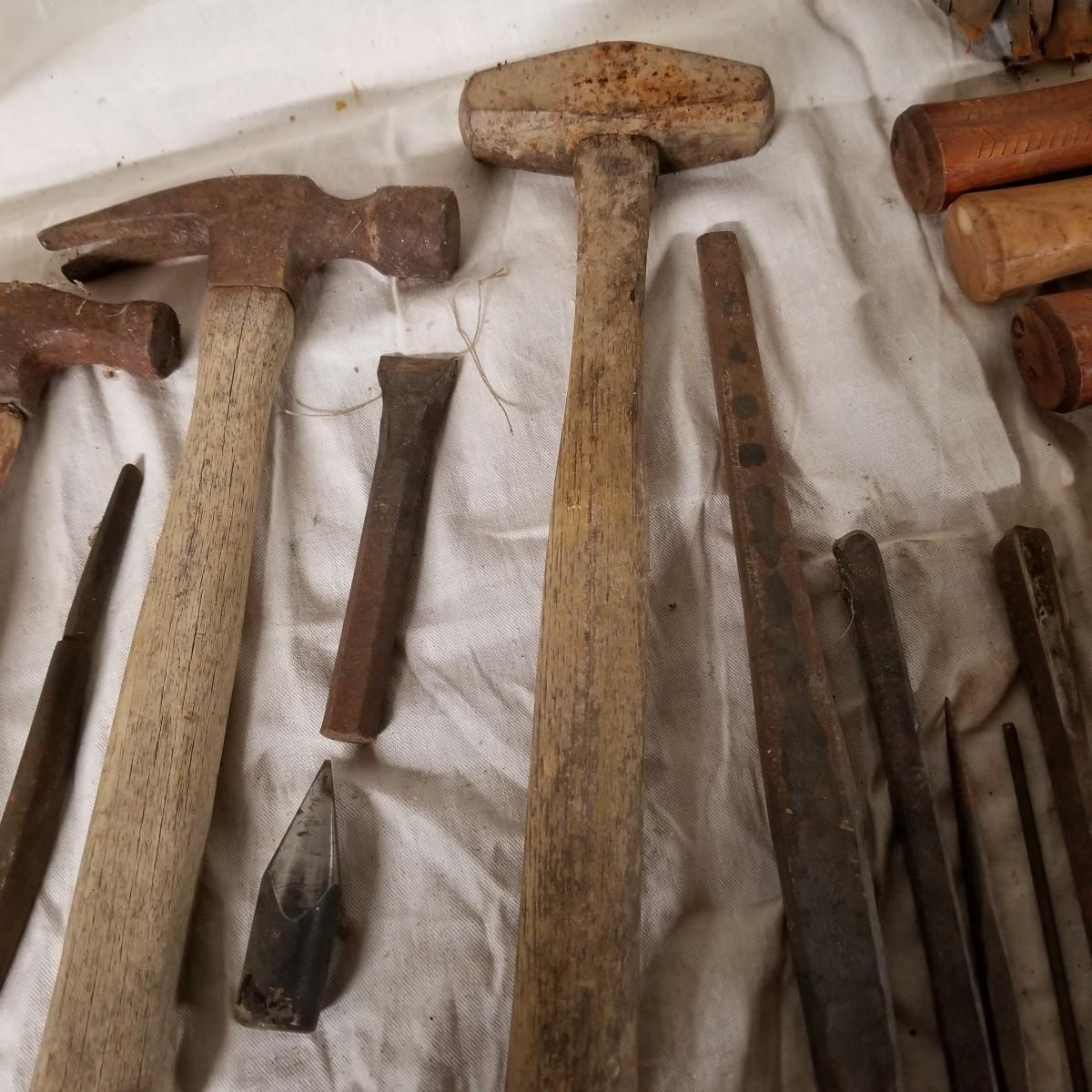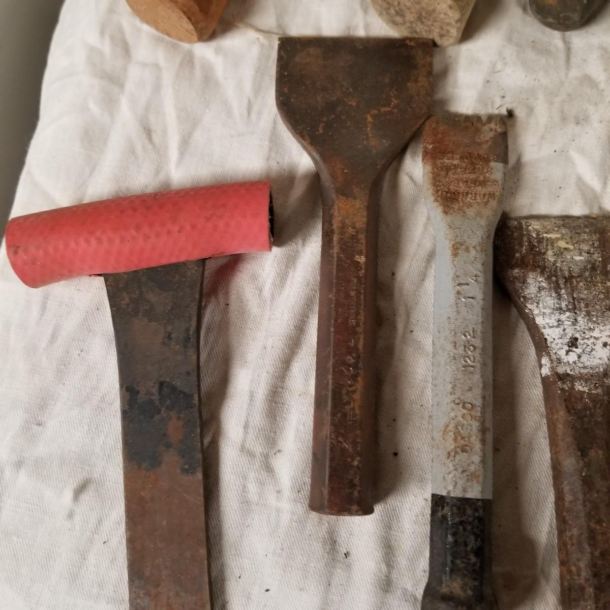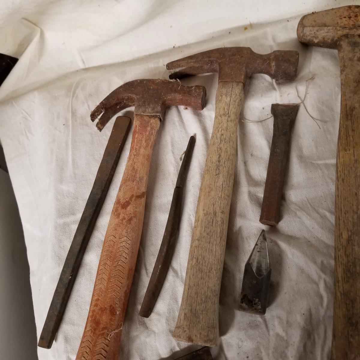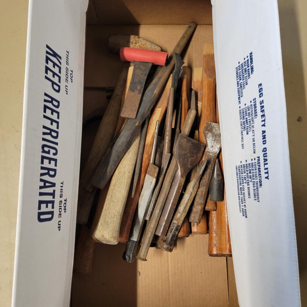 Hammers, hammer handles, chisels.  Seven Craftsman wood handles, various cold chisels, drifts, punches.  Brick chisels, star drill. Longest item is 16 1/2".  All items show some wear and tear.  Local pickup only.