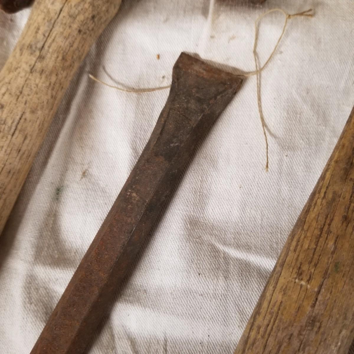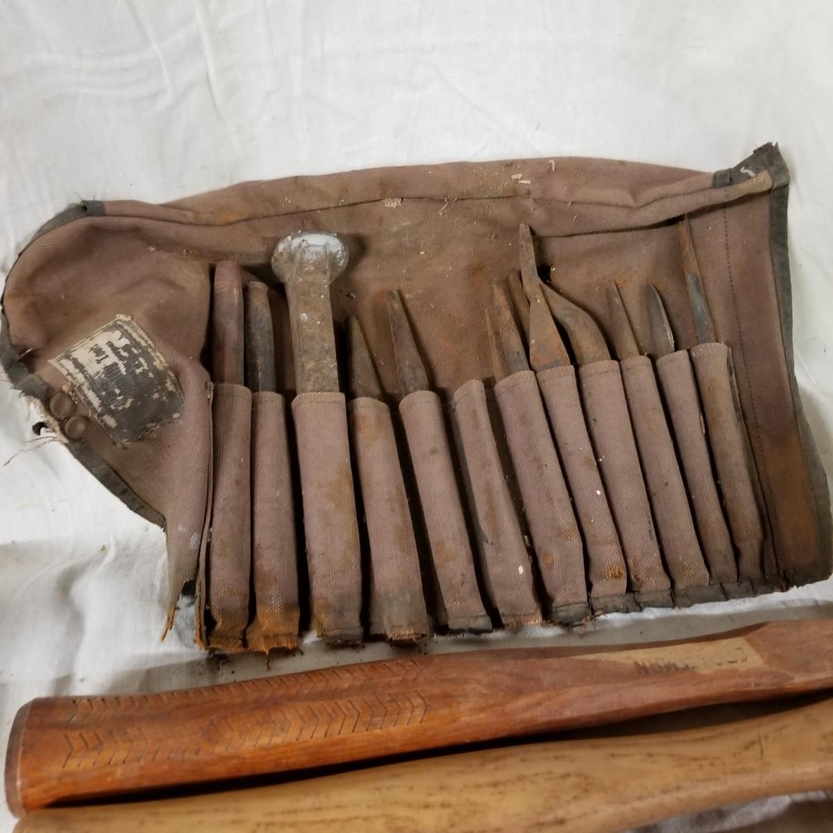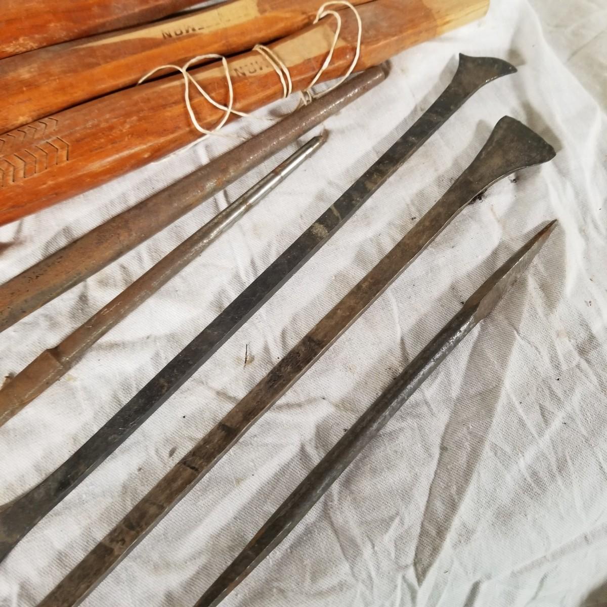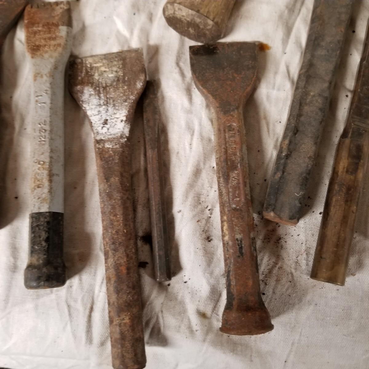 Hammers, hammer handles, chisels.  Seven Craftsman wood handles, various cold chisels, drifts, punches.  Brick chisels, star drill. Longest item is 16 1/2".  All items show some wear and tear.  Local pickup only.