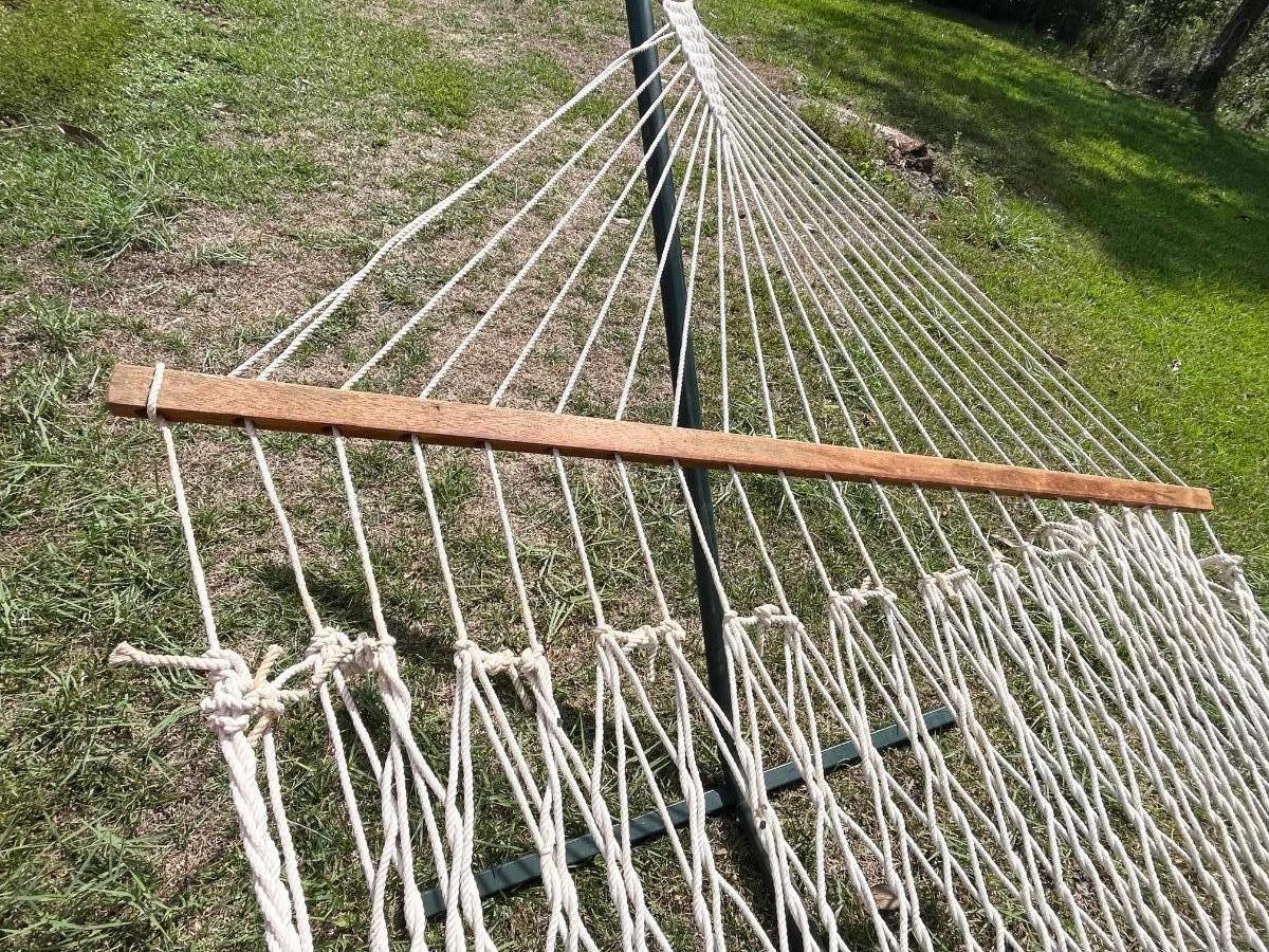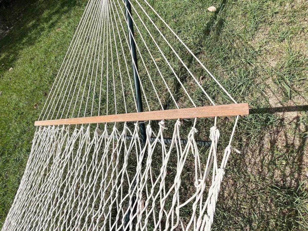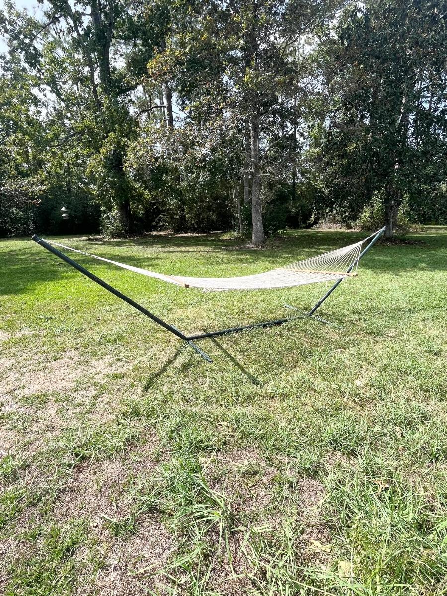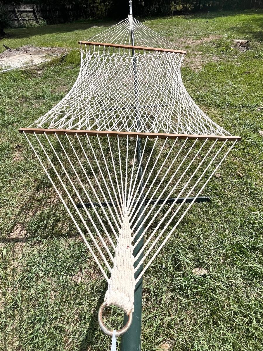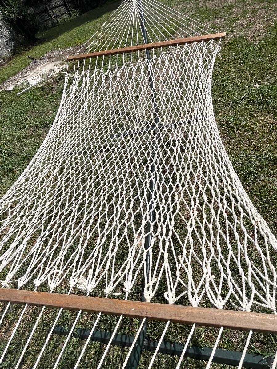 *You will need to purchase chains and hooks to attach the hammock to the frame ~ from post to post = 192” & from ring to ring on hammock = 150” ~ Frame comes apart into 3 separate pieces