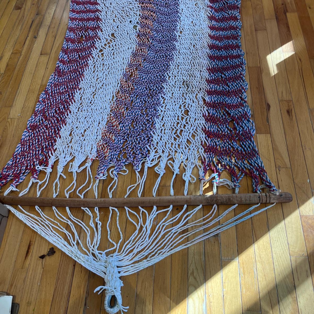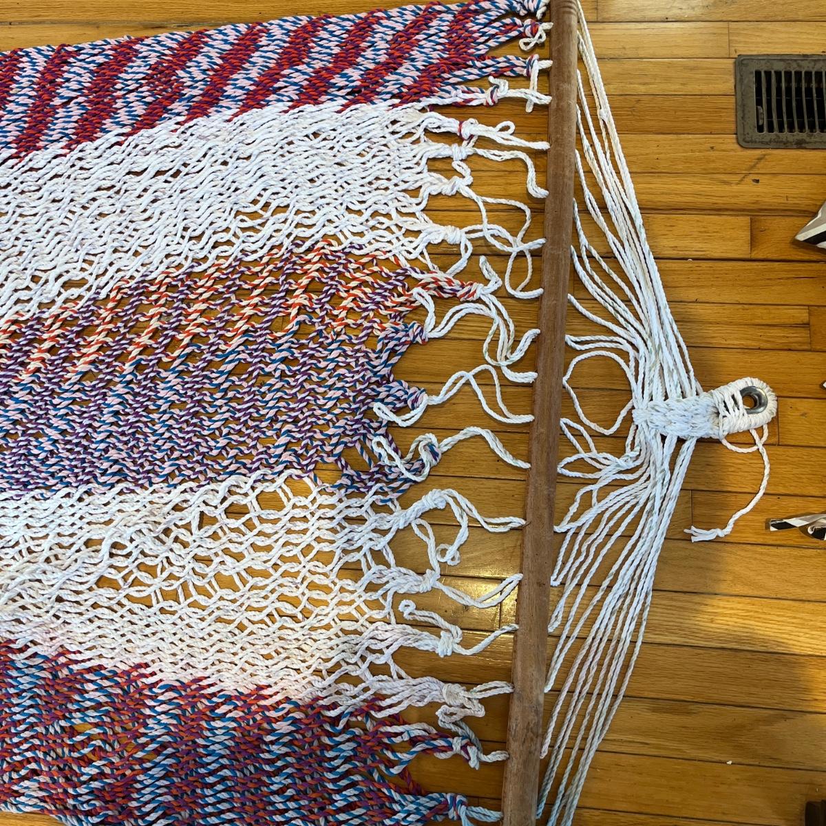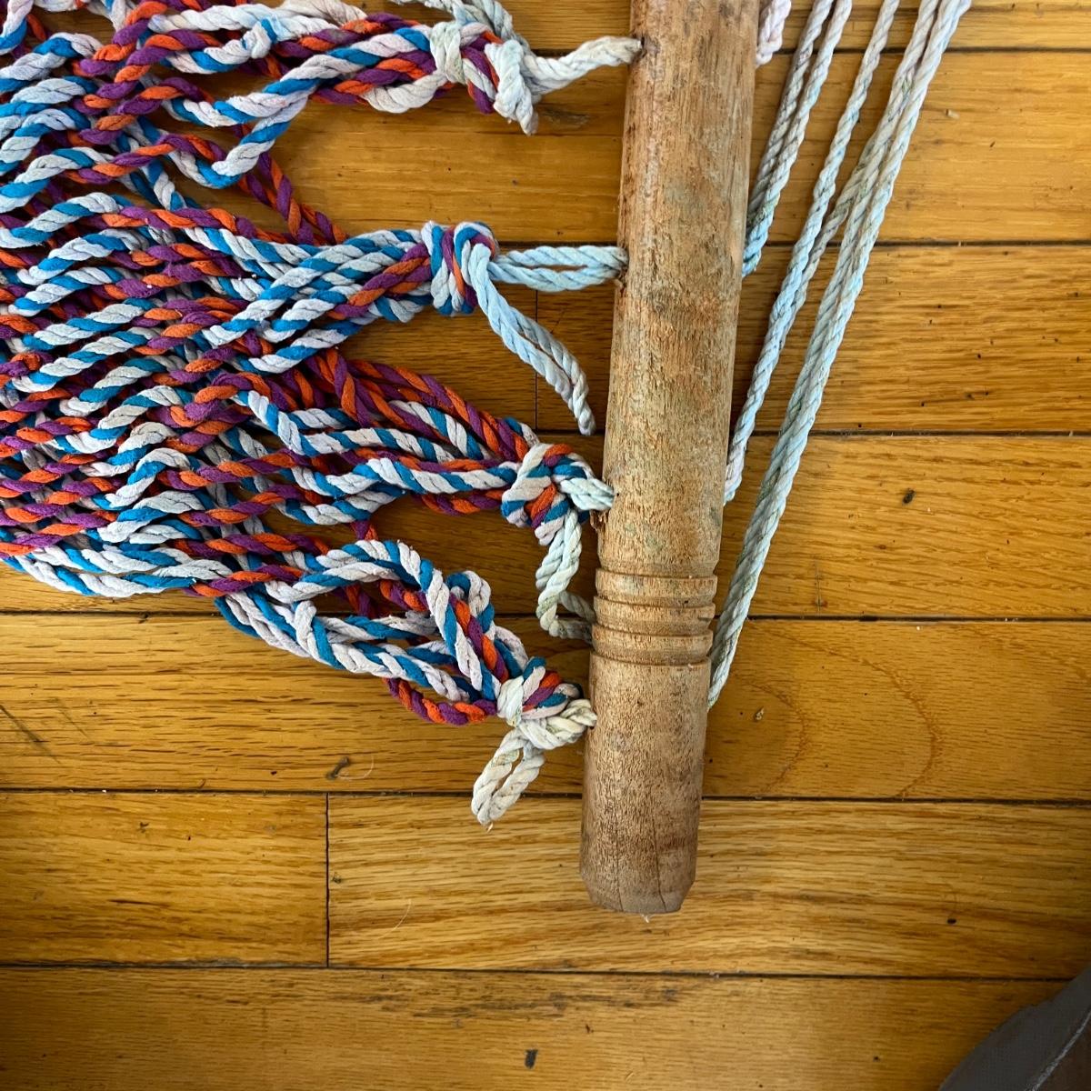 Lot includes a rope hammock with wood spreader bars that measures 49” x 102” long. Hammock has some stains, see pictures.
