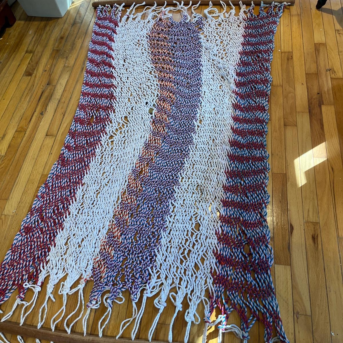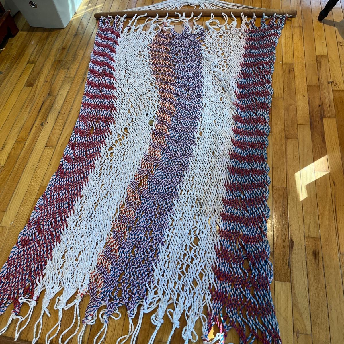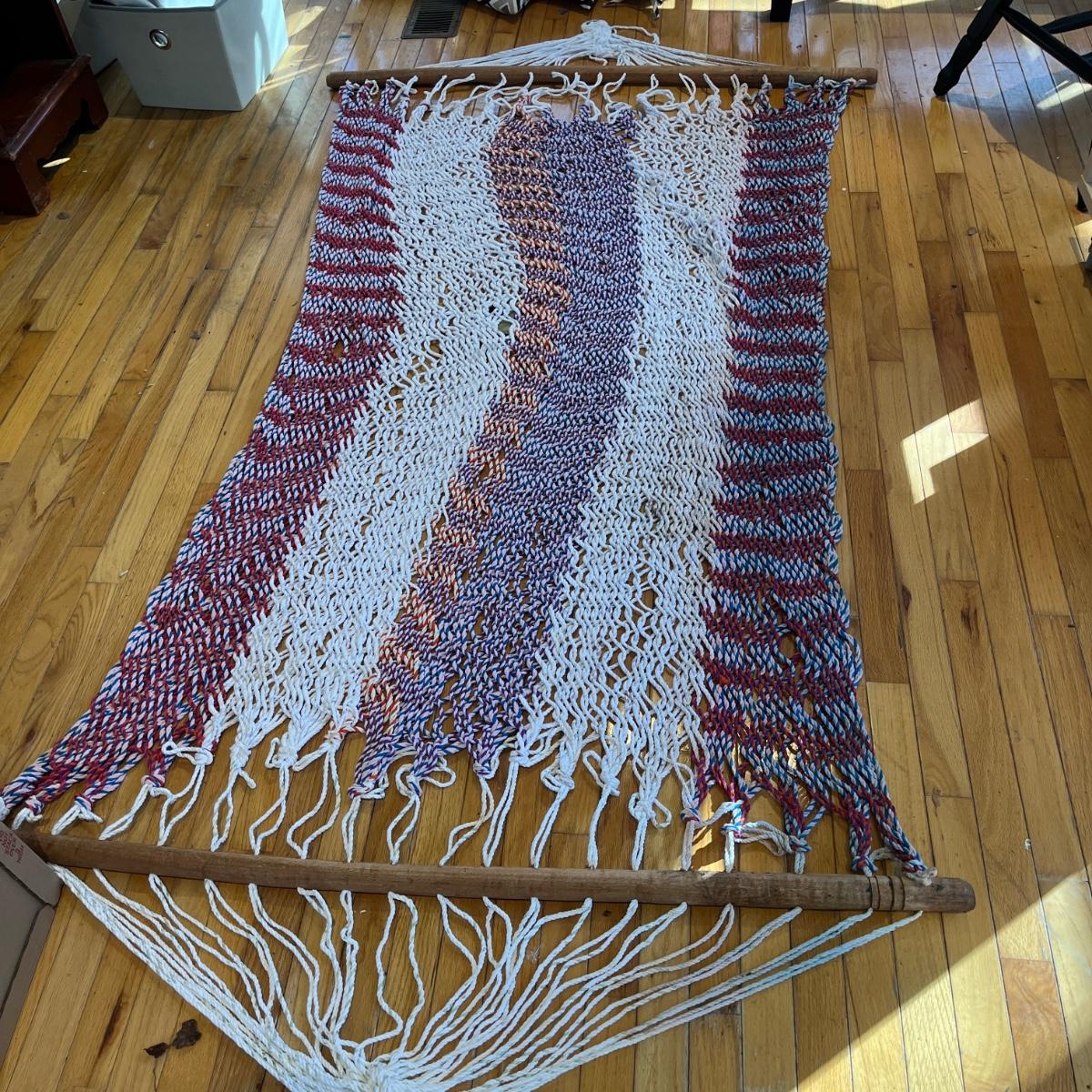 Lot includes a rope hammock with wood spreader bars that measures 49” x 102” long. Hammock has some stains, see pictures.