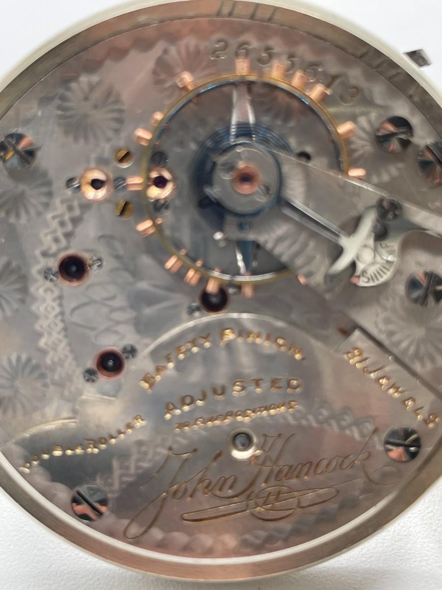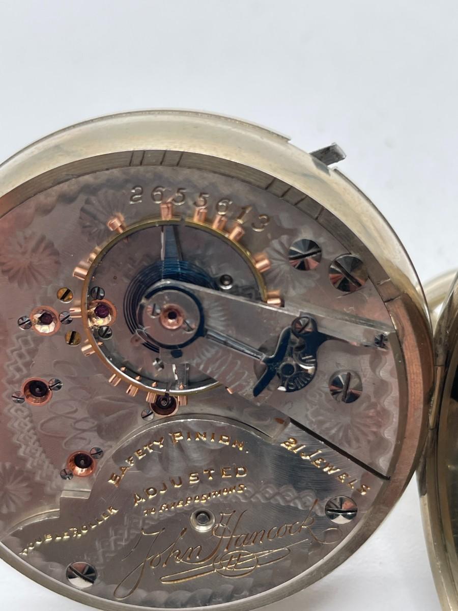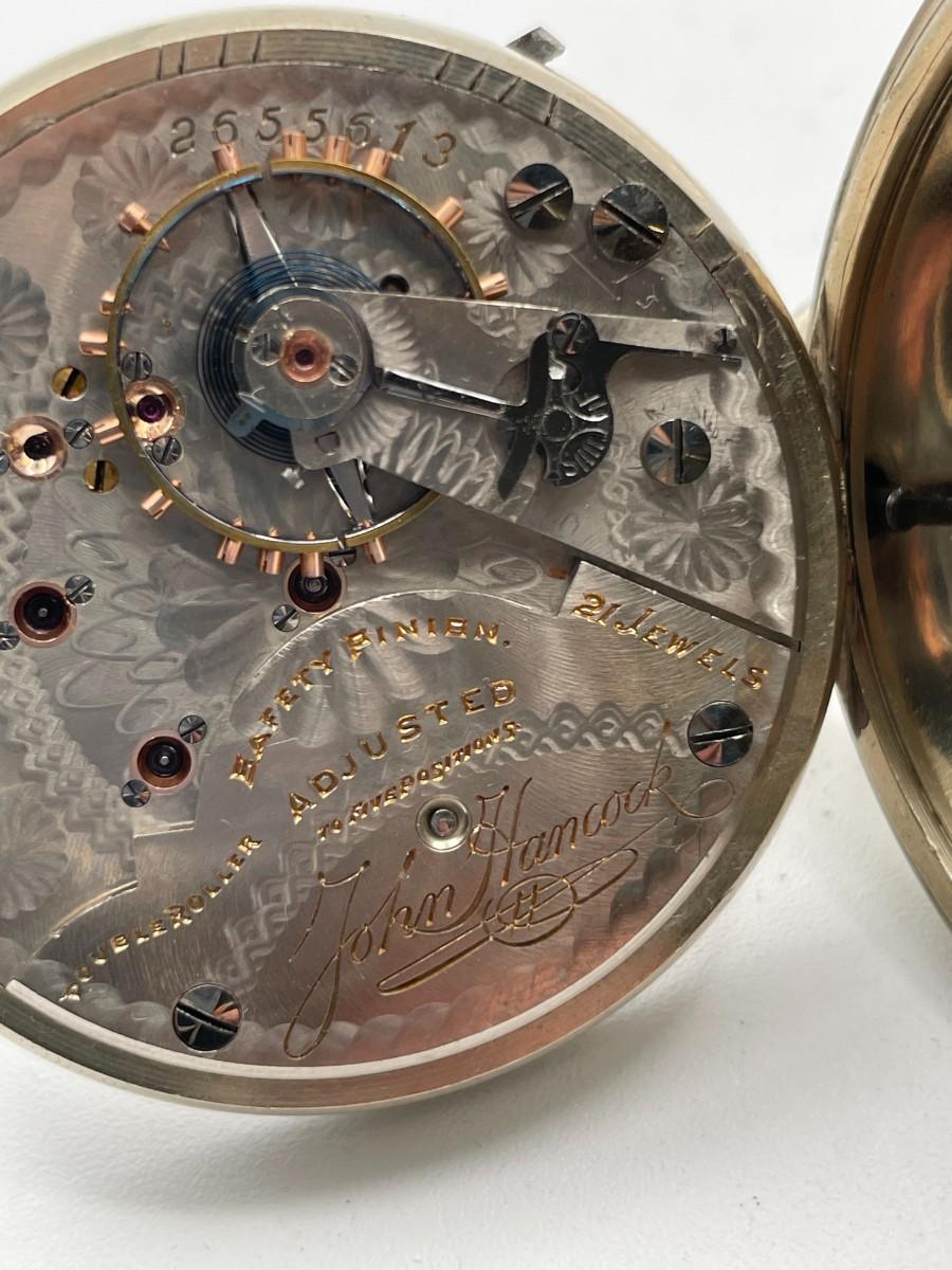 Hampden Watch Co. John Hancock, No. 2655613, Size 18s, Prod Yr. 1909, 21 Jewels. Case: Illinois Watch Co., No. 20274, Silver-Tone. Condition - Winder & watch are in working order. This is not a guarantee that all parts are original nor is the watch autheniticated.