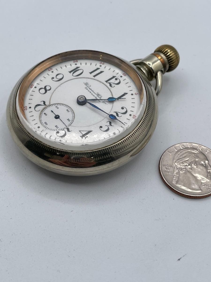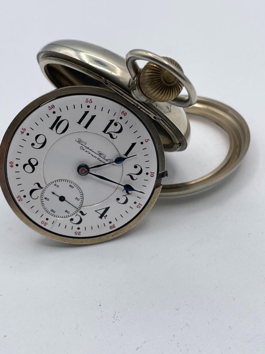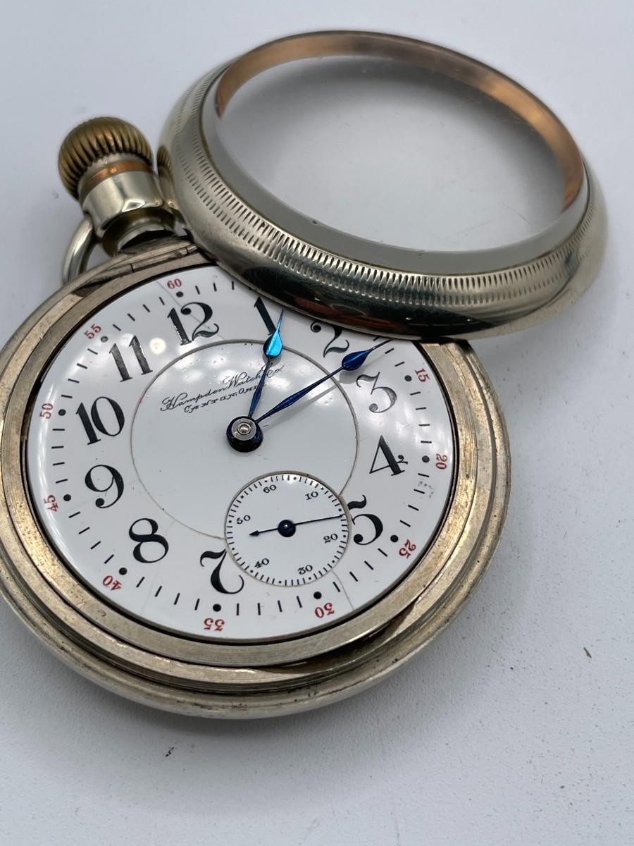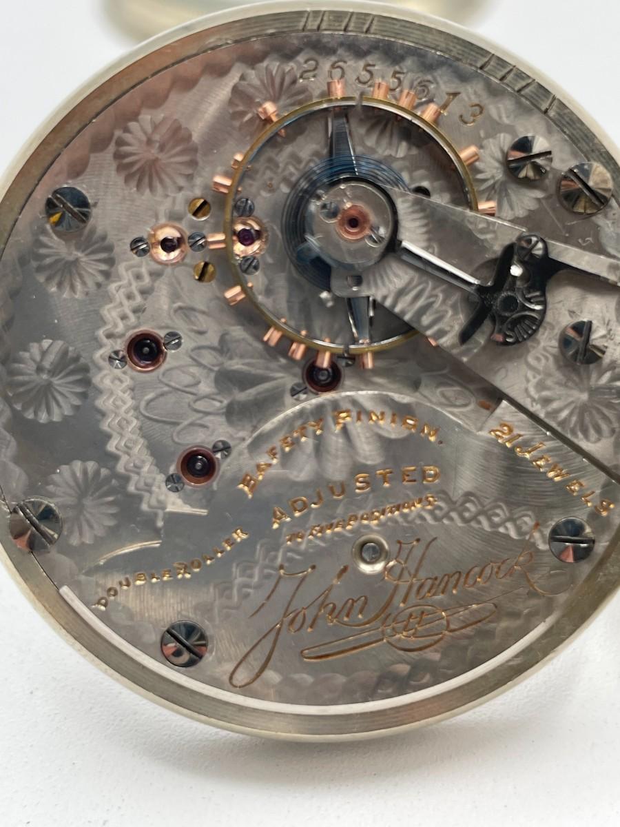 Hampden Watch Co. John Hancock, No. 2655613, Size 18s, Prod Yr. 1909, 21 Jewels. Case: Illinois Watch Co., No. 20274, Silver-Tone. Condition - Winder & watch are in working order. This is not a guarantee that all parts are original nor is the watch autheniticated.