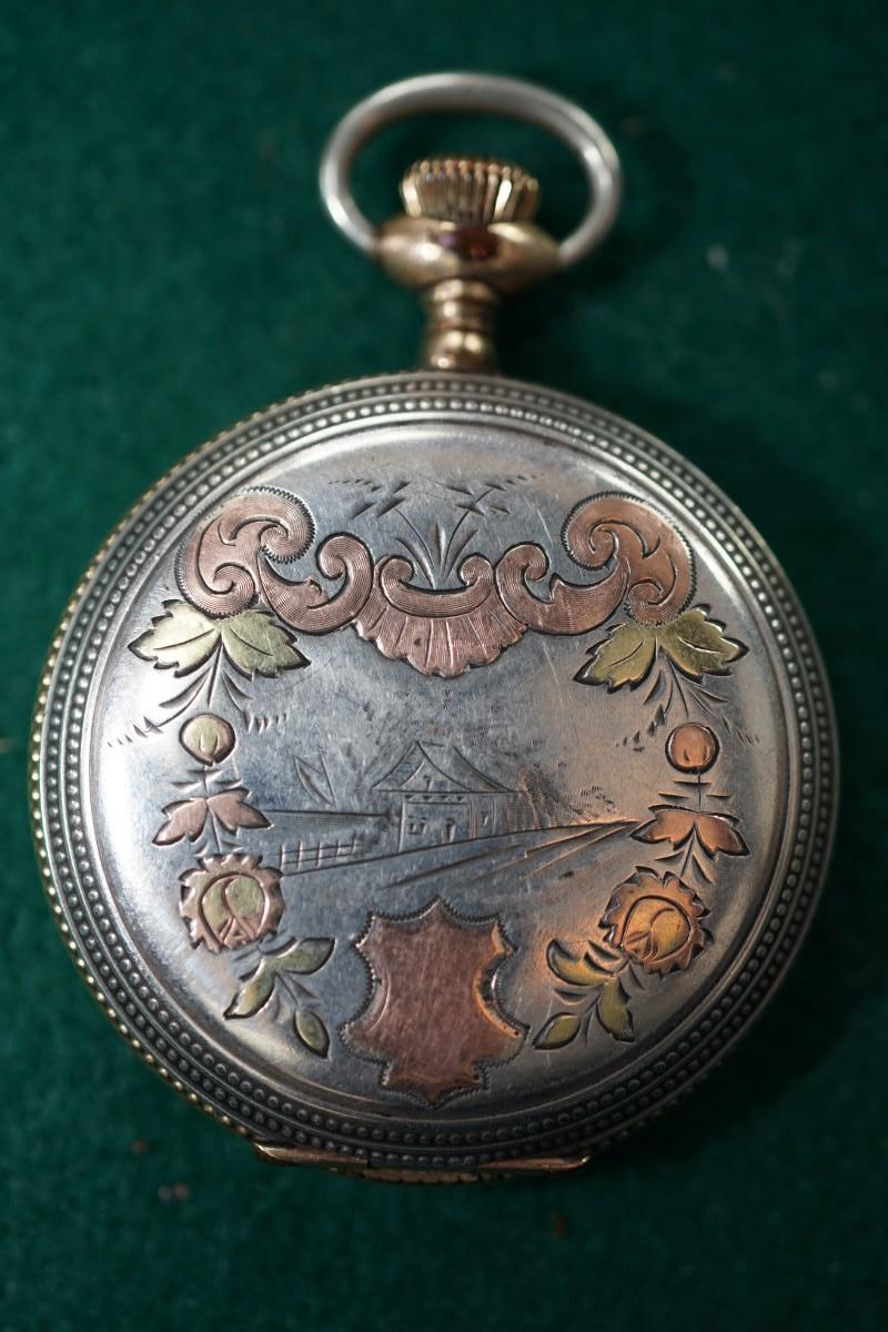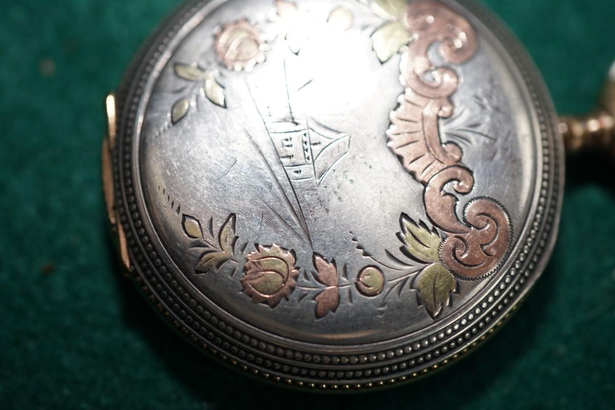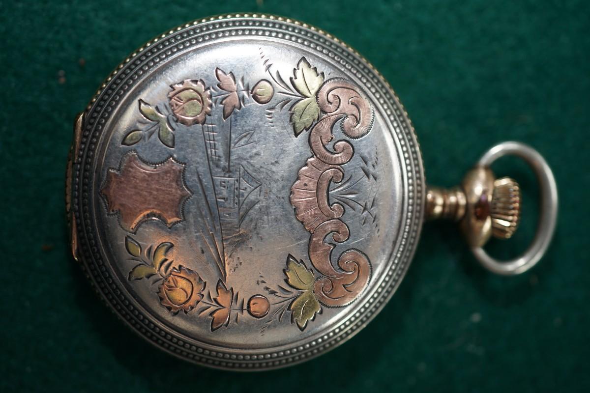 HAMPDEN POCKET WATCH STERLING CASE W/ROSE GOLDAND BRASS INLAYS HUNTERS CASE