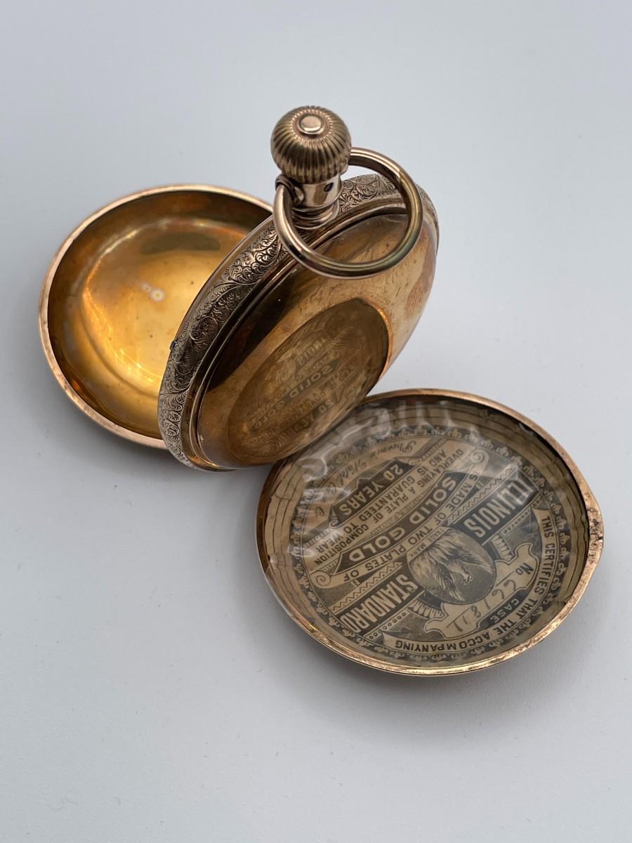 Hampden Pocketwatch - Gold Tone - 17 Jewels, Watch number (909980) - Size 18S - with Gold Filled Illinois Holder (66181). Condition - Winder & watch are in working order. This is not a guarantee that all parts are original nor is the watch autheniticated. Estimated Value $165 - $200. Year 1909