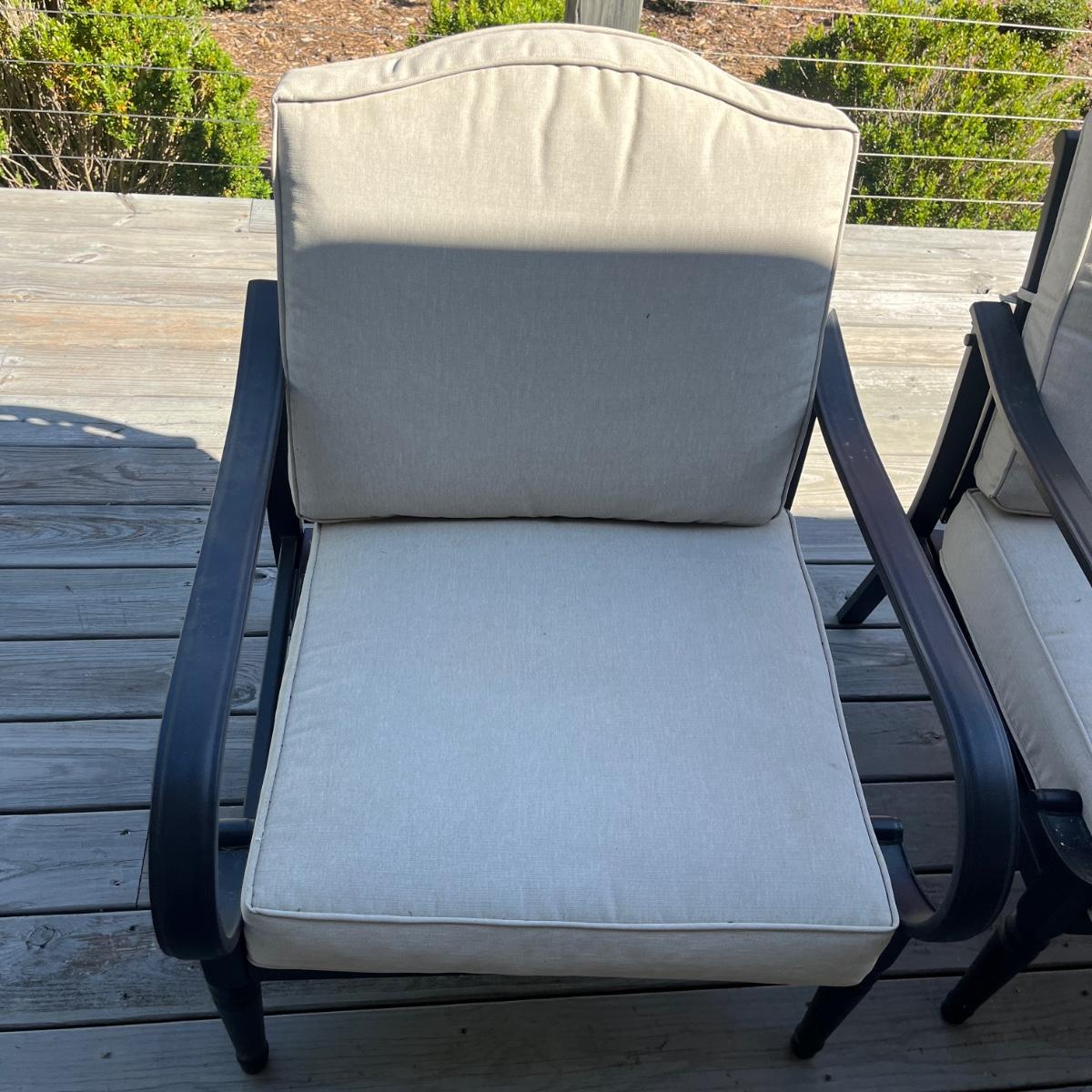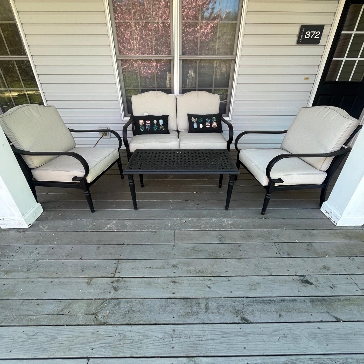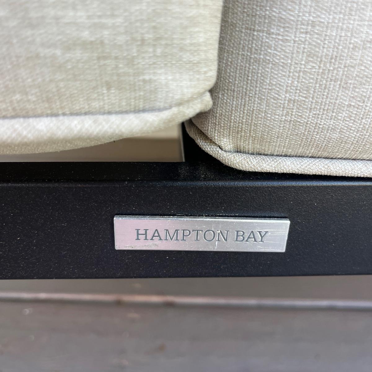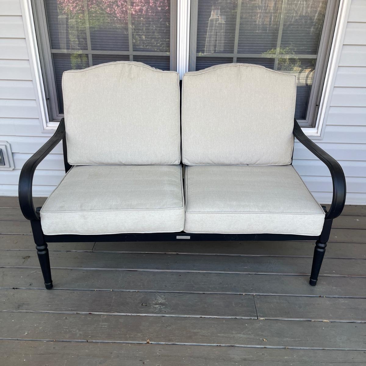 Lot contains an aluminum framed Hampton Bay four piece patio set that includes a loveseat with cushions, two chairs with cushion and a table. Loveseat measures 51” x 32” x 35”H with a 18” seat height and chairs measure 32” x 28” x 35”H with a 18” seat height. Cushions have some marks, see pictures.