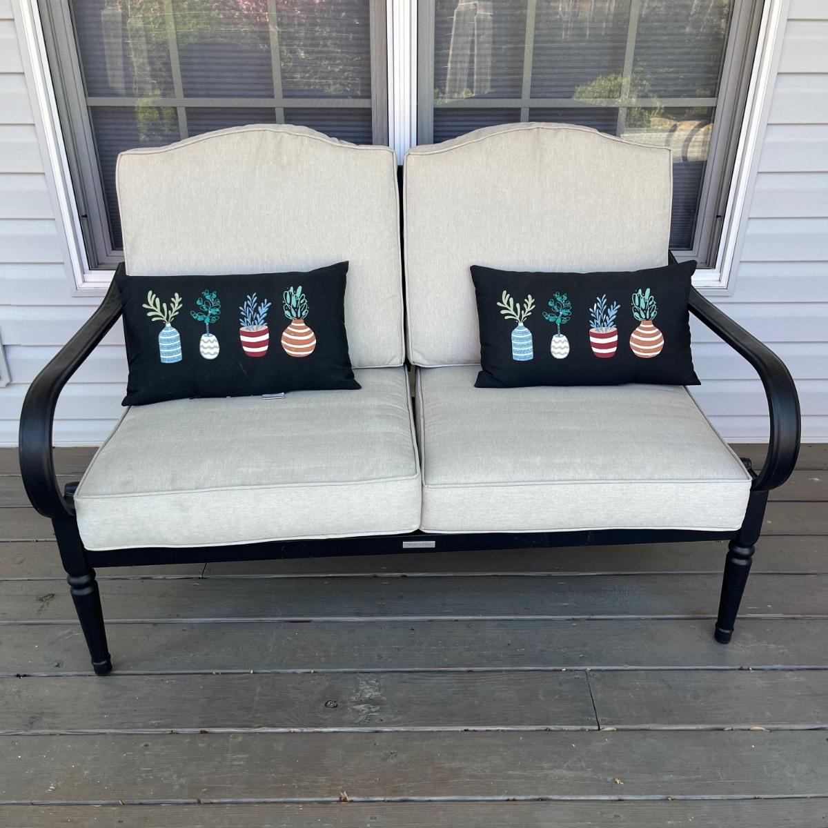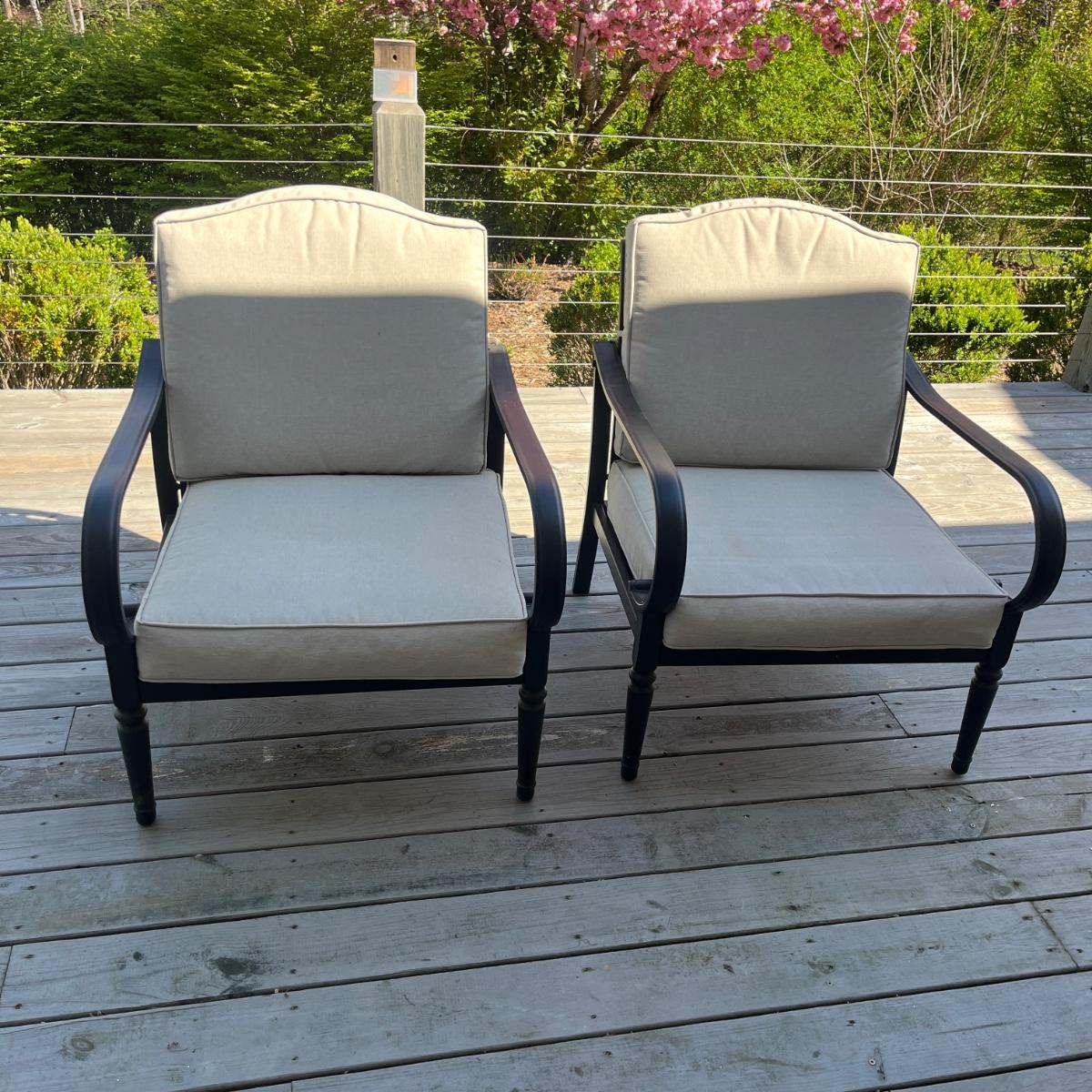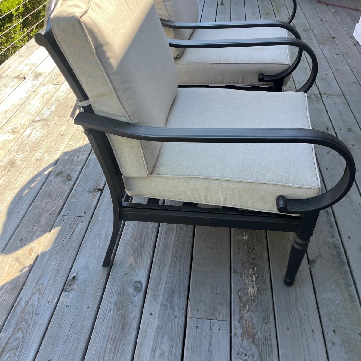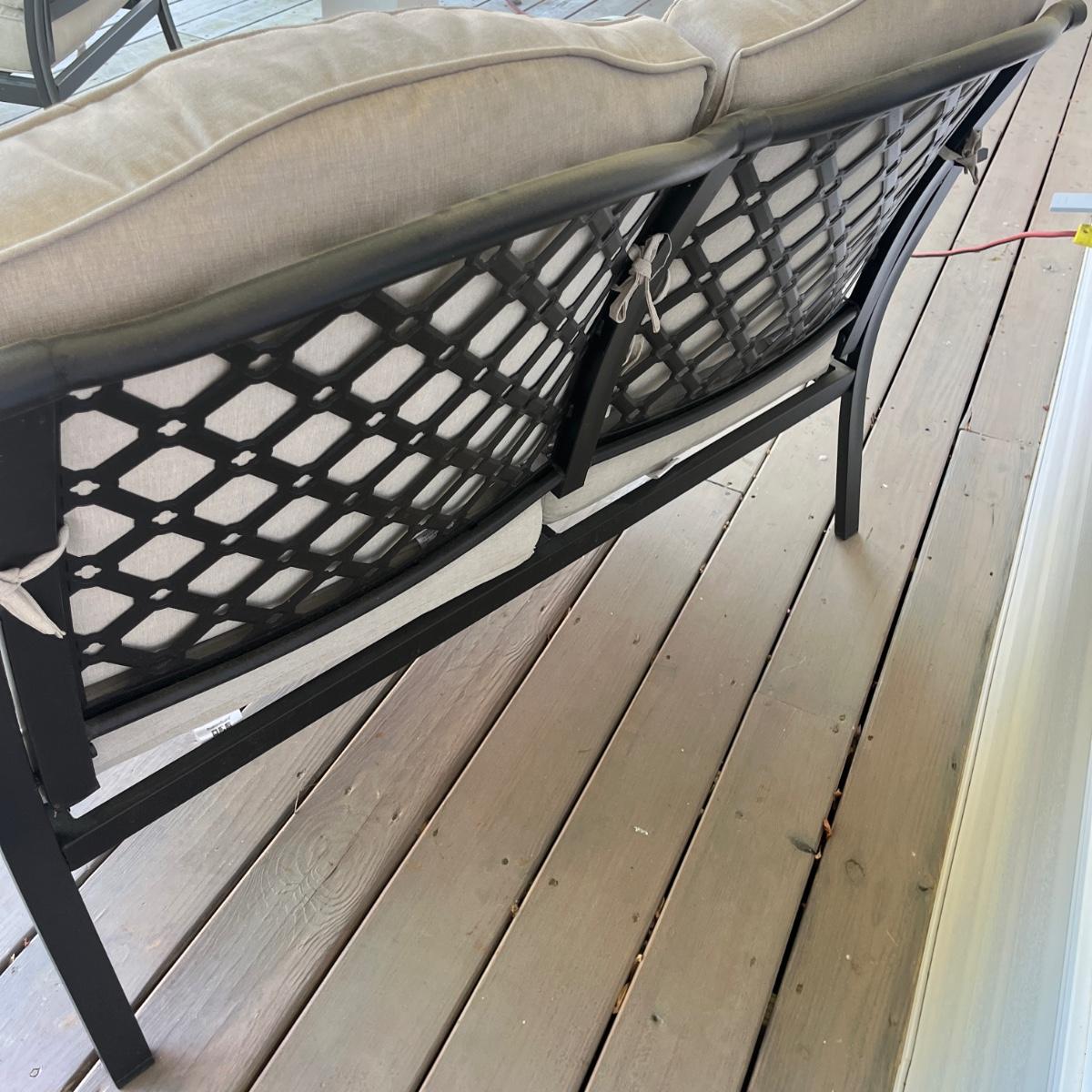 Lot contains an aluminum framed Hampton Bay four piece patio set that includes a loveseat with cushions, two chairs with cushion and a table. Loveseat measures 51” x 32” x 35”H with a 18” seat height and chairs measure 32” x 28” x 35”H with a 18” seat height. Cushions have some marks, see pictures.